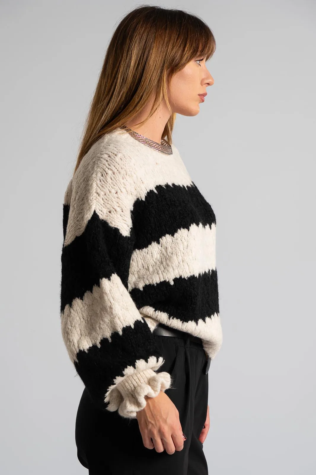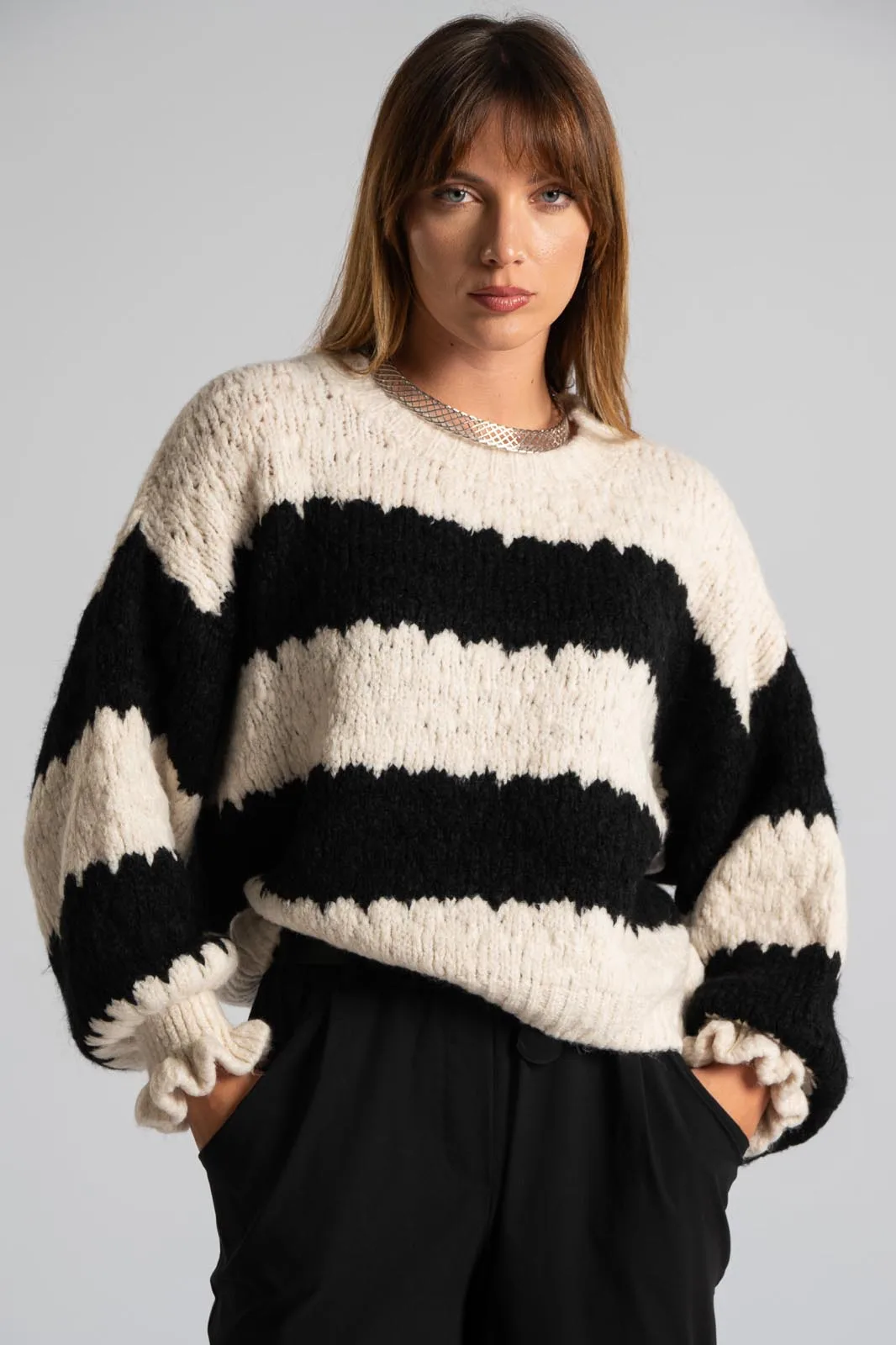 Thick knit sweater. It has a round neckline and long sleeves. It is striped and has a straight cut. The neckline and cuffs are finished with ribbed knit. The measurements in the table are representative for each code. 60% acrylic, 17% polyamide, 9% wool, 8% viscose.