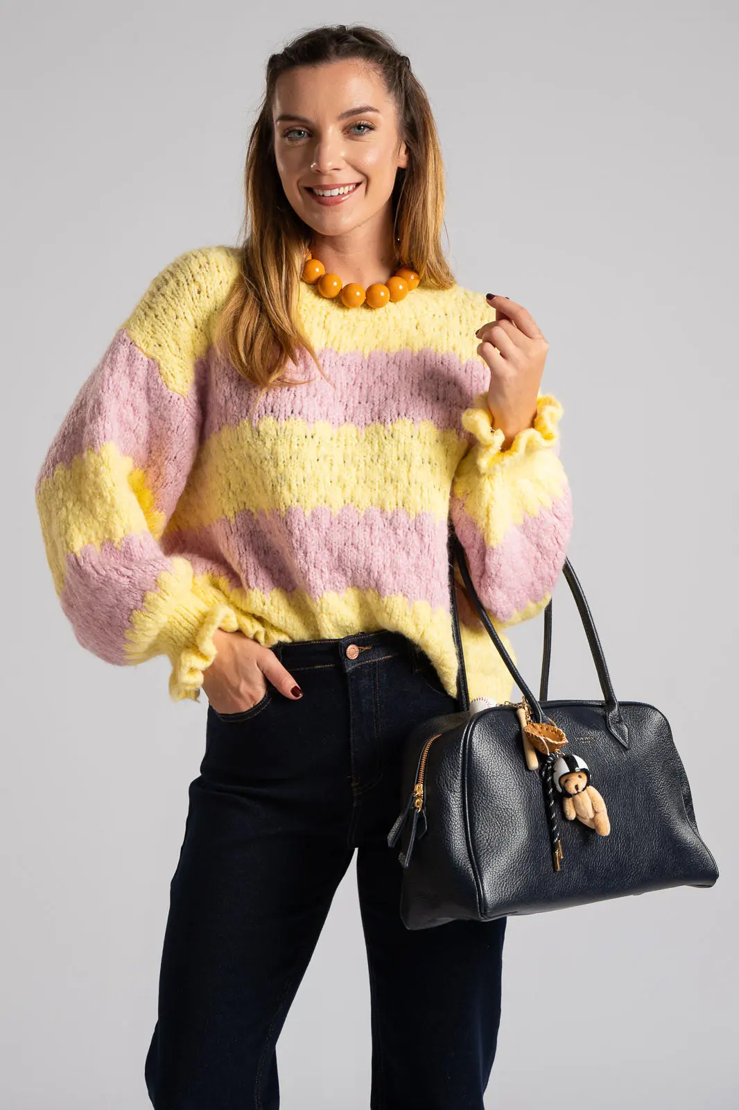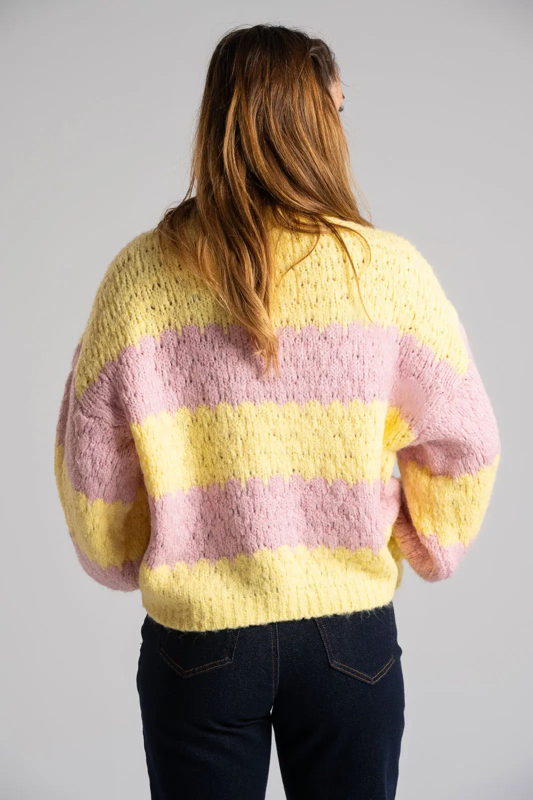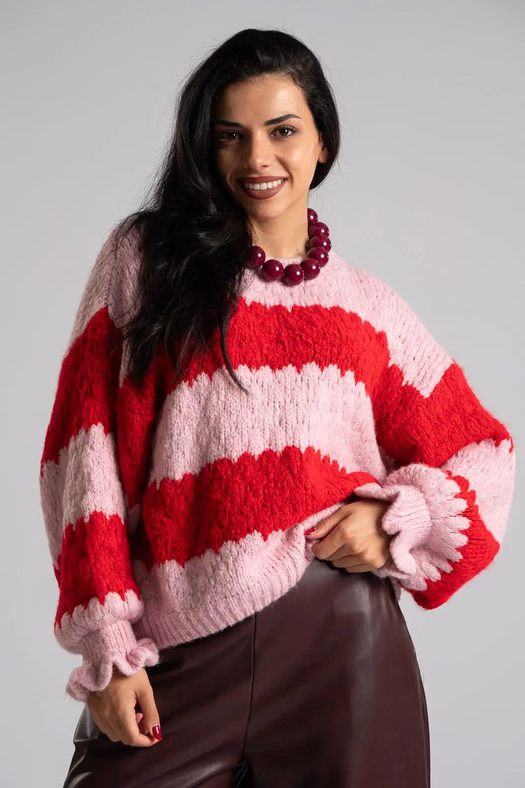 Thick knit sweater. It has a round neckline and long sleeves. It is striped and has a straight cut. The neckline and cuffs are finished with ribbed knit. The measurements in the table are representative for each code. 60% acrylic, 17% polyamide, 9% wool, 8% viscose.