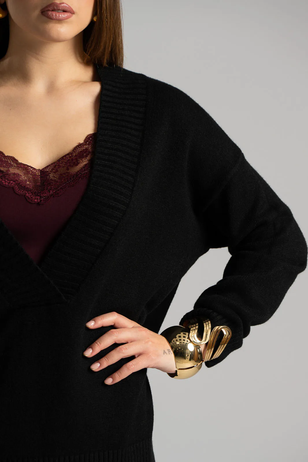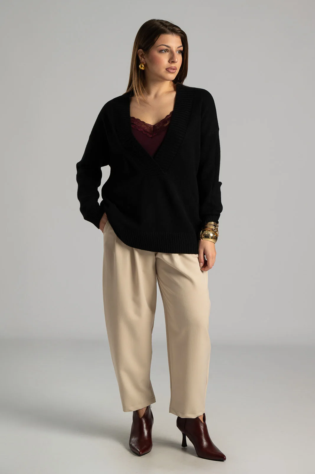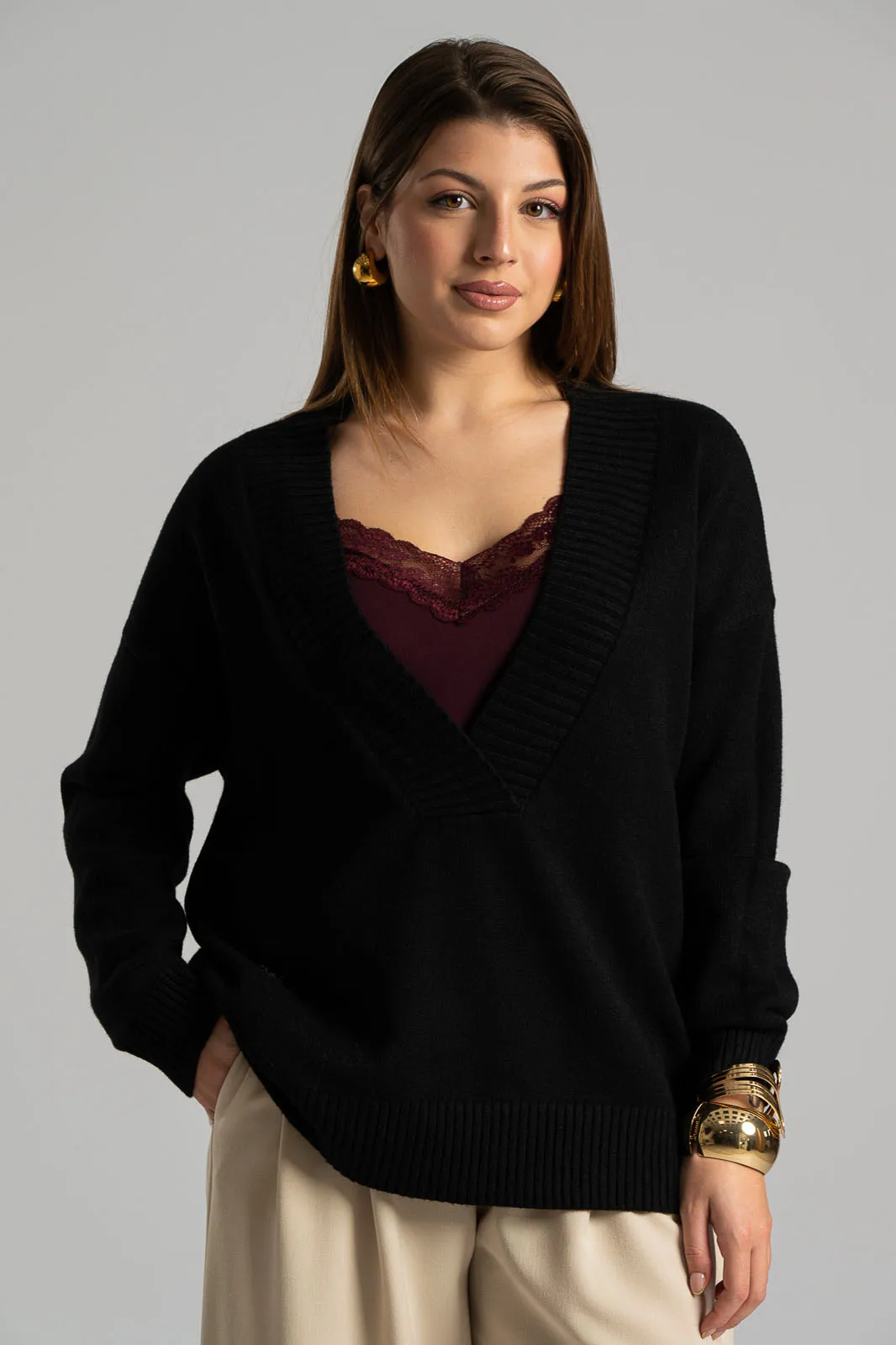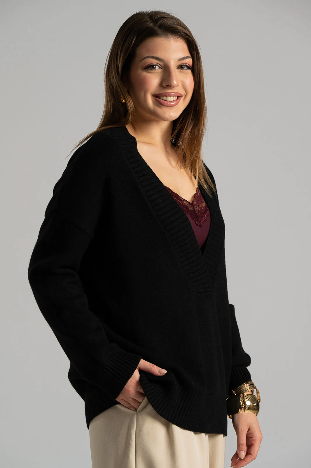 Sweater with compact yarn knitting. It has a V-neck and long sleeves. The neckline, hem, and cuffs feature ribbed knit. The measurements in the table are representative of each product. 35% polyamide, 35% viscose, 20% acrylic, 10% elastane.