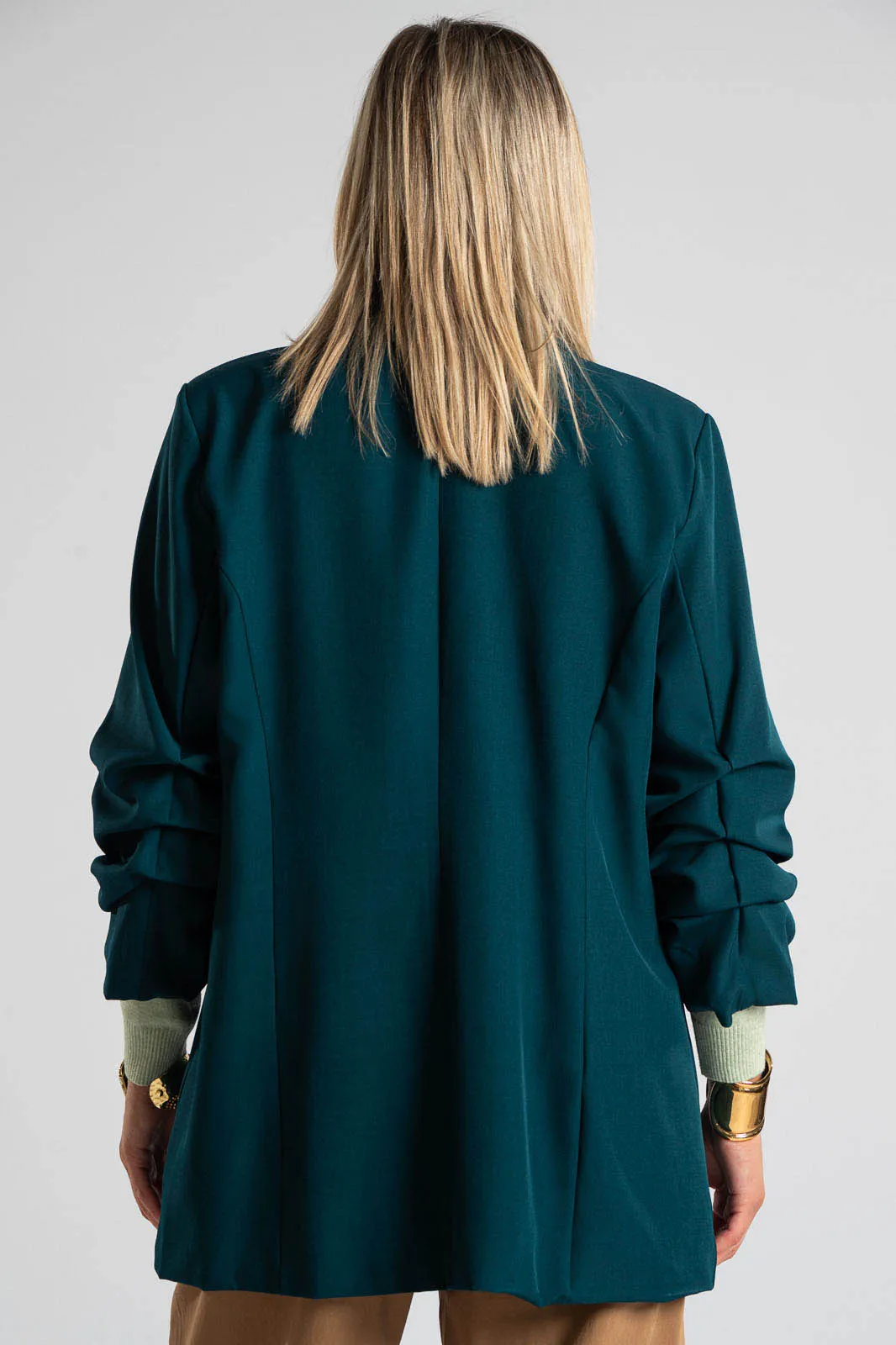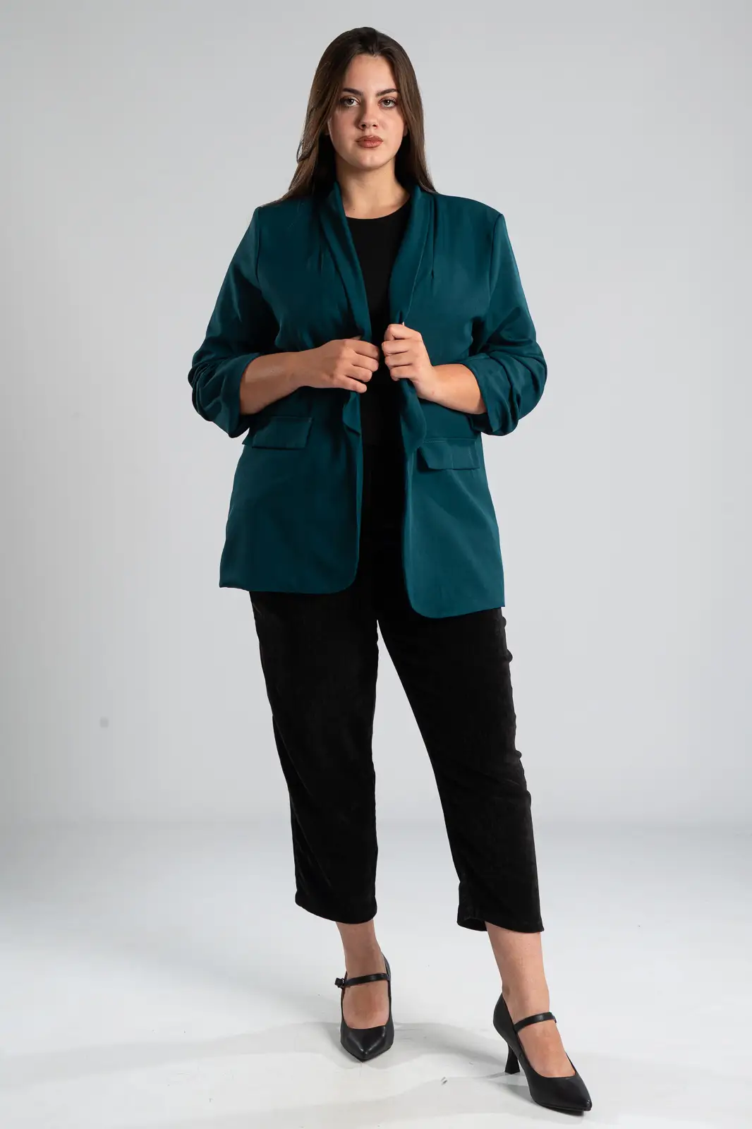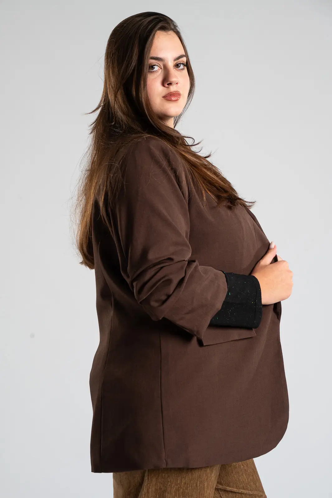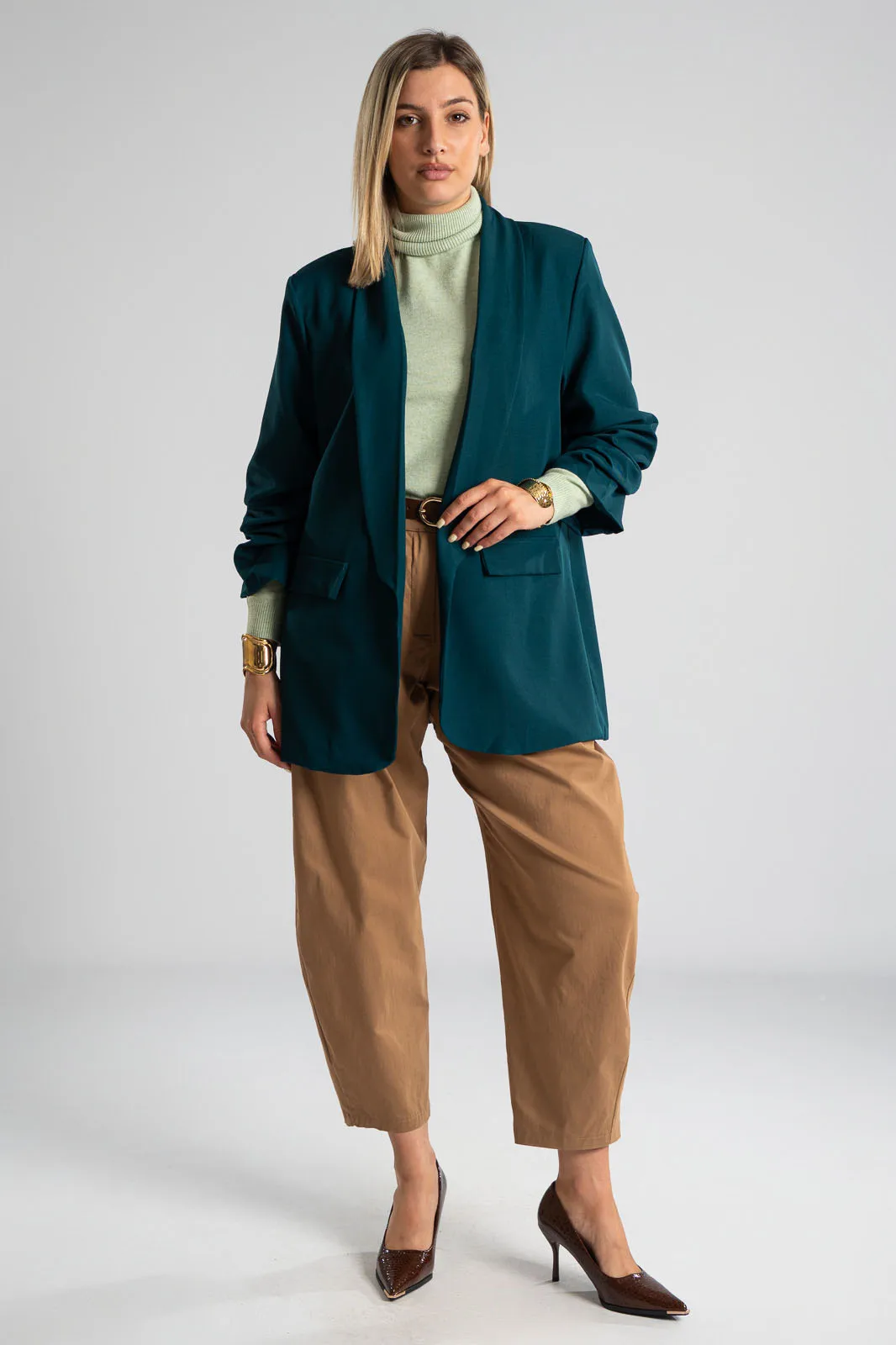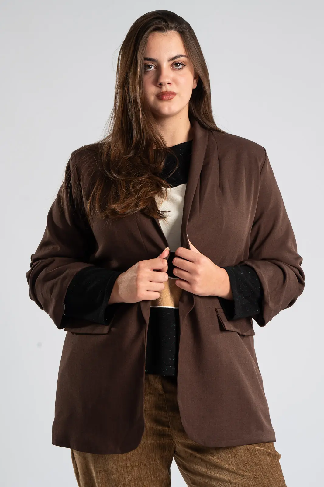 Jacket with long lapels. No buttons. It has faux pockets with flaps and shoulder pads. It is lined on the inside. The sleeves are 3/4 length and end in a cuff. The back measurement is taken from the back of the armpit to the armpit. The measurements in the table are representative for each code. 95% polyester, 5% elastane.