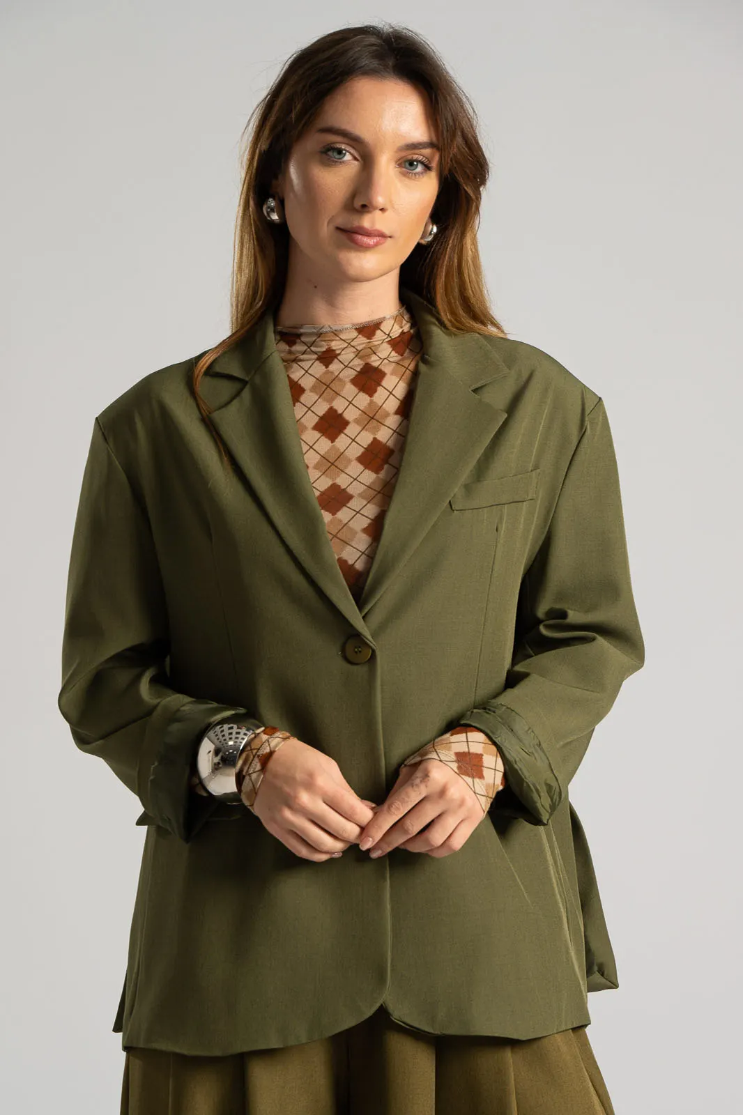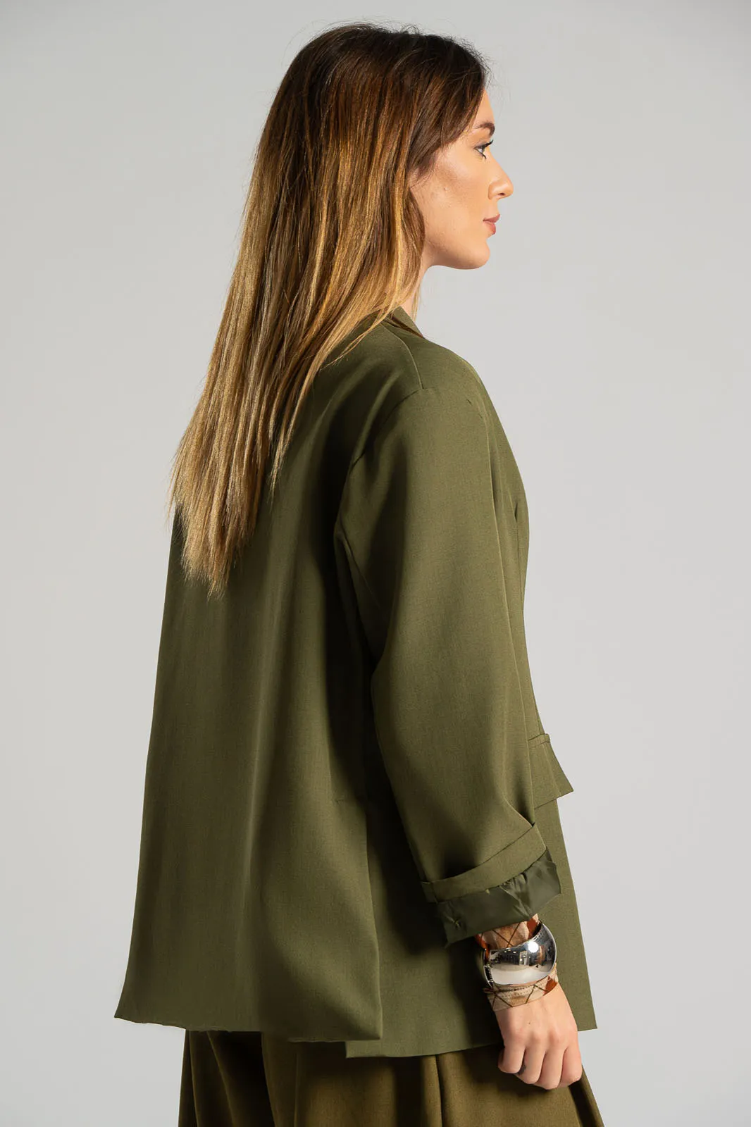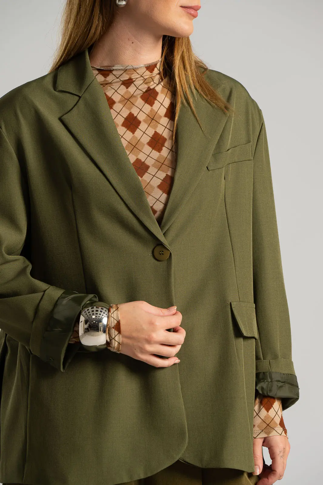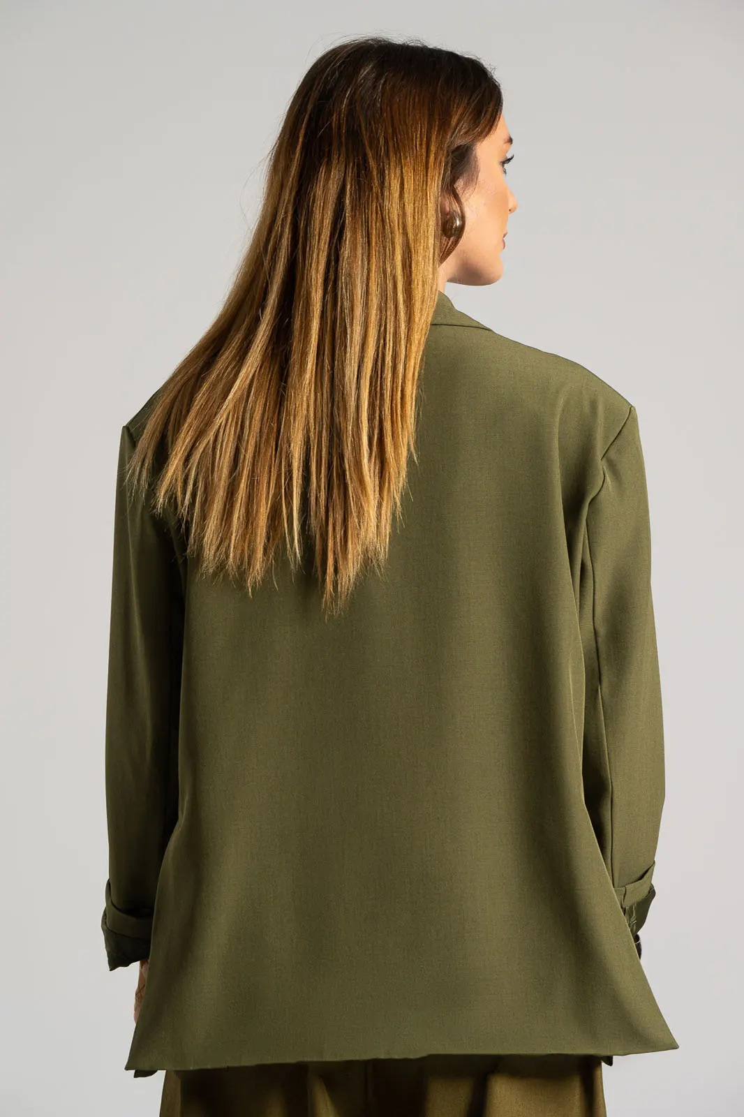 Σακάκι με γιακά και πέτο. Κλείνει με  κουμπί και εσωτερικά είναι φοδραρισμένο. Έχει βάτες στους ώμους. Στο μπροστινό μέρος διαθέτει τσέπες εικονικές με καπάκι. Στο επάνω μέρος στο πλάι έχει εικονική τσέπη με ρέλι. H μέτρηση έχει γίνει με κλειστό το κουμπί. Οι μετρήσεις του πίνακα είναι αντιπροσωπευτικές για κάθε κωδικό. 100% polyester.