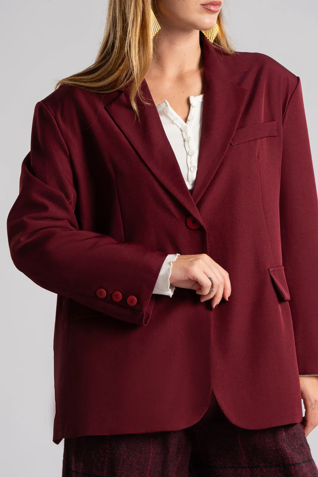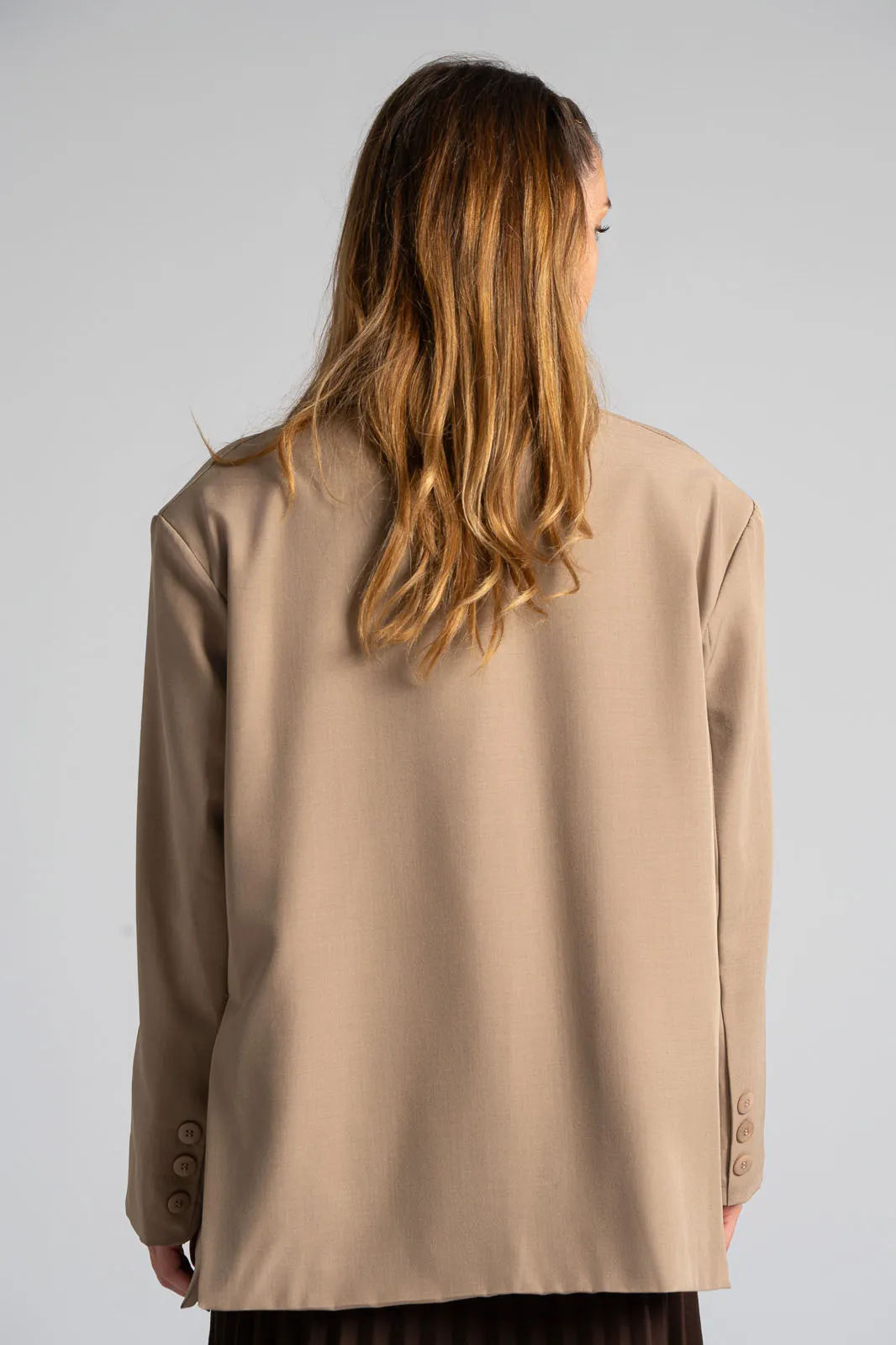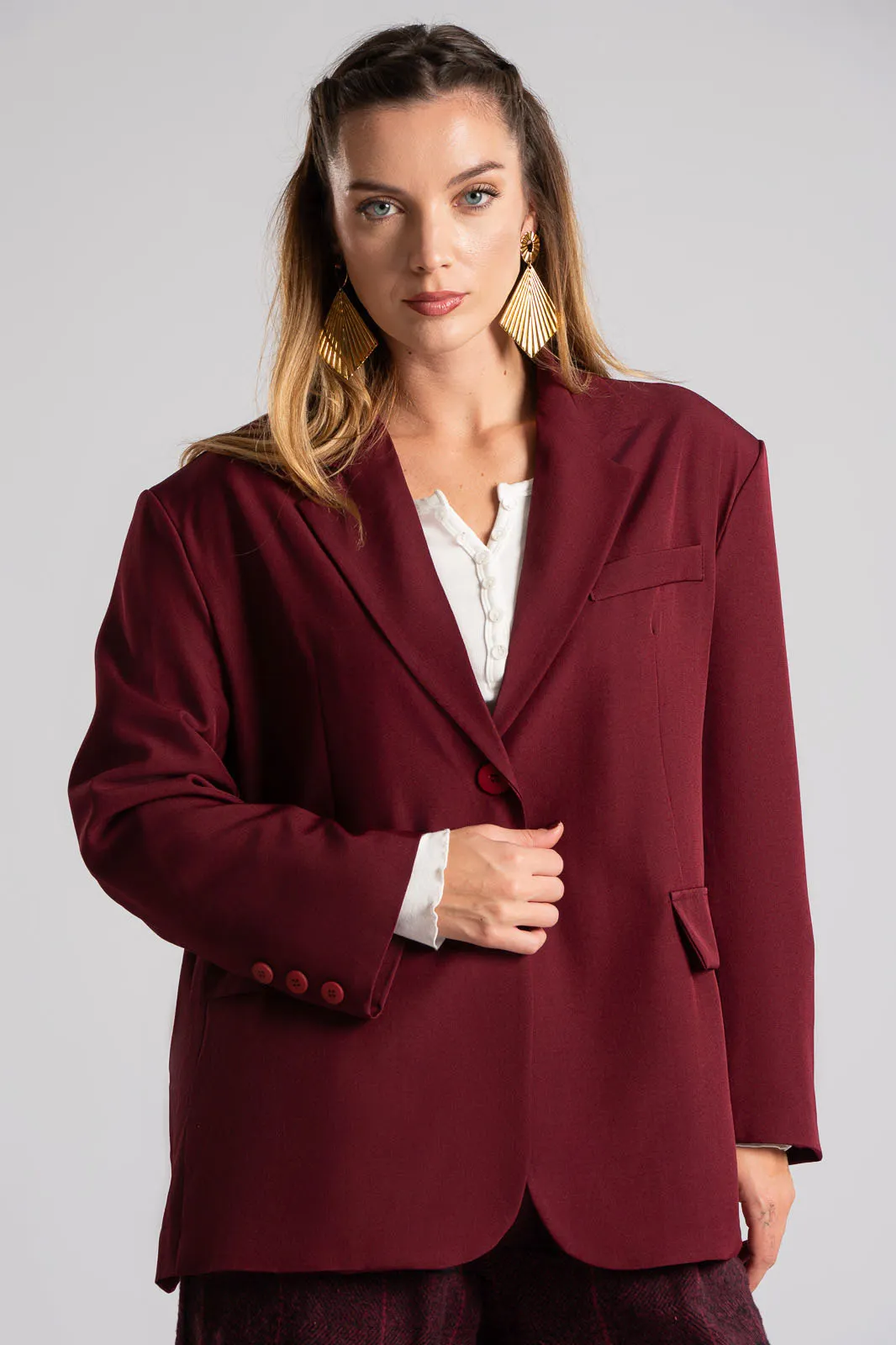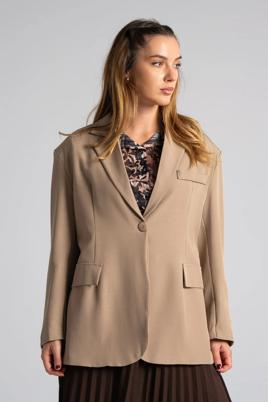 Σακάκι με γιακά και πέτο. Κλείνει με κουμπί και εσωτερικά είναι φοδραρισμένο. Έχει βάτες στους ώμους. Στο μπροστινό μέρος διαθέτει τσέπες εικονικές με καπάκι. Στο επάνω μέρος στο πλάι έχει εικονική τσέπη με ρέλι. H μέτρηση έχει γίνει με κλειστό το κουμπί. Οι μετρήσεις του πίνακα είναι αντιπροσωπευτικές για κάθε κωδικό. 100% polyester.