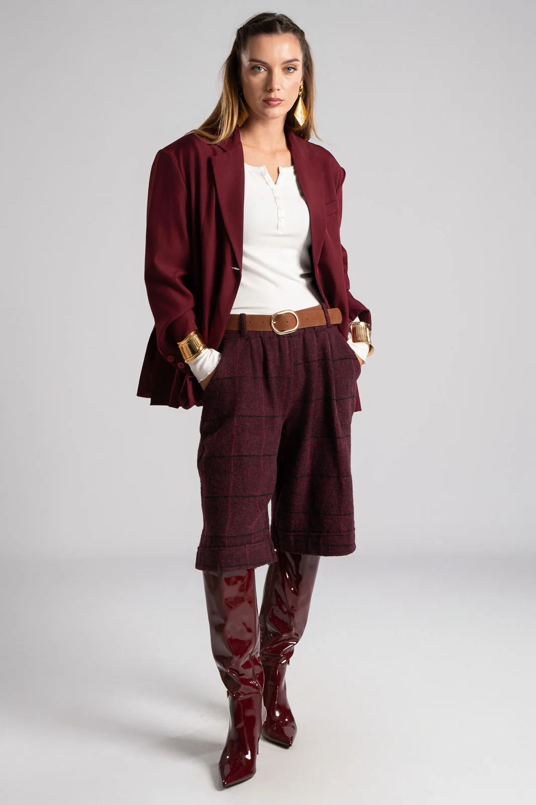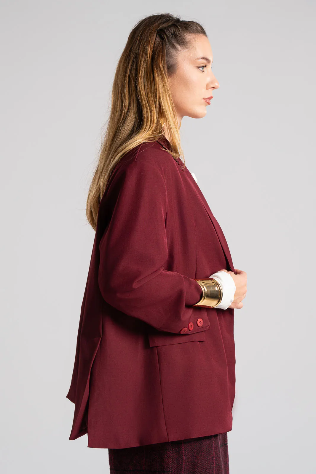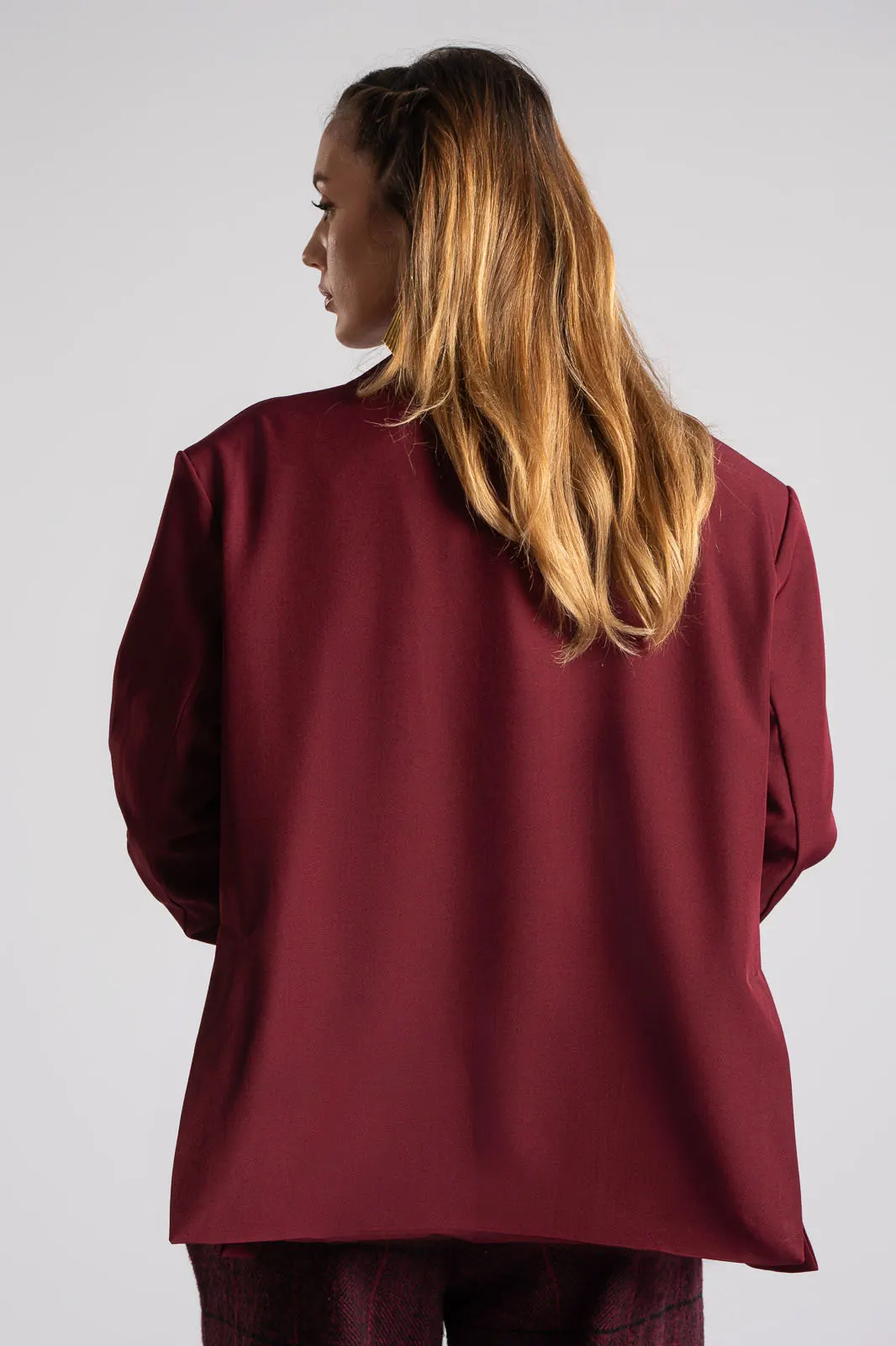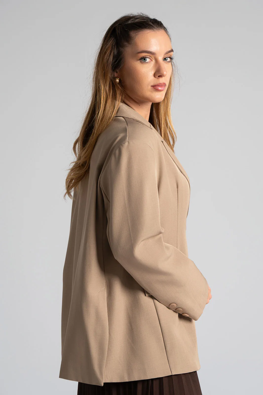 Σακάκι με γιακά και πέτο. Κλείνει με κουμπί και εσωτερικά είναι φοδραρισμένο. Έχει βάτες στους ώμους. Στο μπροστινό μέρος διαθέτει τσέπες εικονικές με καπάκι. Στο επάνω μέρος στο πλάι έχει εικονική τσέπη με ρέλι. H μέτρηση έχει γίνει με κλειστό το κουμπί. Οι μετρήσεις του πίνακα είναι αντιπροσωπευτικές για κάθε κωδικό. 100% polyester.