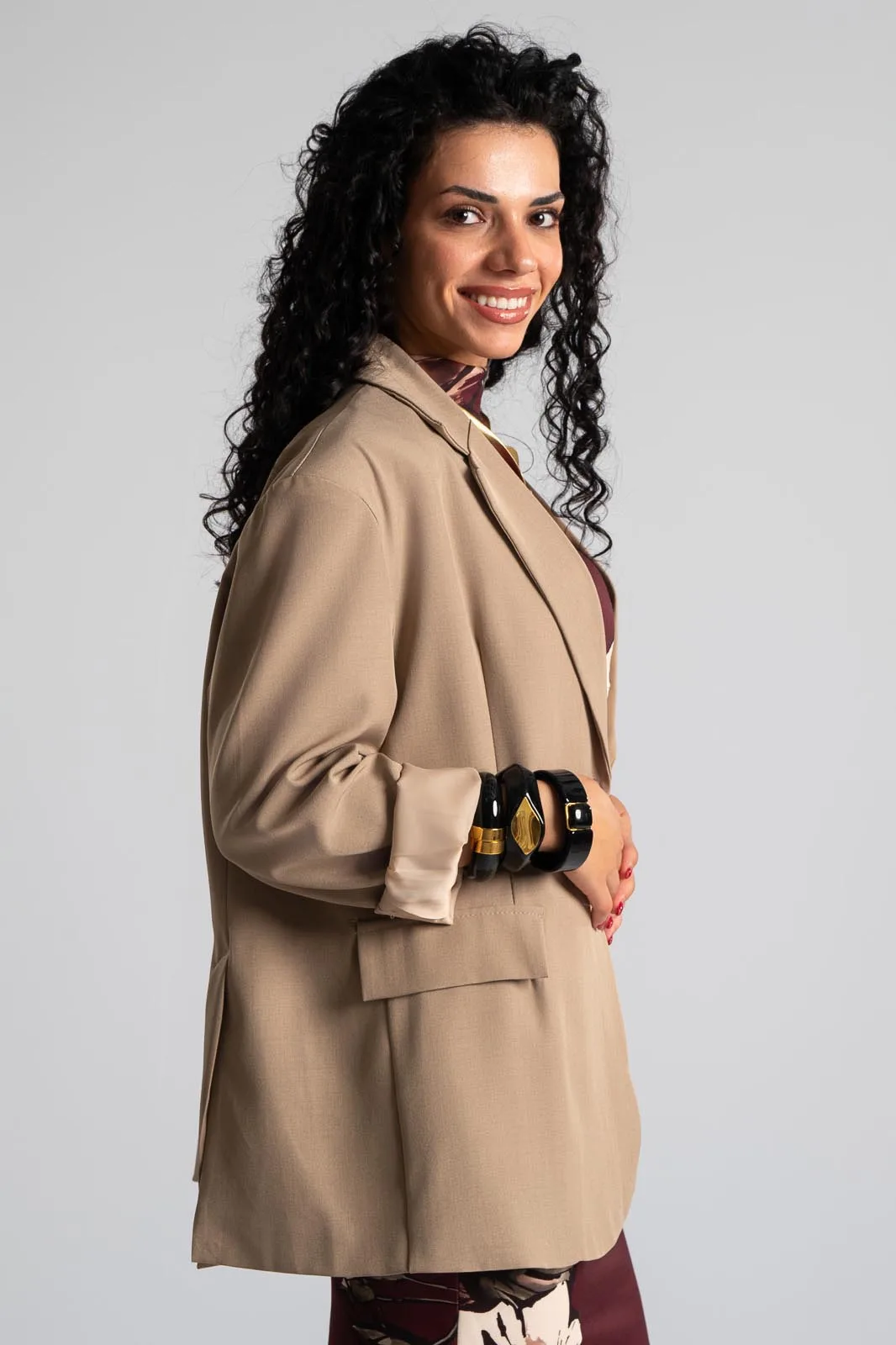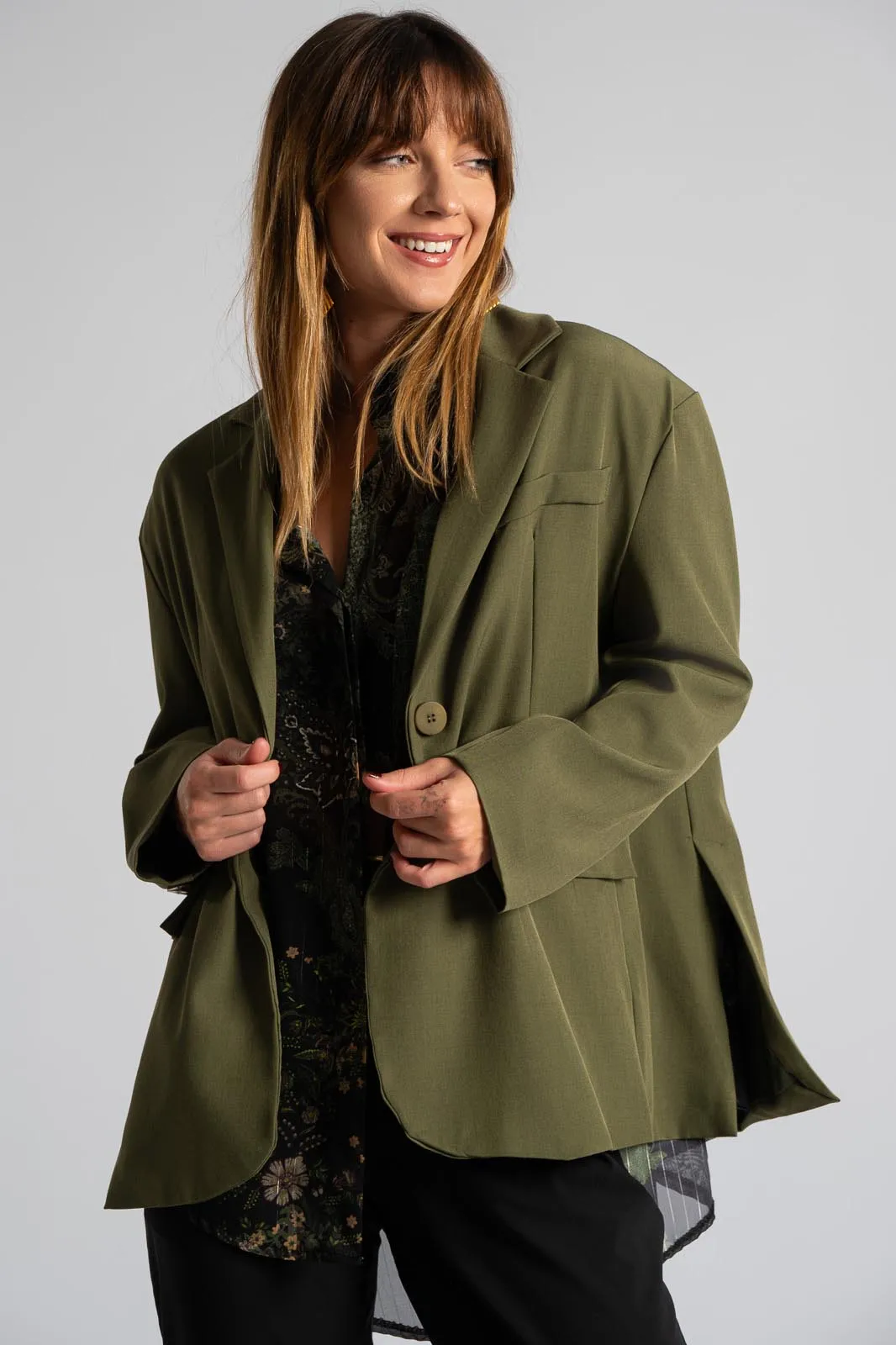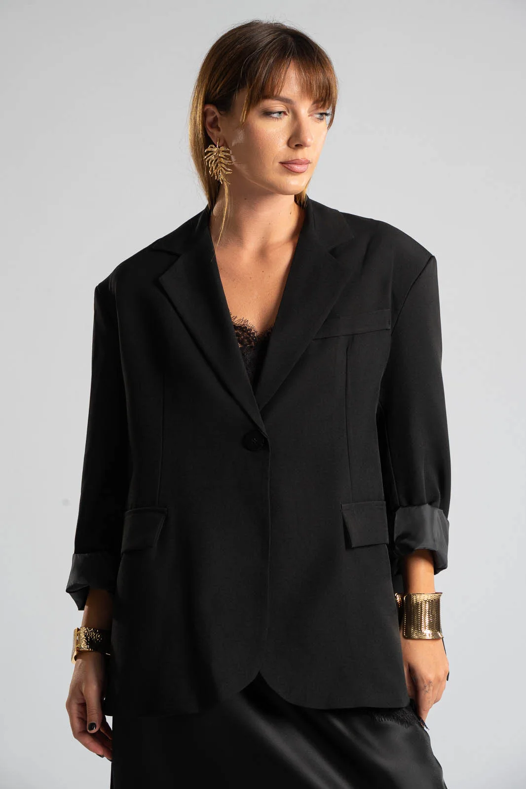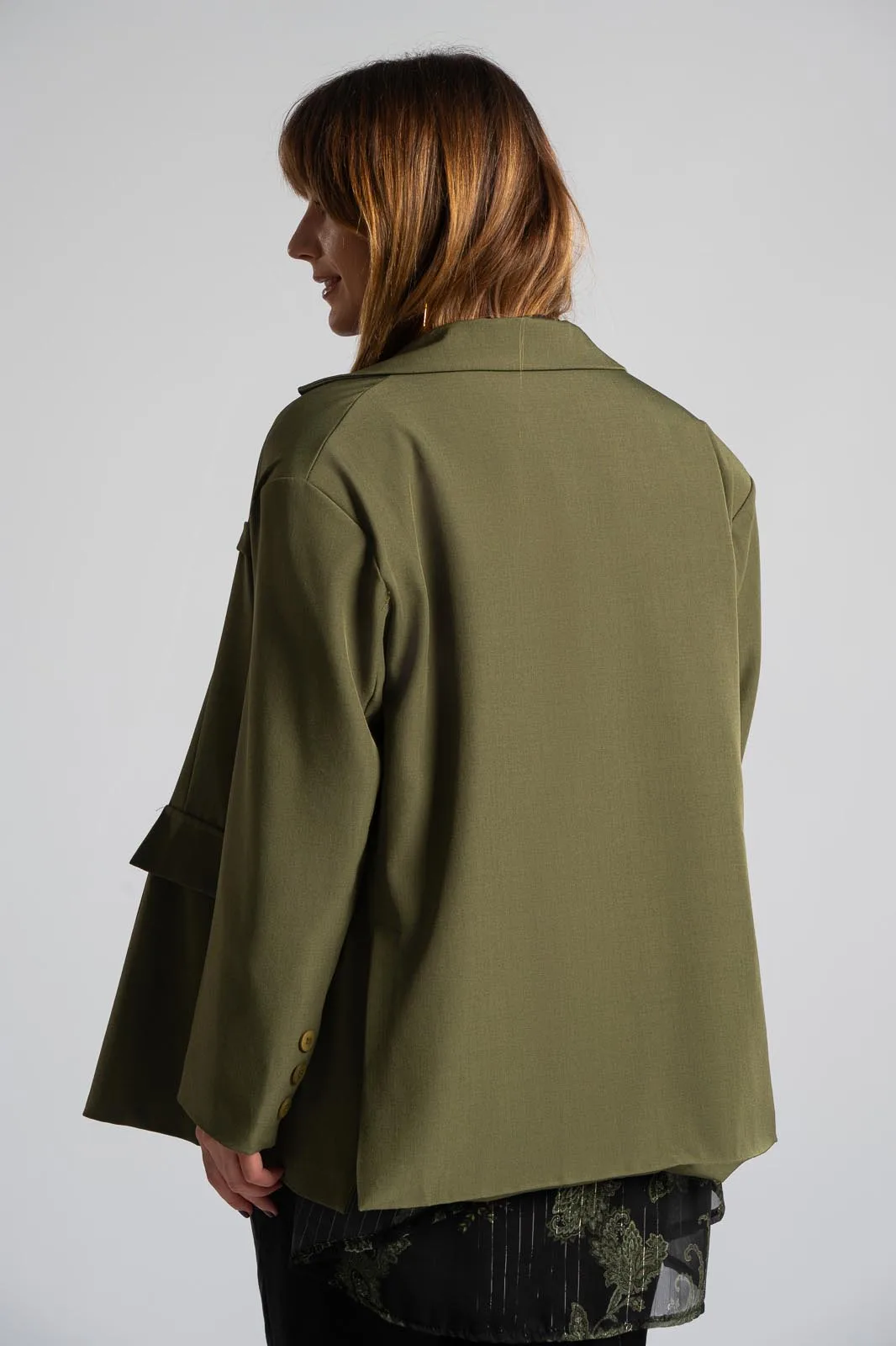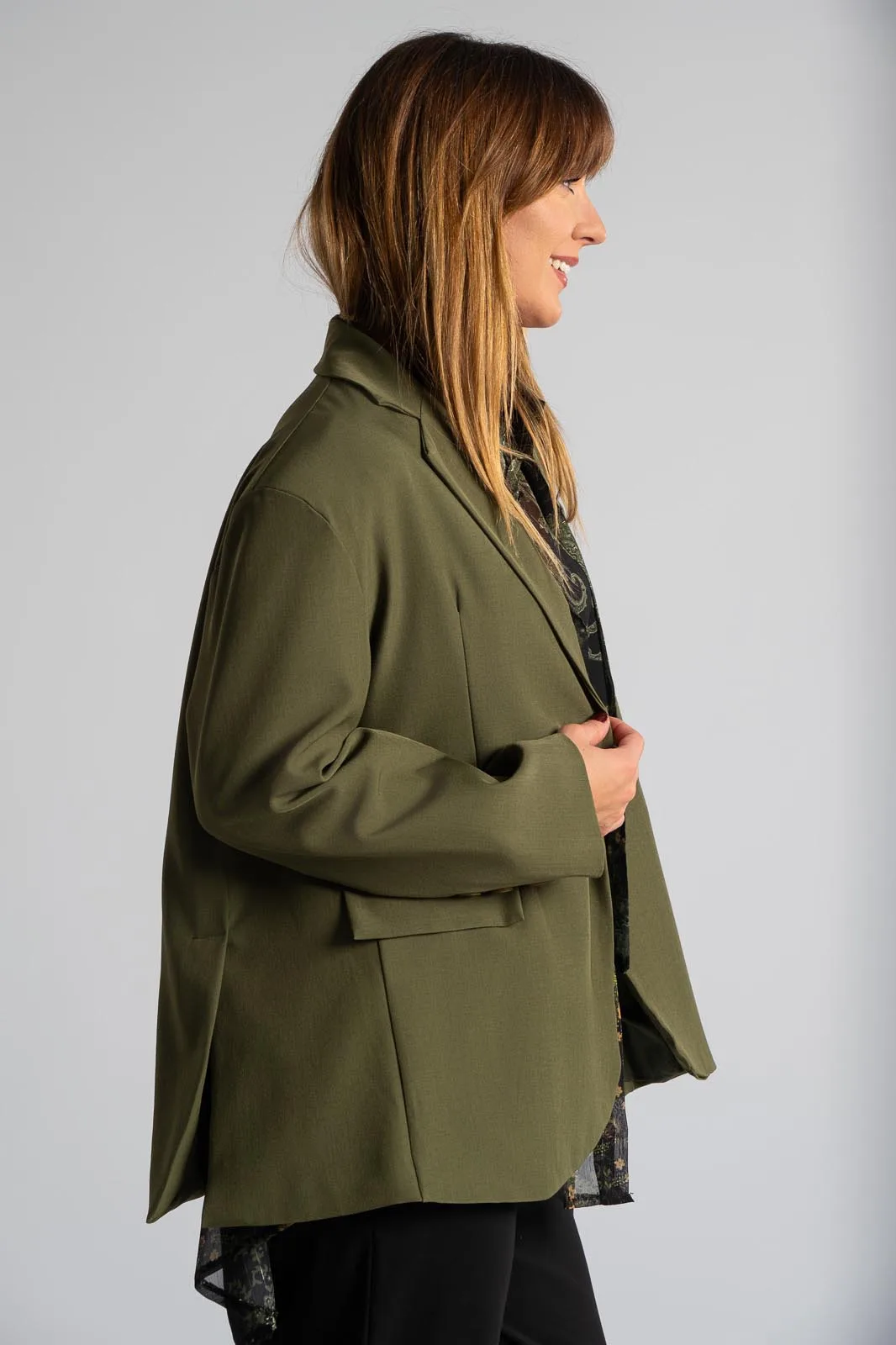 Σακάκι με γιακά και πέτο. Κλείνει με  κουμπί και εσωτερικά είναι φοδραρισμένο. Έχει βάτες στους ώμους. Στο μπροστινό μέρος διαθέτει τσέπες εικονικές με καπάκι. Στο επάνω μέρος στο πλάι έχει εικονική τσέπη με ρέλι. H μέτρηση έχει γίνει με κλειστό το κουμπί. Οι μετρήσεις του πίνακα είναι αντιπροσωπευτικές για κάθε κωδικό. 100% polyester.