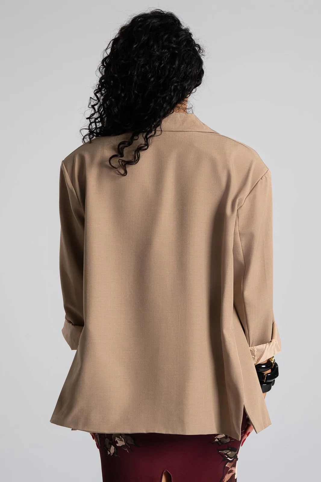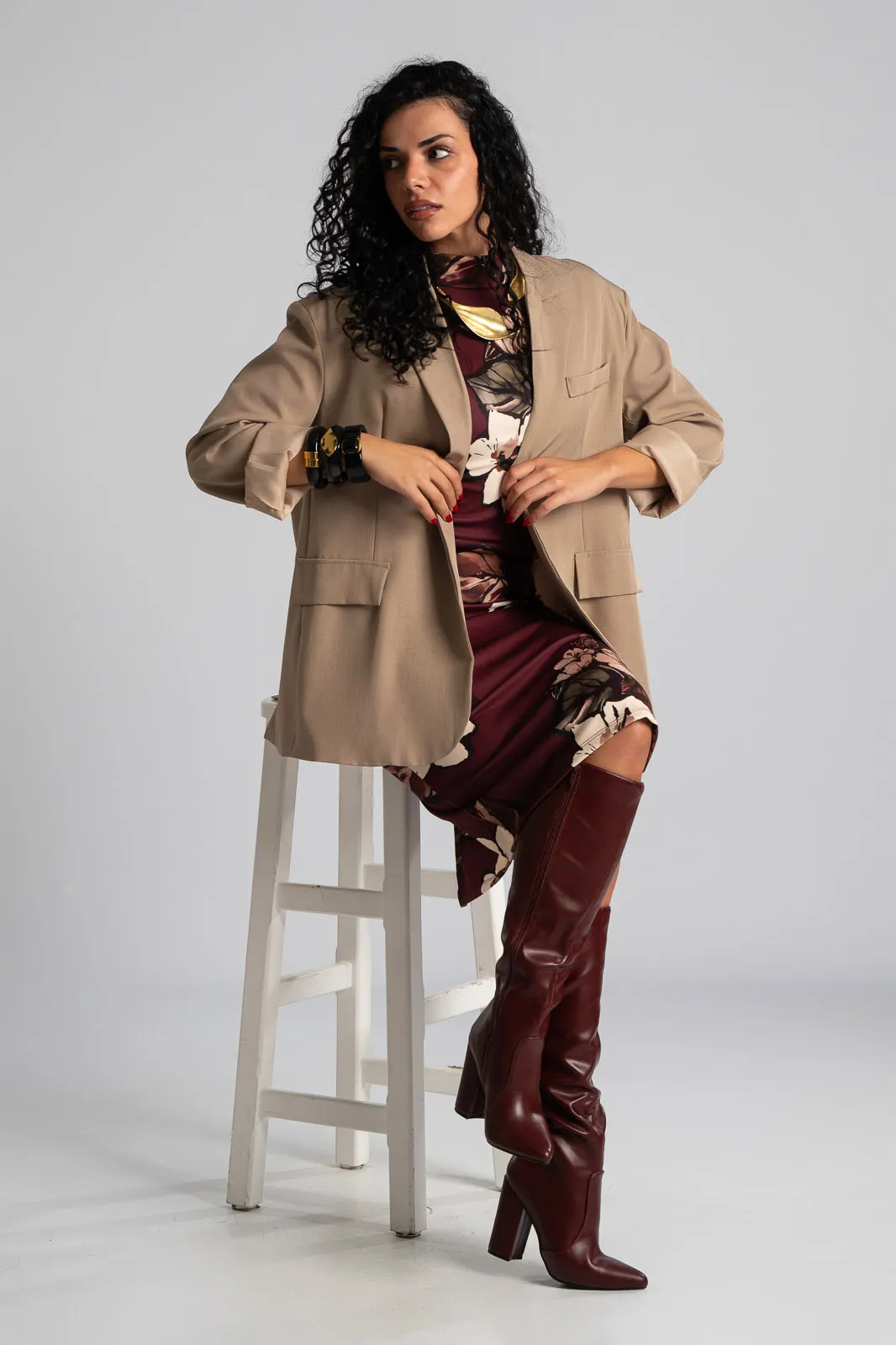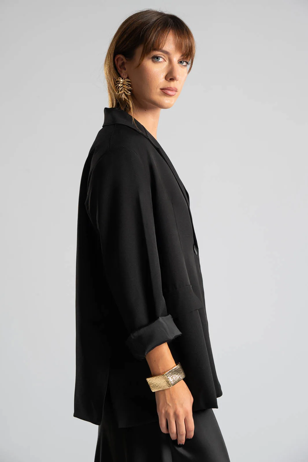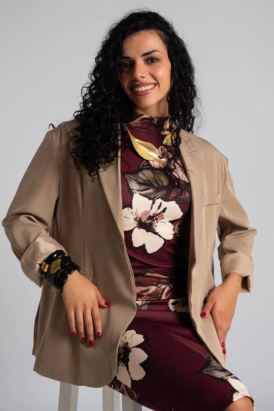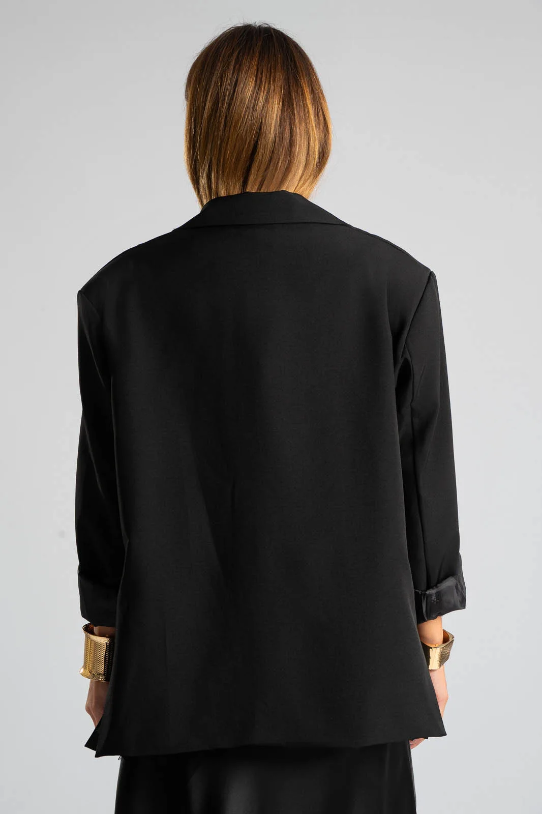 Σακάκι με γιακά και πέτο. Κλείνει με  κουμπί και εσωτερικά είναι φοδραρισμένο. Έχει βάτες στους ώμους. Στο μπροστινό μέρος διαθέτει τσέπες εικονικές με καπάκι. Στο επάνω μέρος στο πλάι έχει εικονική τσέπη με ρέλι. H μέτρηση έχει γίνει με κλειστό το κουμπί. Οι μετρήσεις του πίνακα είναι αντιπροσωπευτικές για κάθε κωδικό. 100% polyester.