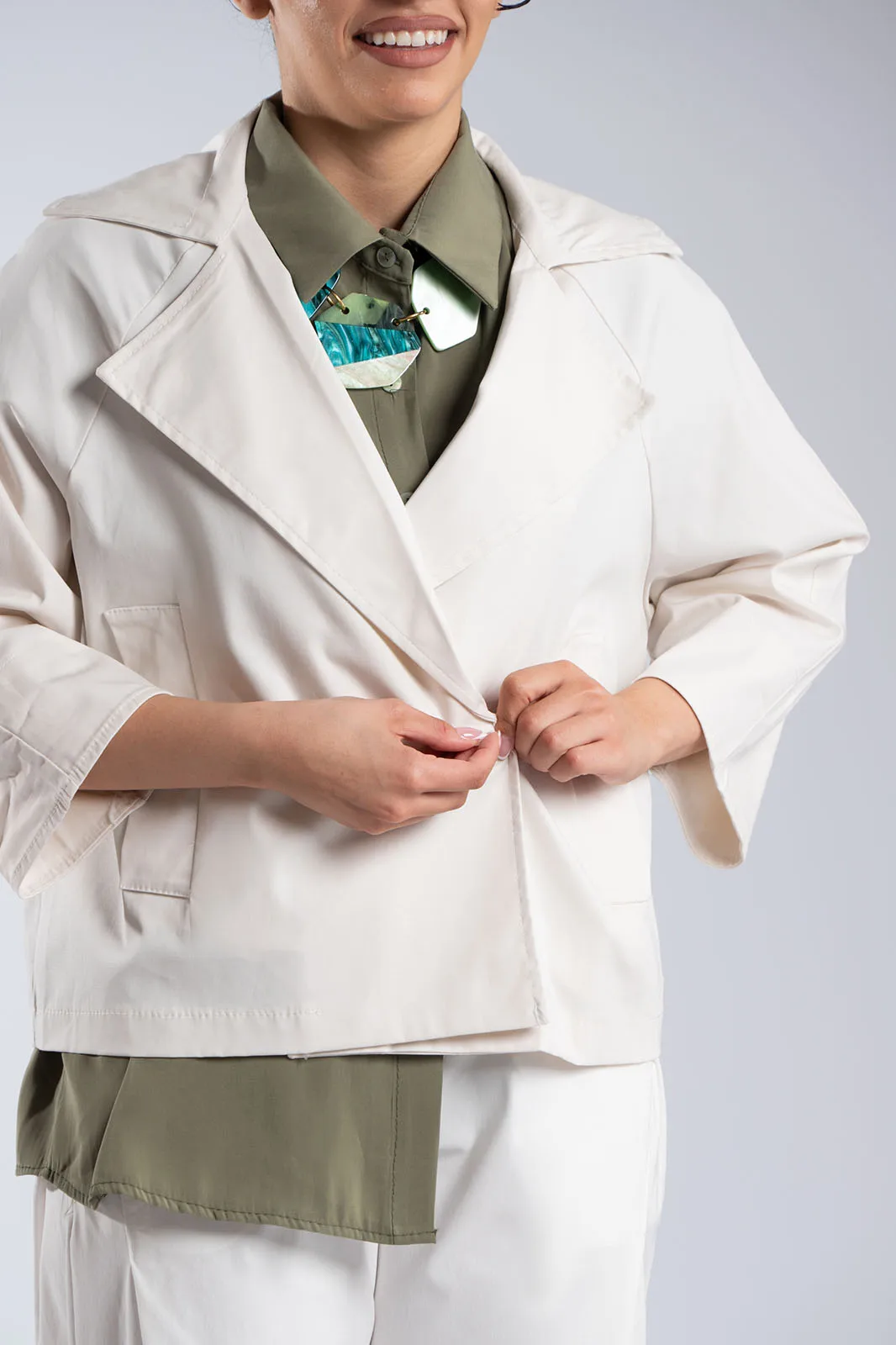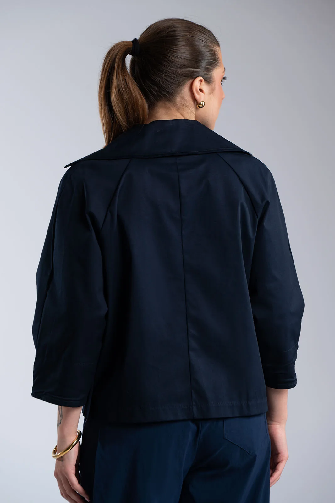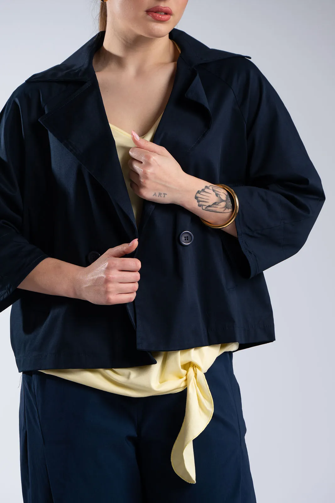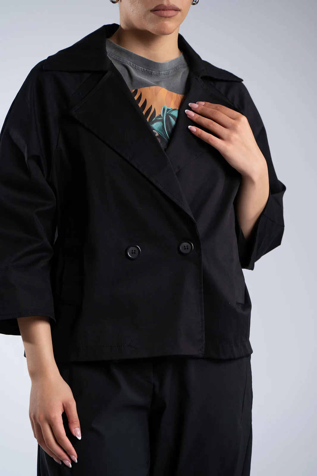 Κομψό κοντό σακάκι με minimal αισθητική και μοντέρνα γραμμή. Διαθέτει μεγάλο γιακά τύπου πέτου και κλείσιμο με κουμπιά στο μπροστινό μέρος, που χαρίζει διαχρονικό χαρακτήρα. Η γραμμή του είναι ίσια, με 3/4 μανίκια σε χαλαρή εφαρμογή που προσφέρουν άνεση στην κίνηση, ενώ οι πλαϊνές τσέπες προσθέτουν πρακτικότητα. Δεν διαθέτει εσωτερική φόδρα, γεγονός που το καθιστά ελαφρύ και ιδανικό για μεταβατικές εποχές. Ιδανικό για casual chic εμφανίσεις αλλά και για πιο προσεγμένα looks.