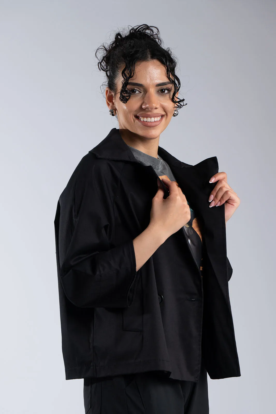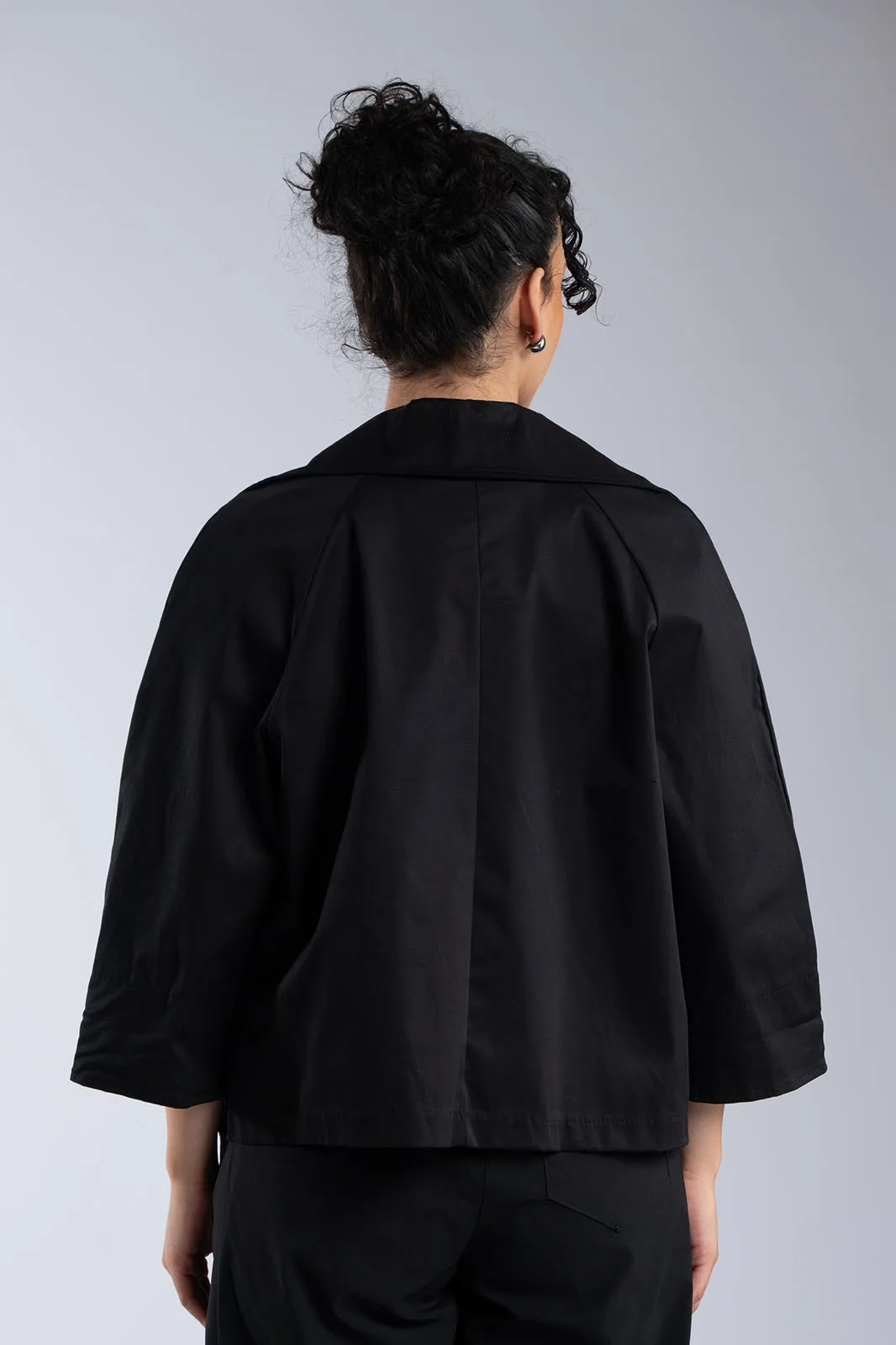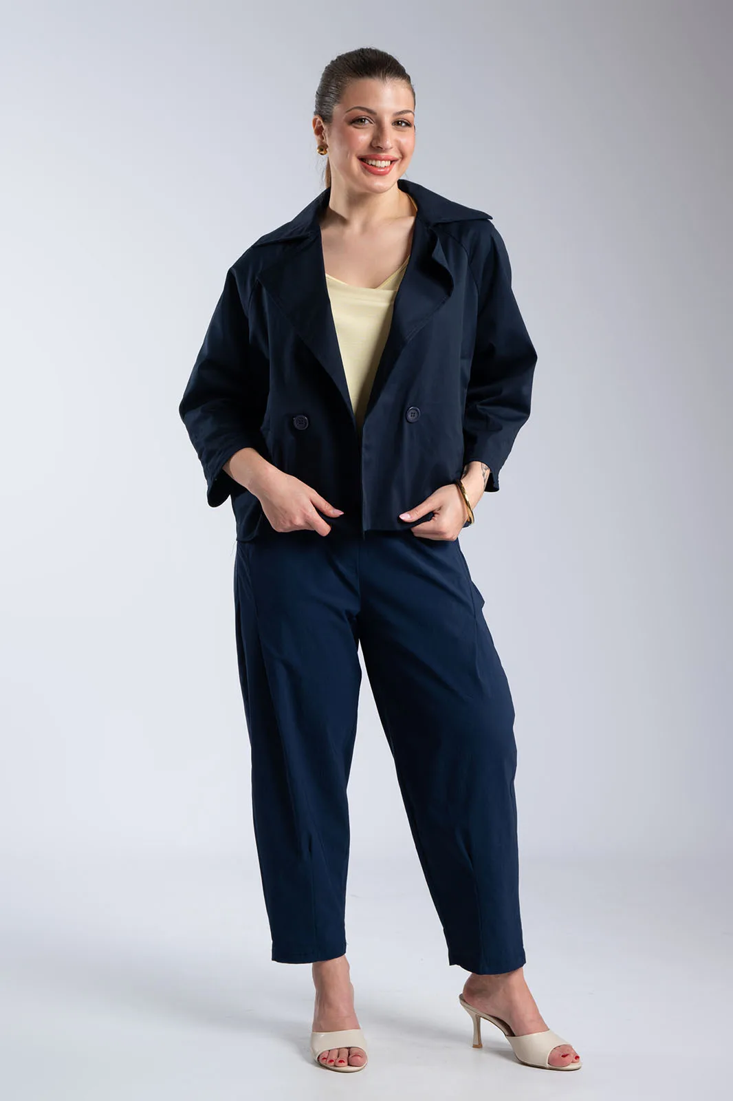 Κομψό κοντό σακάκι με minimal αισθητική και μοντέρνα γραμμή. Διαθέτει μεγάλο γιακά τύπου πέτου και κλείσιμο με κουμπιά στο μπροστινό μέρος, που χαρίζει διαχρονικό χαρακτήρα. Η γραμμή του είναι ίσια, με 3/4 μανίκια σε χαλαρή εφαρμογή που προσφέρουν άνεση στην κίνηση, ενώ οι πλαϊνές τσέπες προσθέτουν πρακτικότητα. Δεν διαθέτει εσωτερική φόδρα, γεγονός που το καθιστά ελαφρύ και ιδανικό για μεταβατικές εποχές. Ιδανικό για casual chic εμφανίσεις αλλά και για πιο προσεγμένα looks.