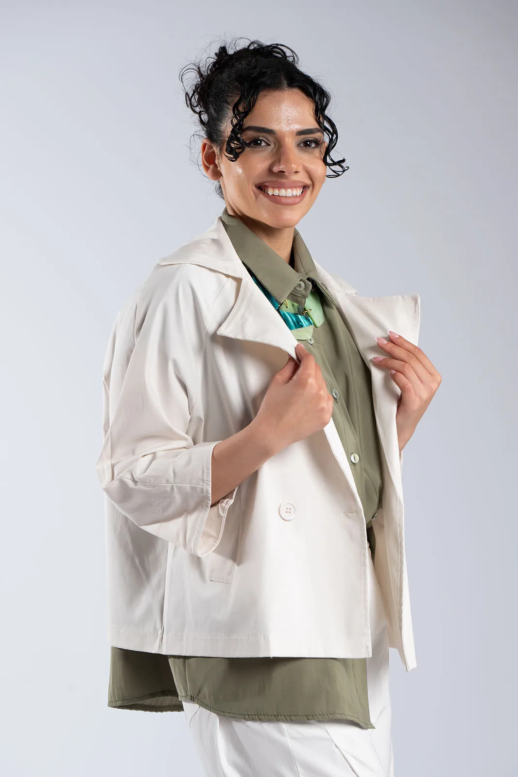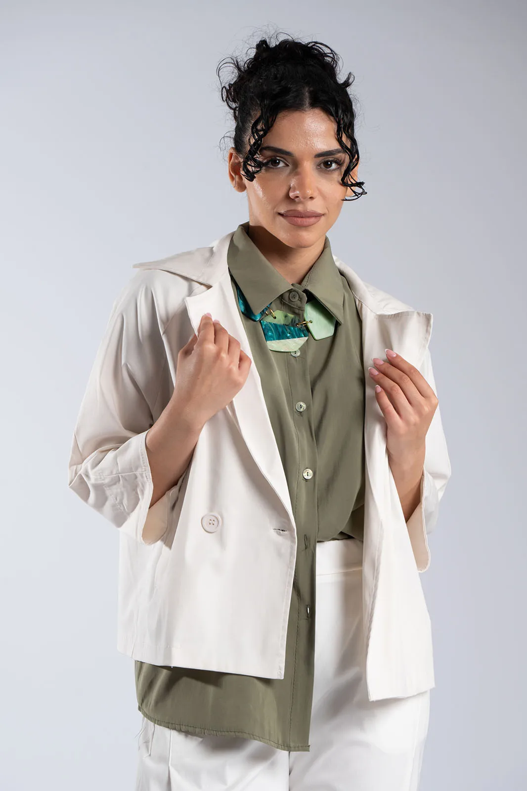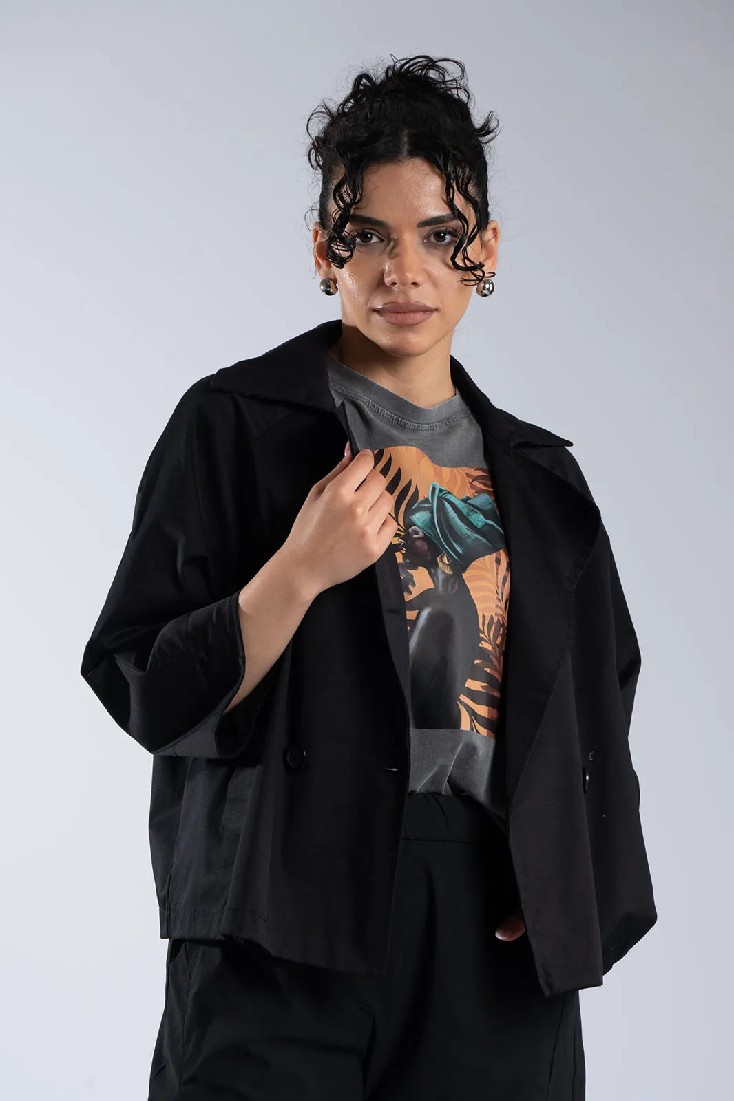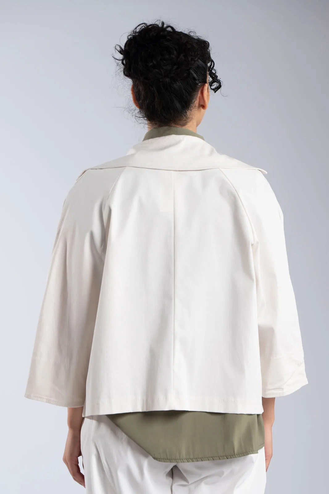 Κομψό κοντό σακάκι με minimal αισθητική και μοντέρνα γραμμή. Διαθέτει μεγάλο γιακά τύπου πέτου και κλείσιμο με κουμπιά στο μπροστινό μέρος, που χαρίζει διαχρονικό χαρακτήρα. Η γραμμή του είναι ίσια, με 3/4 μανίκια σε χαλαρή εφαρμογή που προσφέρουν άνεση στην κίνηση, ενώ οι πλαϊνές τσέπες προσθέτουν πρακτικότητα. Δεν διαθέτει εσωτερική φόδρα, γεγονός που το καθιστά ελαφρύ και ιδανικό για μεταβατικές εποχές. Ιδανικό για casual chic εμφανίσεις αλλά και για πιο προσεγμένα looks.