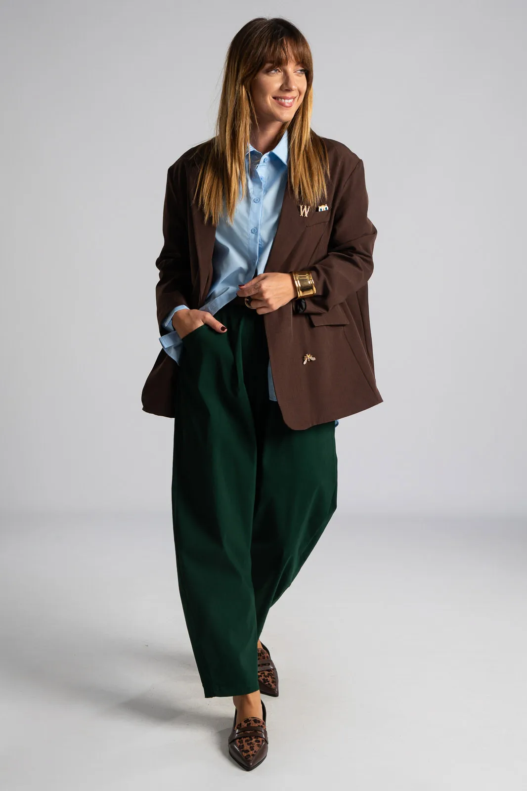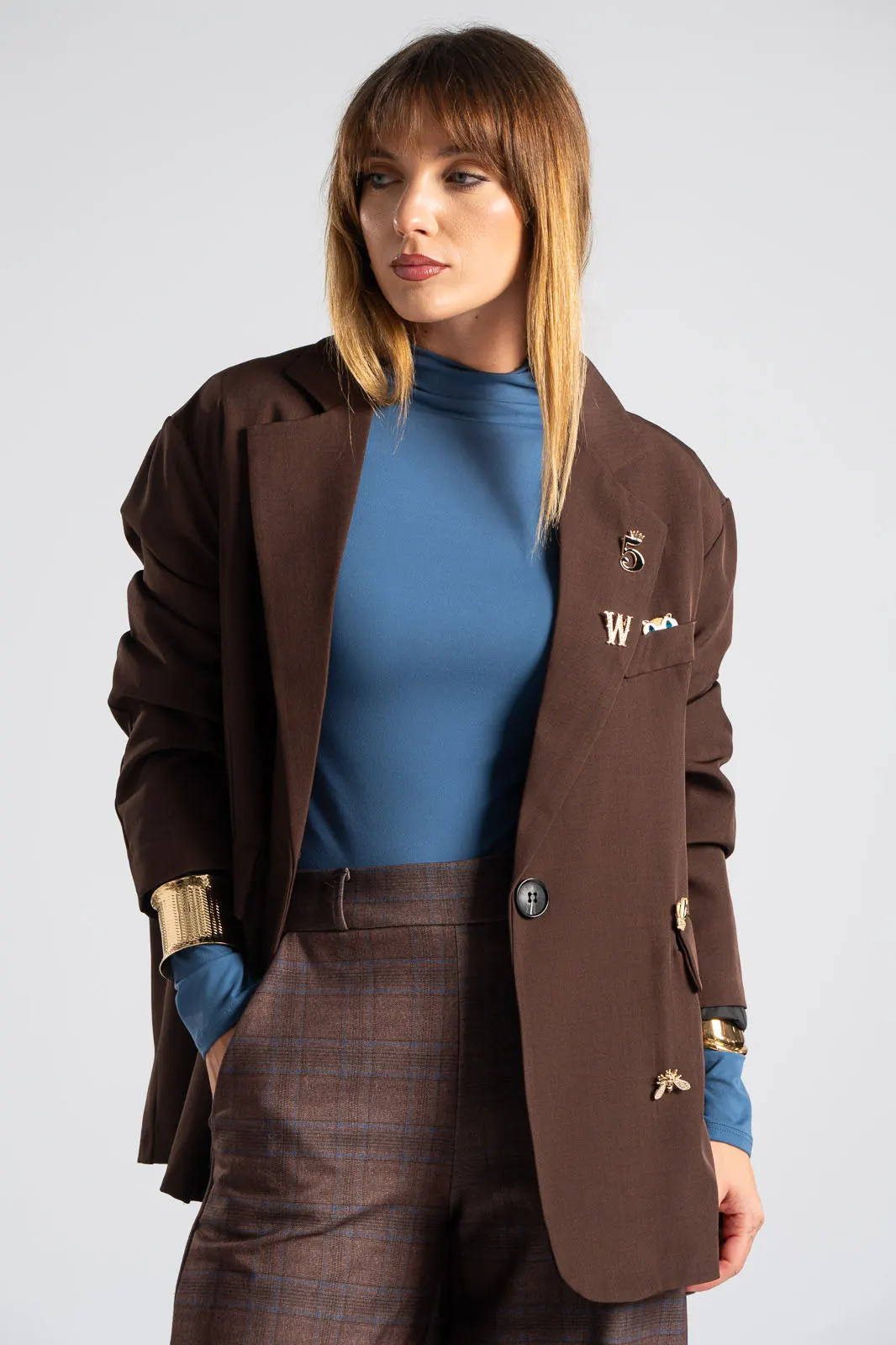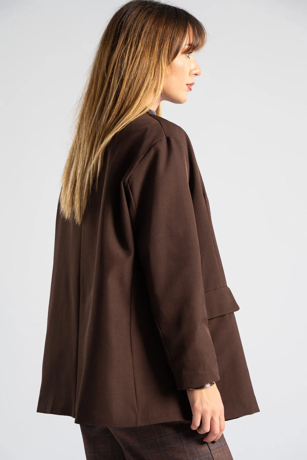Σακάκι με γιακά και πέτο. Κλείνει με κουμπί και εσωτερικά είναι φοδραρισμένο. Στο μπροστινό μέρος διαθέτει τσέπες εικονικές με καπάκι. Στο επάνω μέρος στο πλάι έχει εικονική τσέπη με ρέλι. H μέτρηση έχει γίνει με κλειστό το κουμπί. Στο μπροστινό μέρος έχει διακοσμητικές καρφίτσες σε διάφορα σχέδια. Οι μετρήσεις του πίνακα είναι αντιπροσωπευτικές για κάθε κωδικό. 100% polyester.