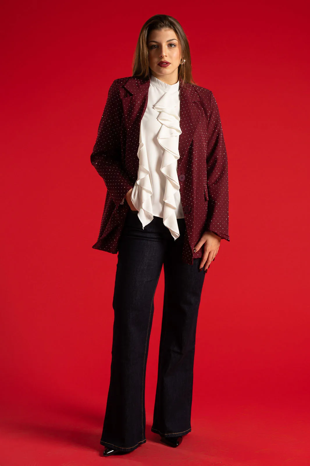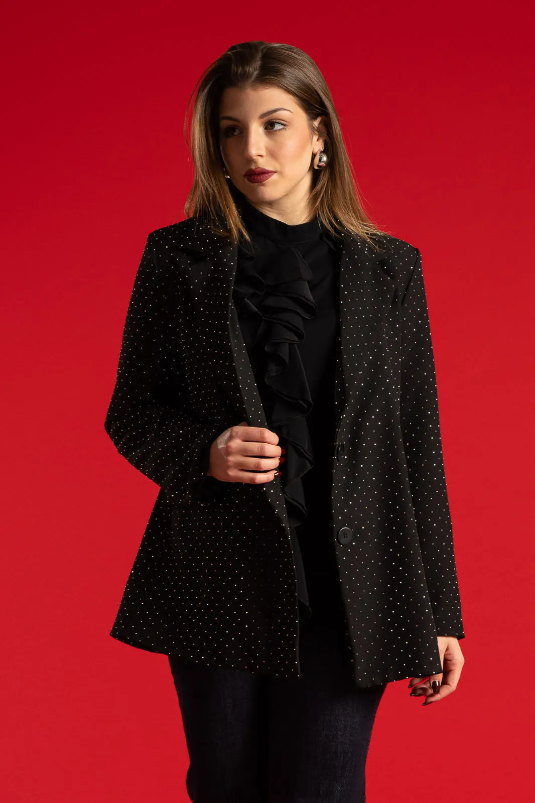Blazer with collar and lapels. It is decorated with troux all over its surface. It has long sleeves and closes with two buttons. It has two faux pockets on the front. It is lined on the inside. The measurements in the table are representative for each code. 100% polyester.
