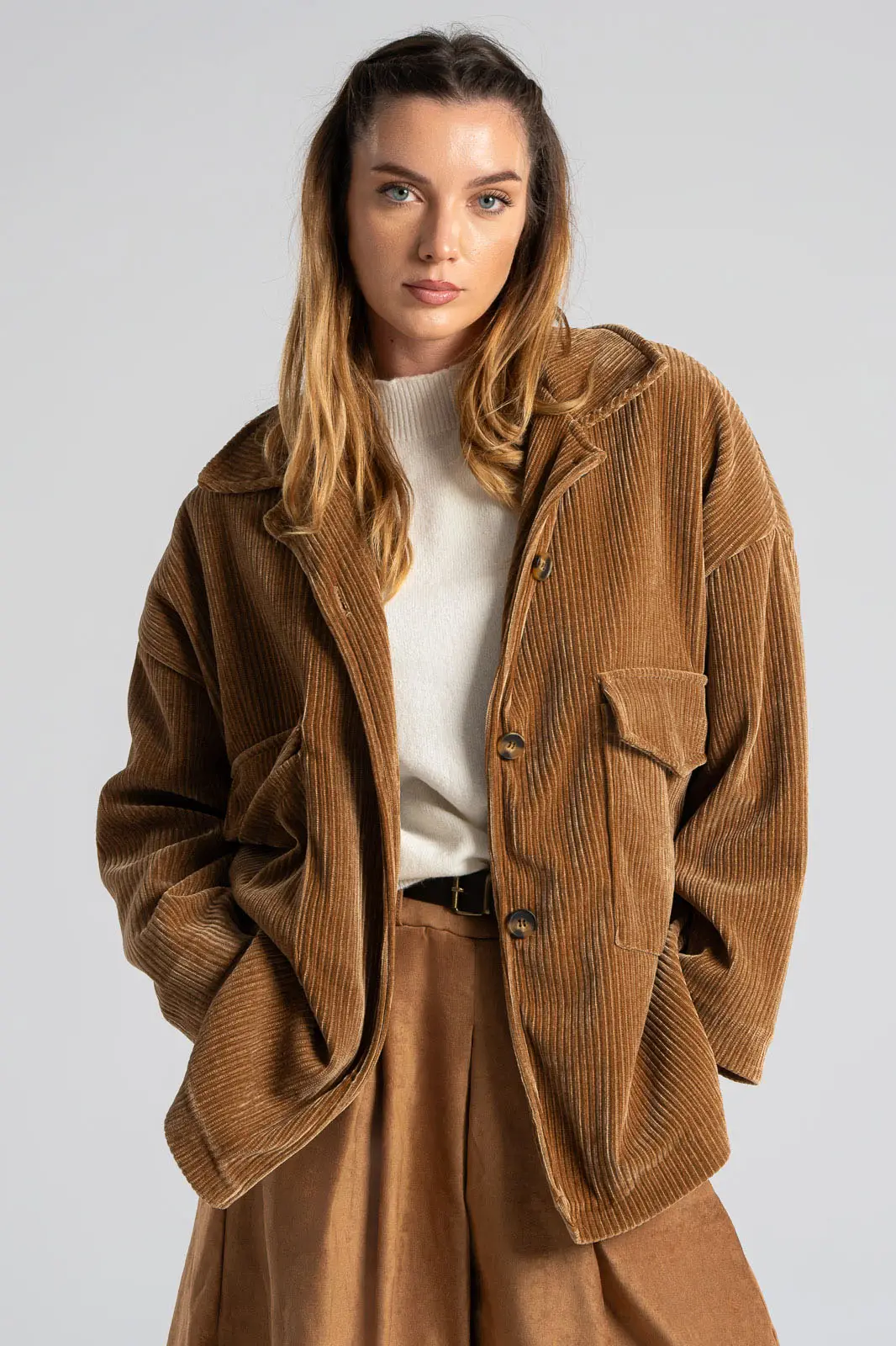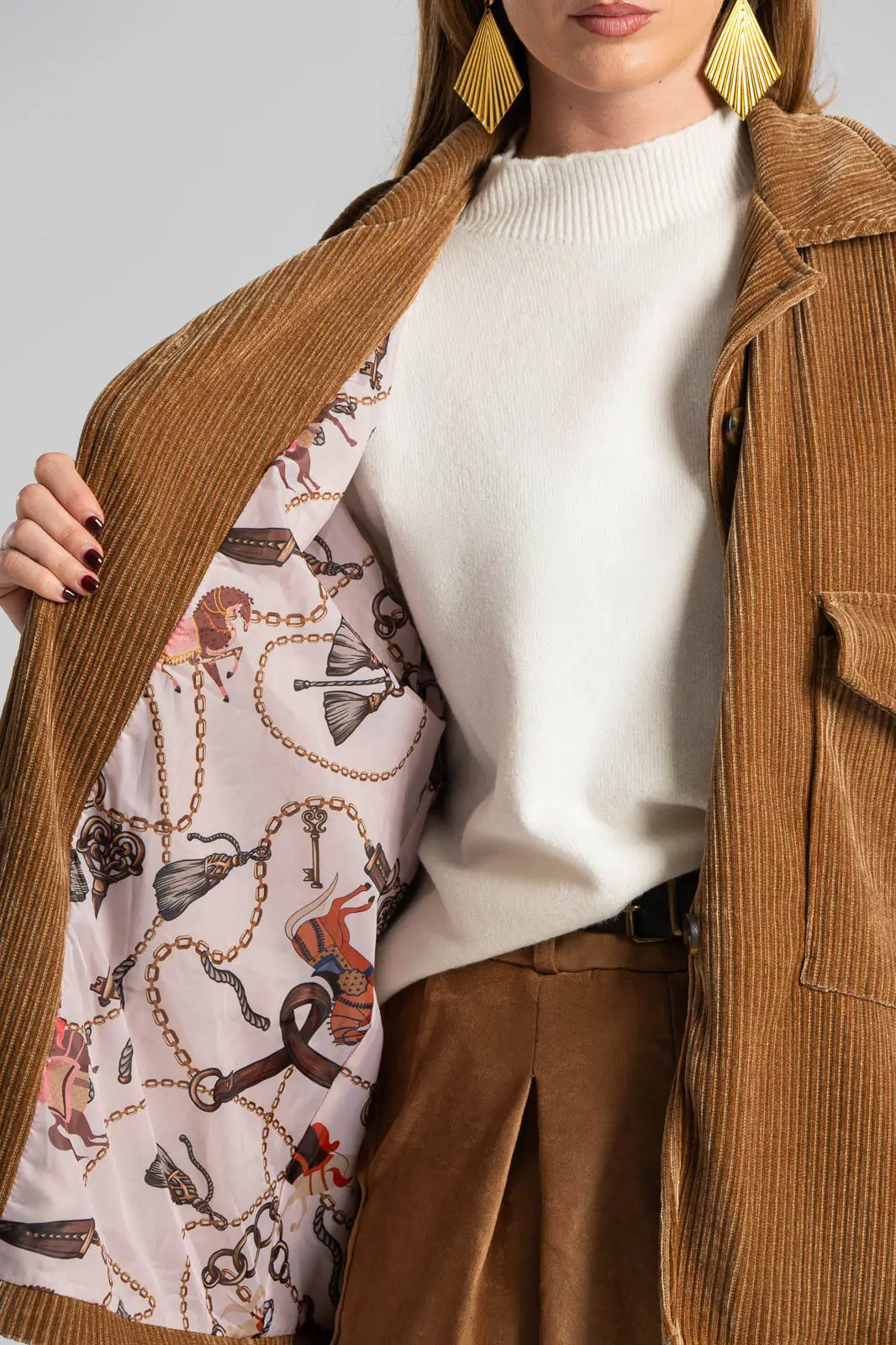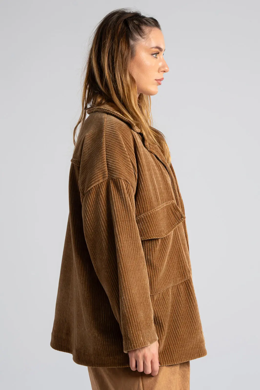 Σακάκι με γιακά και μακριά μανίκια. Στο μπροστινό και πάνω μέρος έχει τσέπες με καπάκι. Κλείνει με κουμπιά. Είναι κοτλέ. Εσωτερικά είναι φοδραρισμένο, εμπριμέ. Οι μετρήσεις του πίνακα είναι αντιπροσωπευτικές για κάθε προϊόν. 98% polyester, 2% elastan.