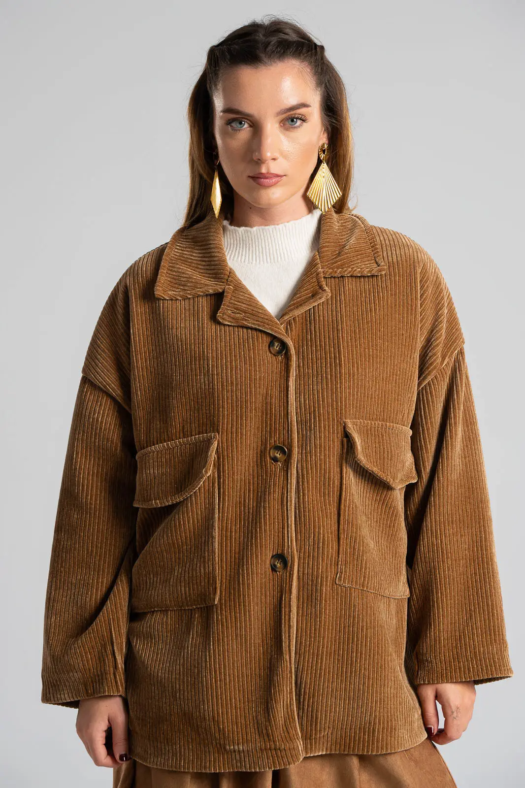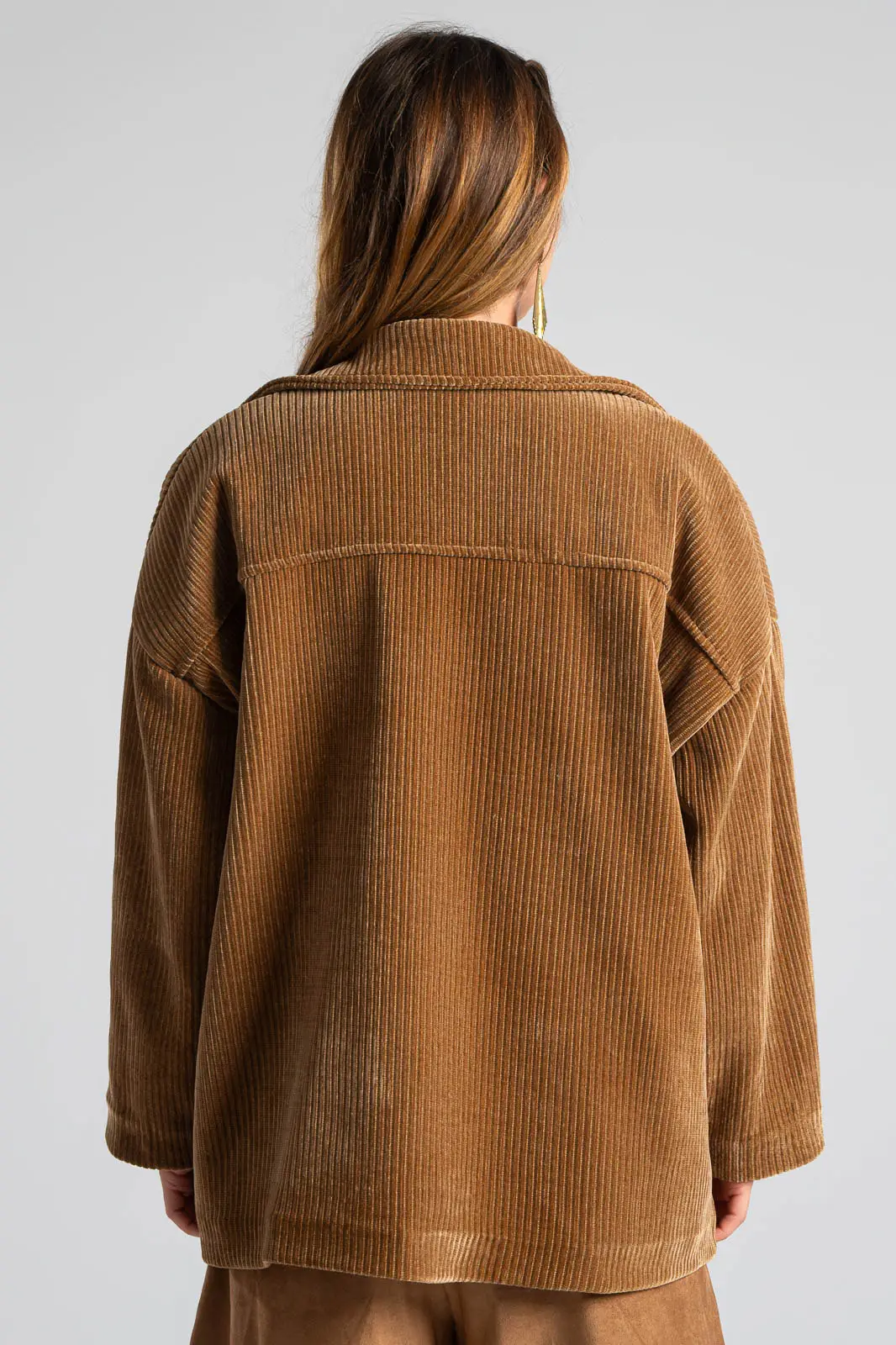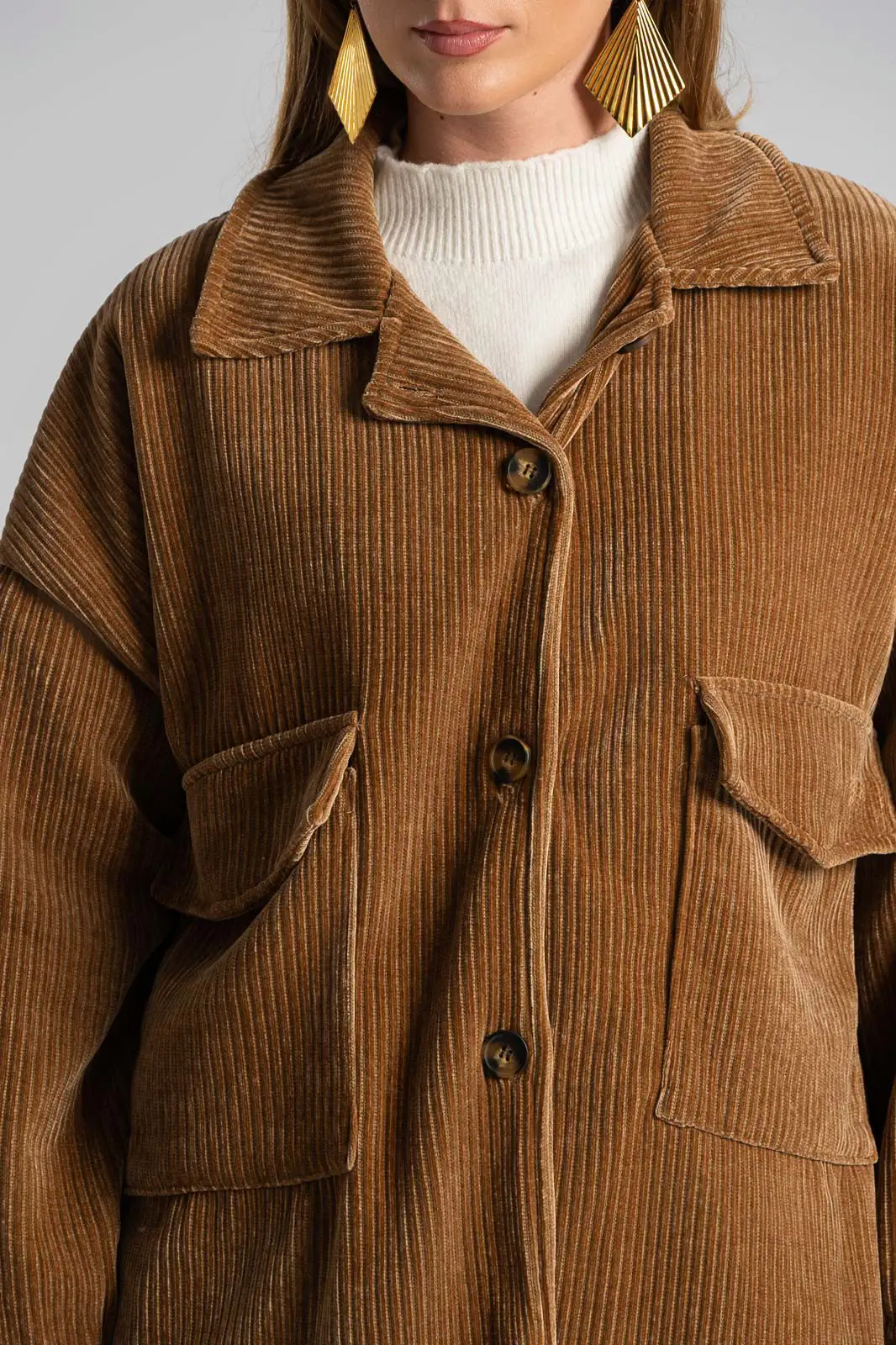 Σακάκι με γιακά και μακριά μανίκια. Στο μπροστινό και πάνω μέρος έχει τσέπες με καπάκι. Κλείνει με κουμπιά. Είναι κοτλέ. Εσωτερικά είναι φοδραρισμένο, εμπριμέ. Οι μετρήσεις του πίνακα είναι αντιπροσωπευτικές για κάθε προϊόν. 98% polyester, 2% elastan.