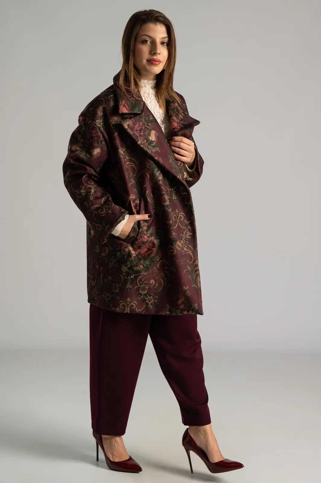 Σακάκι με γιακά και πέτο. Έχει μακριά μανίκια. Στο μπροστινό μέρος κλείνει με κουμπιά και έχει δύο διακοσμητικά. Σε όλη την επιφάνεια έχει floral print. Εσωτερικά είναι φοδραρισμένο. Στα πλαινά διαθέτει τσέπες. Η μέτρηση έχει γίνει με κλειστά κουμπιά. Οι μετρήσεις του πίνακα είναι αντιπροσωπευτικές για κάθε κωδικό. 100% polyester.