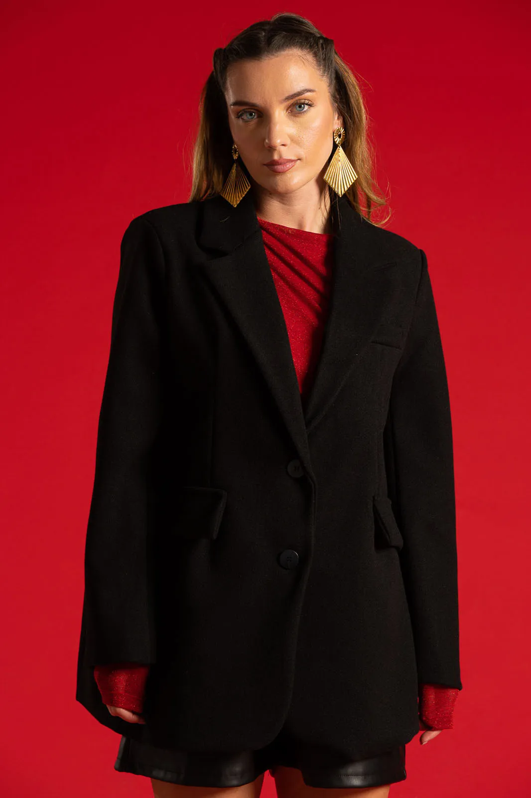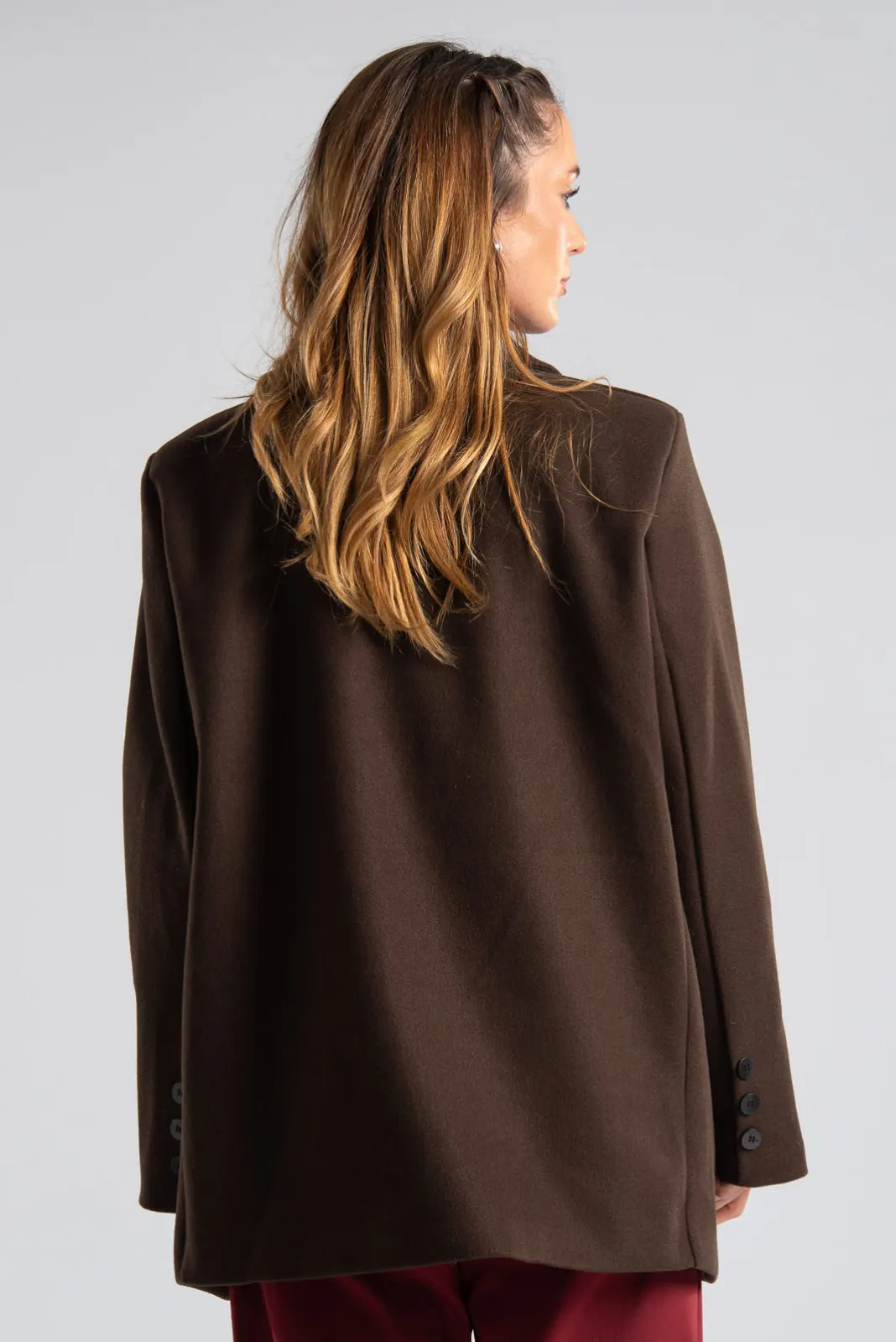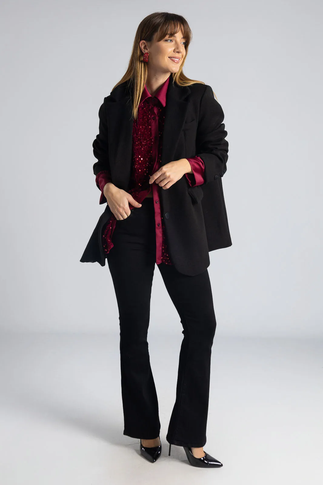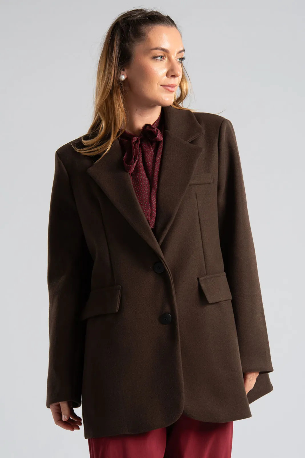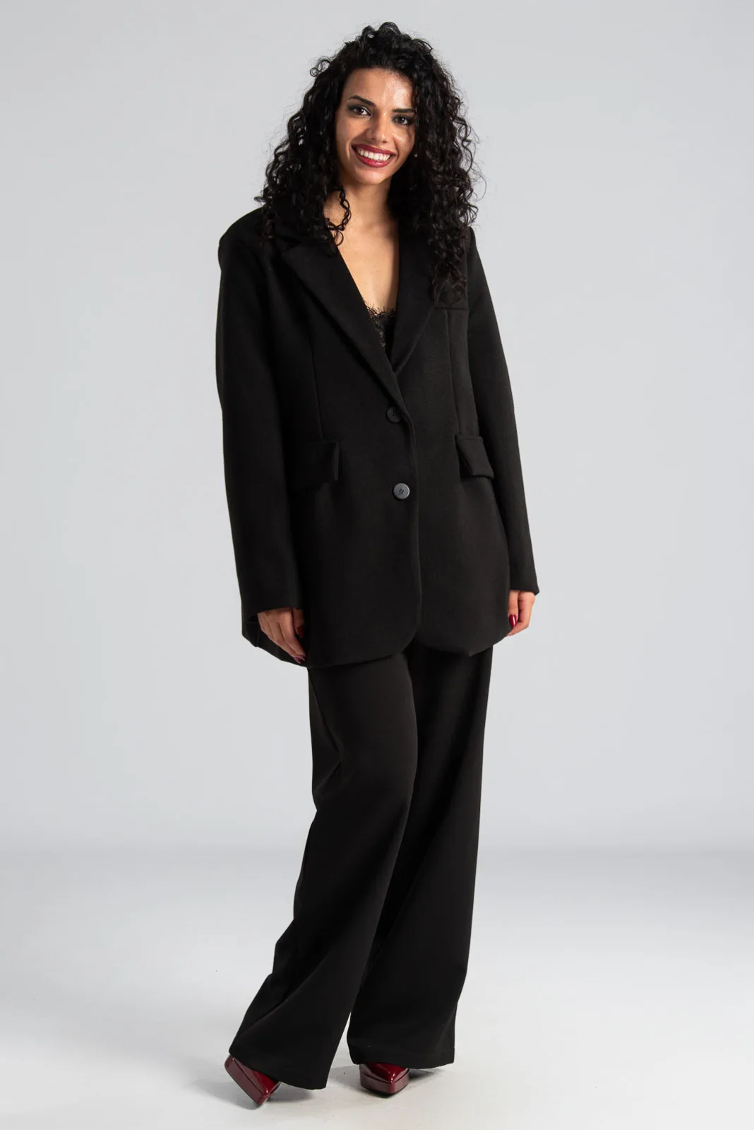 Blazer with collar and lapels. It has long sleeves that end in decorative buttons. It fastens with two buttons. It has two faux pockets with flaps on the front and one with a flap on the top. It is lined on the inside. The measurements in the table are representative for each code. 100% polyester.