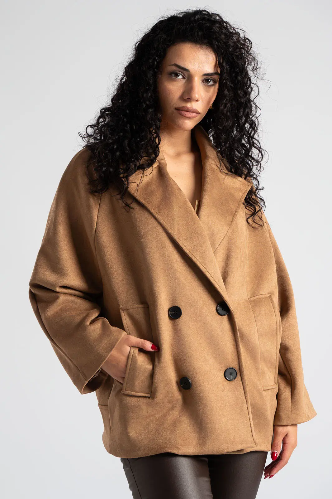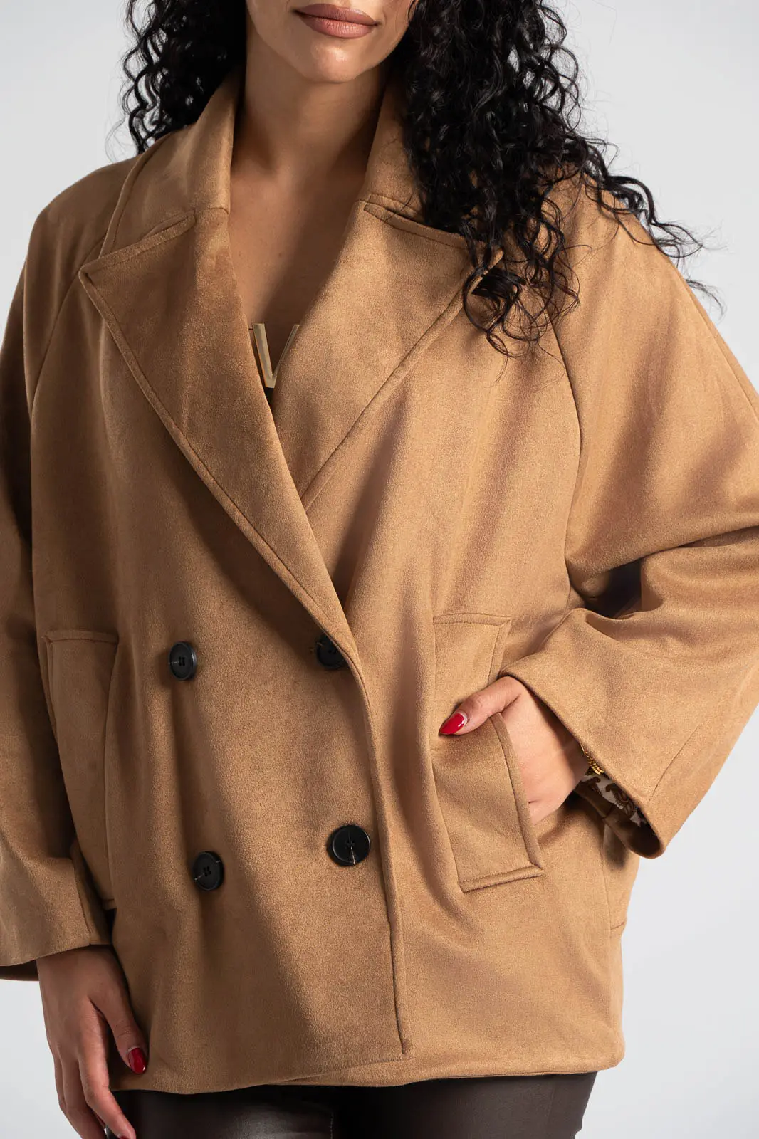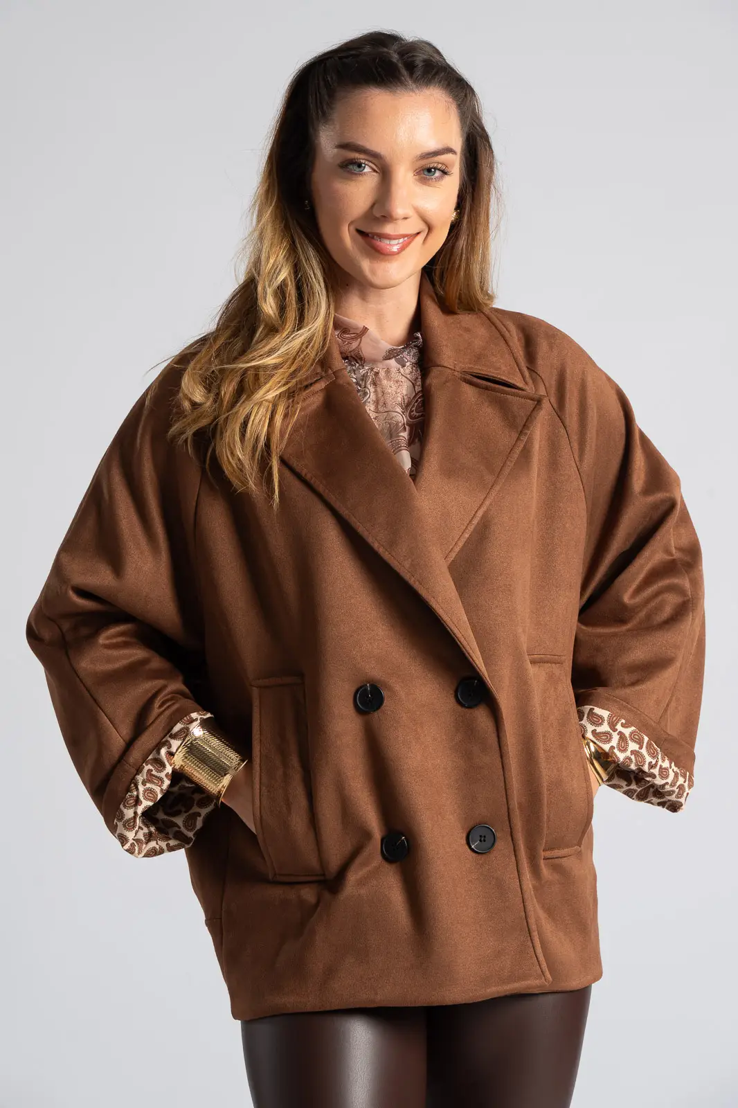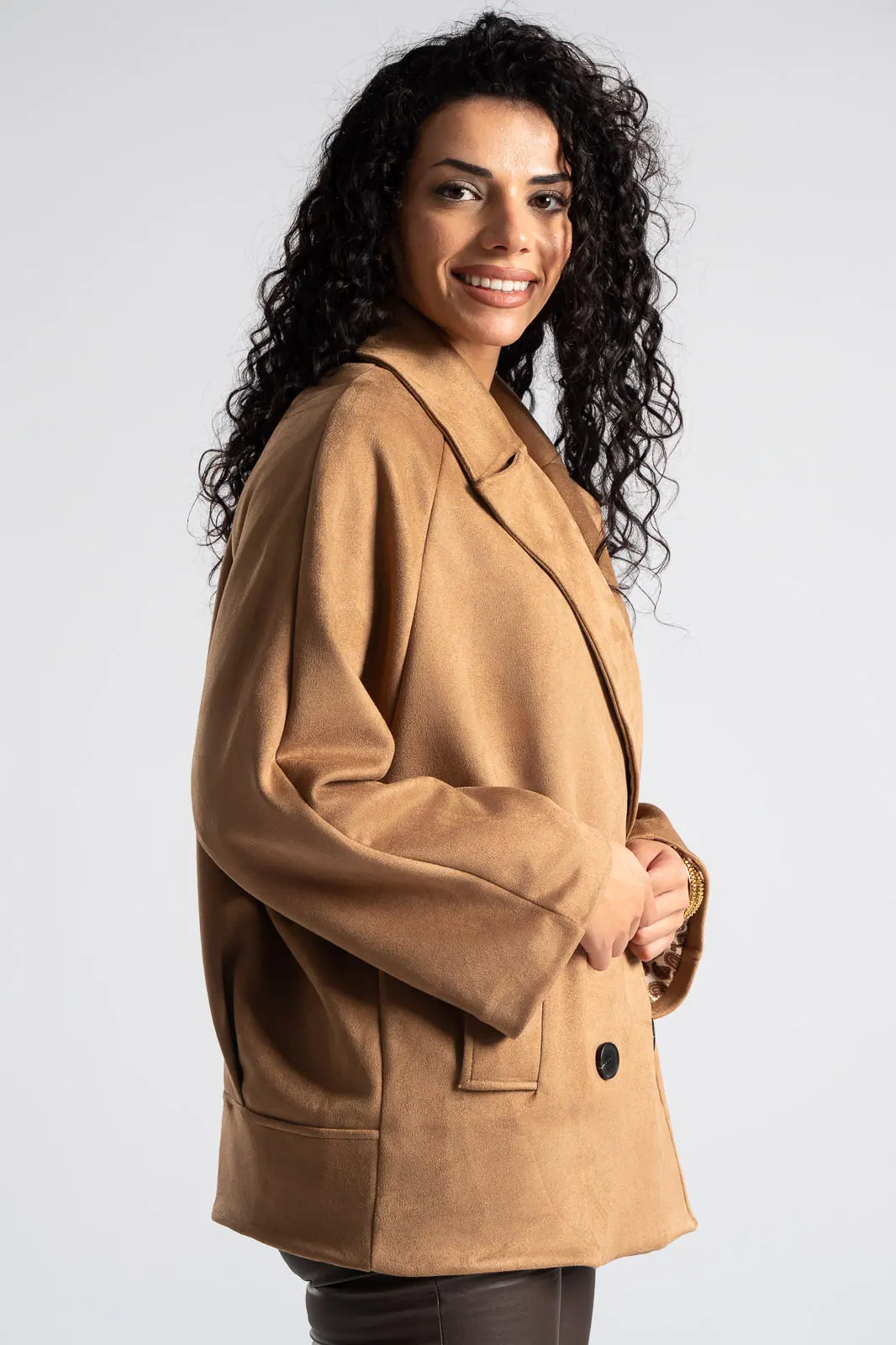 Σακάκι που διαθέτει γιακά και πέτο. Έχει μακριά μανίκια (7/8). Στα πλαινά έχει τσέπες. Σε όλη την επιφάνεια έχει σουέτ υφή. Κλείνει με δύο κουμπιά και έχει δύο διακοσμητικά. Εσωτερικά διαθέτει φόδρα σε paisley print. Η μέτρηση έχει γίνει με κλειστά κουμπιά. Οι μετρήσεις του πίνακα είναι αντιπροσωπευτικές για κάθε κωδικό. 96% polyester, 4% elastan.