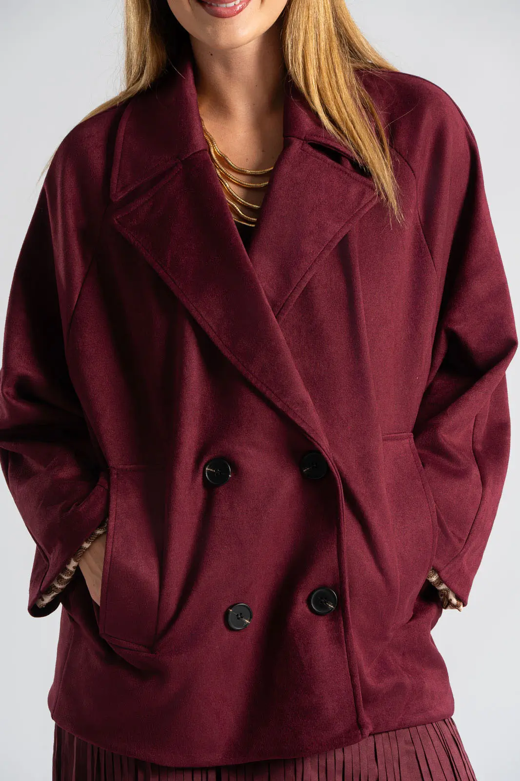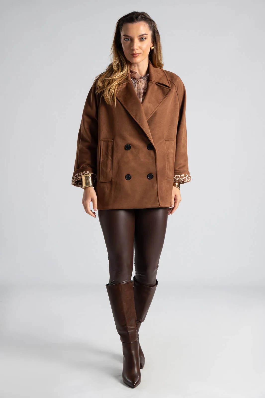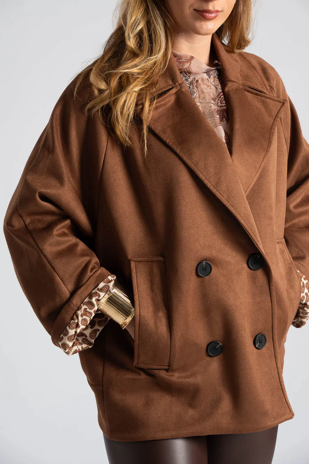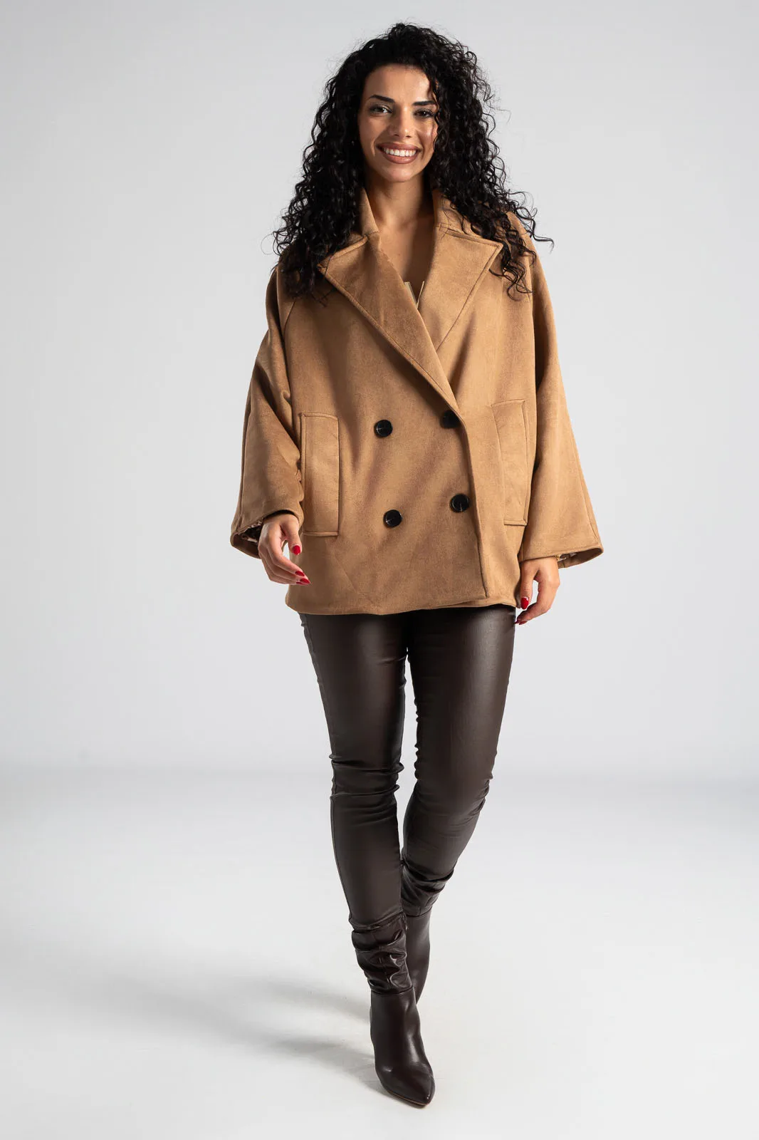 Σακάκι που διαθέτει γιακά και πέτο. Έχει μακριά μανίκια (7/8). Στα πλαινά έχει τσέπες. Σε όλη την επιφάνεια έχει σουέτ υφή. Κλείνει με δύο κουμπιά και έχει δύο διακοσμητικά. Εσωτερικά διαθέτει φόδρα σε paisley print. Η μέτρηση έχει γίνει με κλειστά κουμπιά. Οι μετρήσεις του πίνακα είναι αντιπροσωπευτικές για κάθε κωδικό. 96% polyester, 4% elastan.