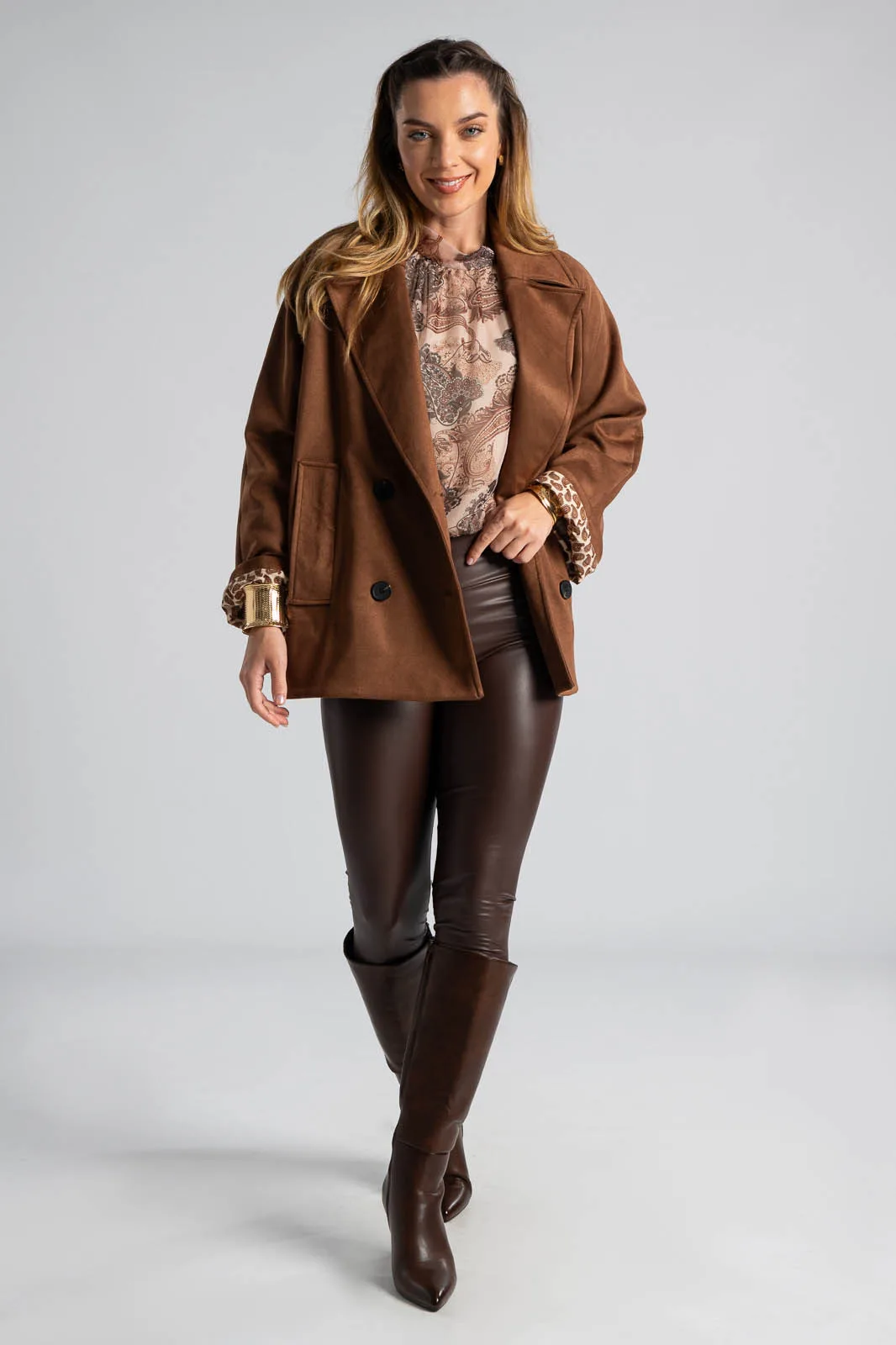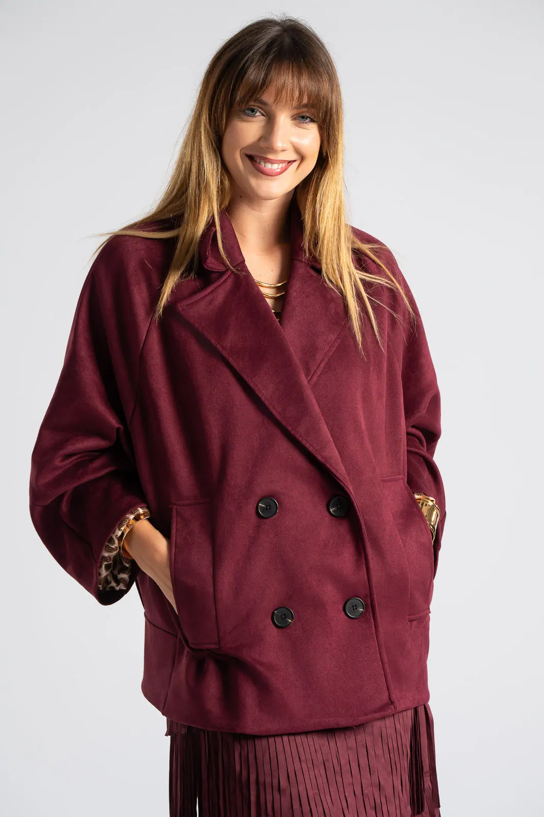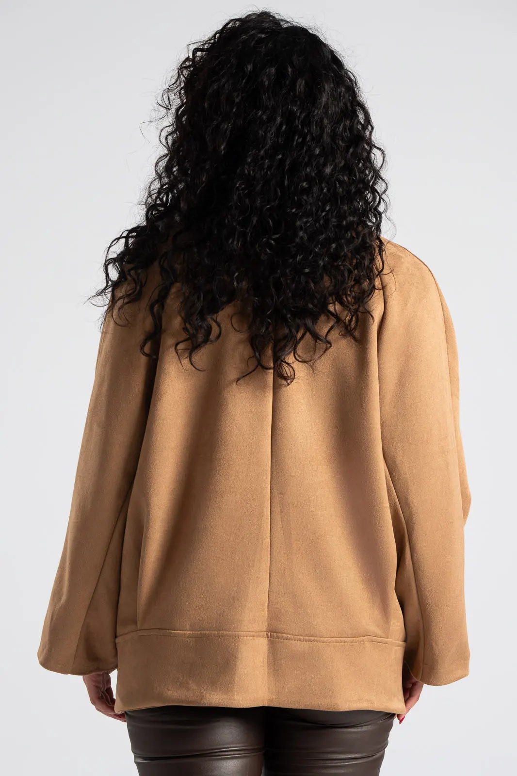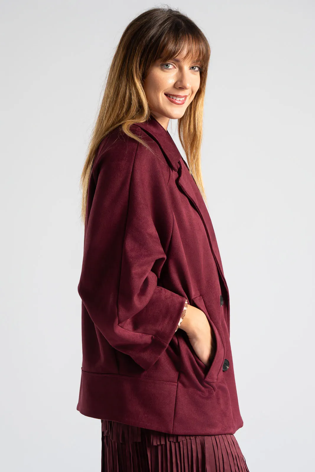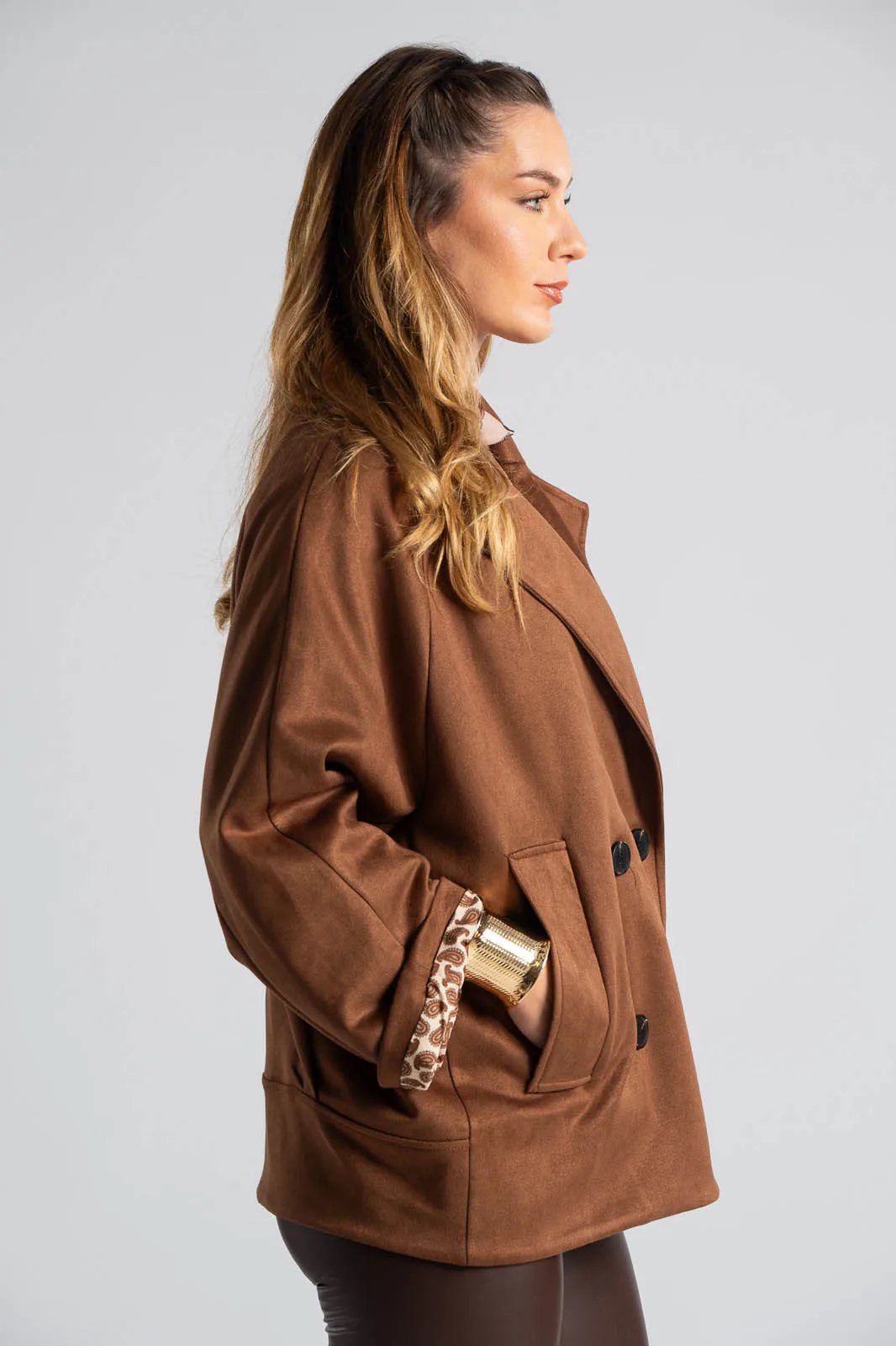 Σακάκι που διαθέτει γιακά και πέτο. Έχει μακριά μανίκια (7/8). Στα πλαινά έχει τσέπες. Σε όλη την επιφάνεια έχει σουέτ υφή. Κλείνει με δύο κουμπιά και έχει δύο διακοσμητικά. Εσωτερικά διαθέτει φόδρα σε paisley print. Η μέτρηση έχει γίνει με κλειστά κουμπιά. Οι μετρήσεις του πίνακα είναι αντιπροσωπευτικές για κάθε κωδικό. 96% polyester, 4% elastan.