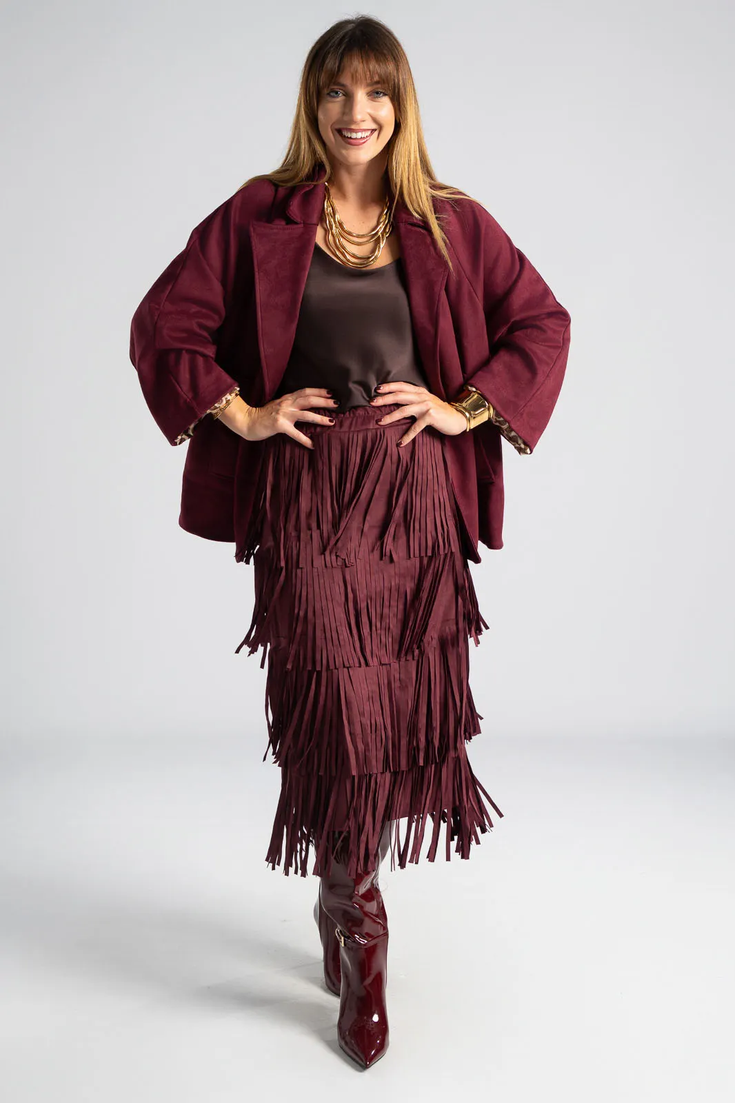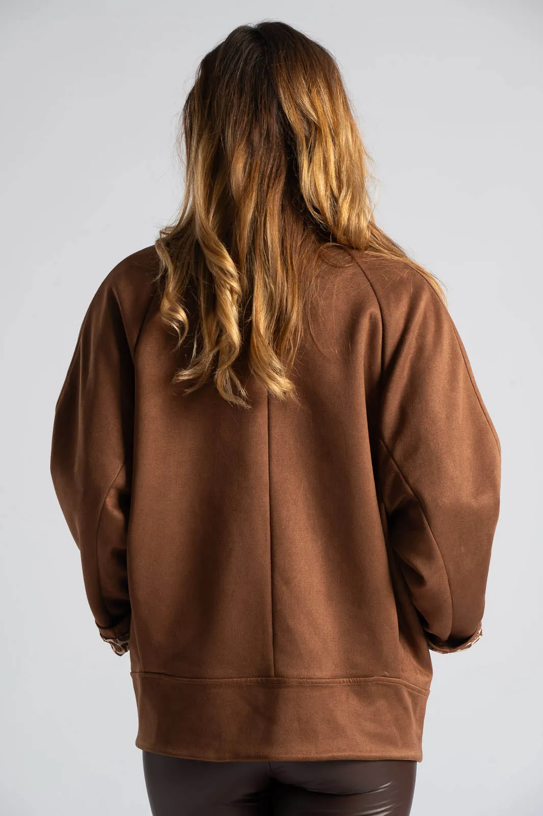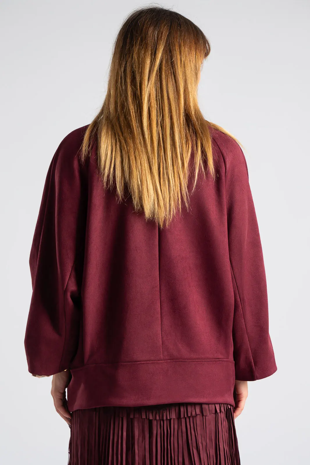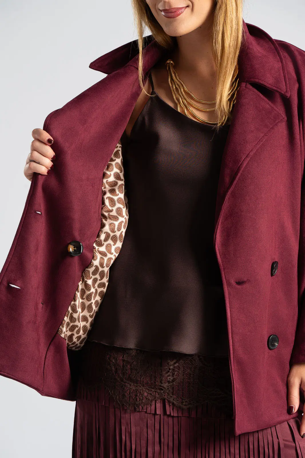 Σακάκι που διαθέτει γιακά και πέτο. Έχει μακριά μανίκια (7/8). Στα πλαινά έχει τσέπες. Σε όλη την επιφάνεια έχει σουέτ υφή. Κλείνει με δύο κουμπιά και έχει δύο διακοσμητικά. Εσωτερικά διαθέτει φόδρα σε paisley print. Η μέτρηση έχει γίνει με κλειστά κουμπιά. Οι μετρήσεις του πίνακα είναι αντιπροσωπευτικές για κάθε κωδικό. 96% polyester, 4% elastan.