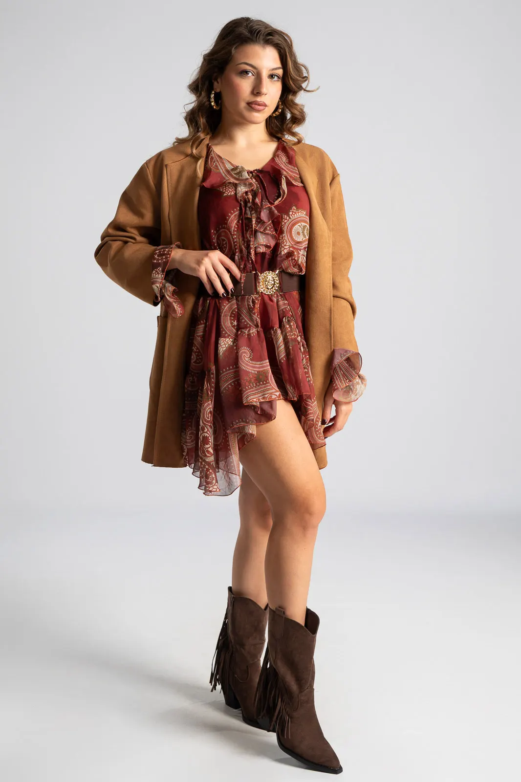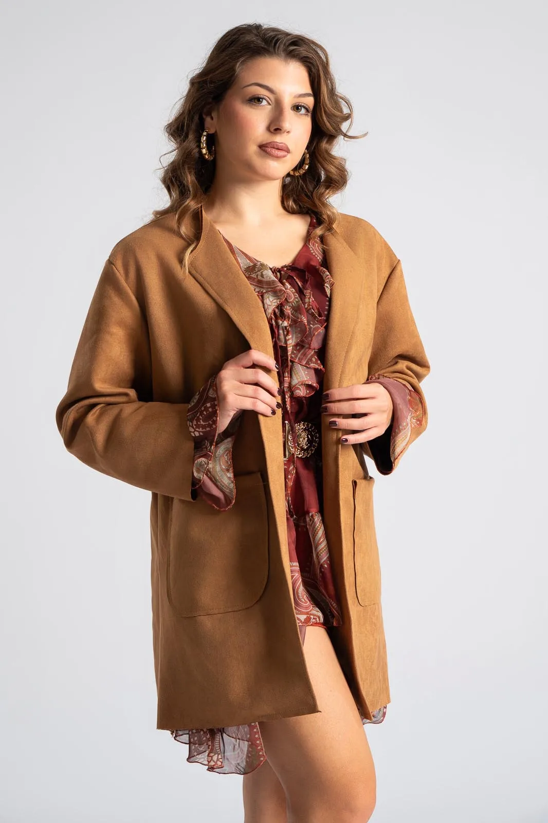 Blazer with mao collar. It has long sleeves. It has square front pockets. It has a suede texture throughout and a comfortable fit. The measurement was taken with the palm open. The measurements in the table are representative for each code. 95% polyester, 5% elastane.