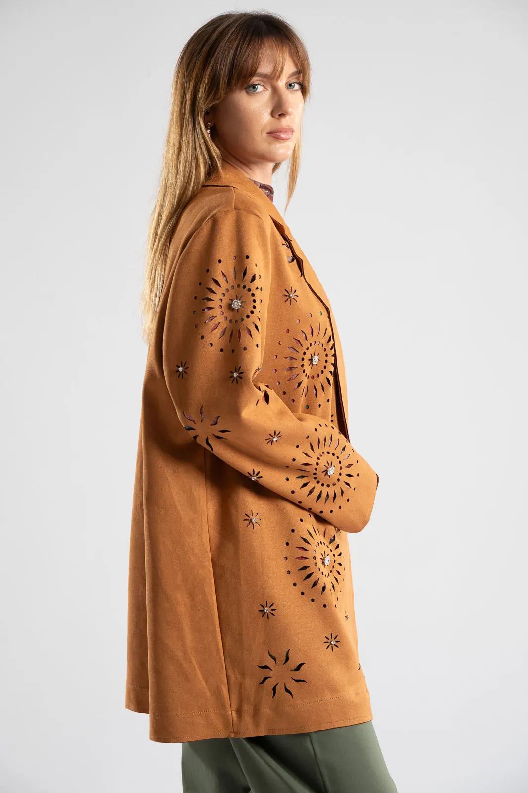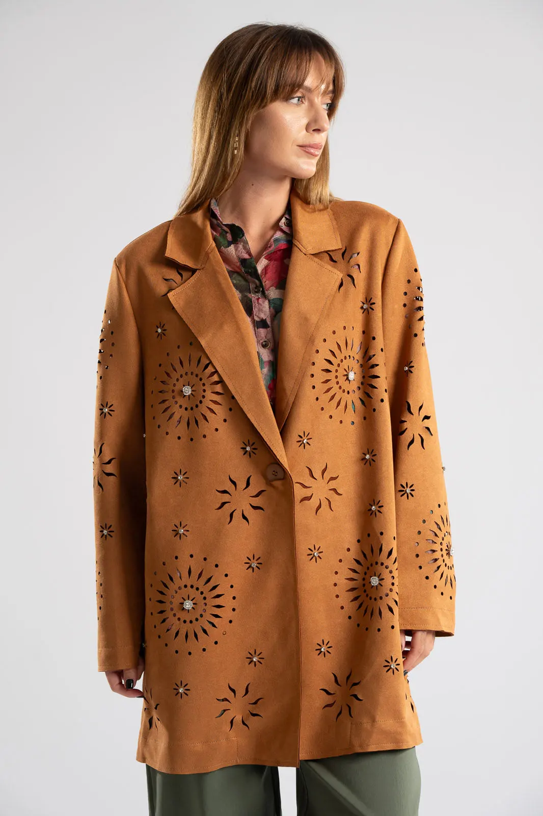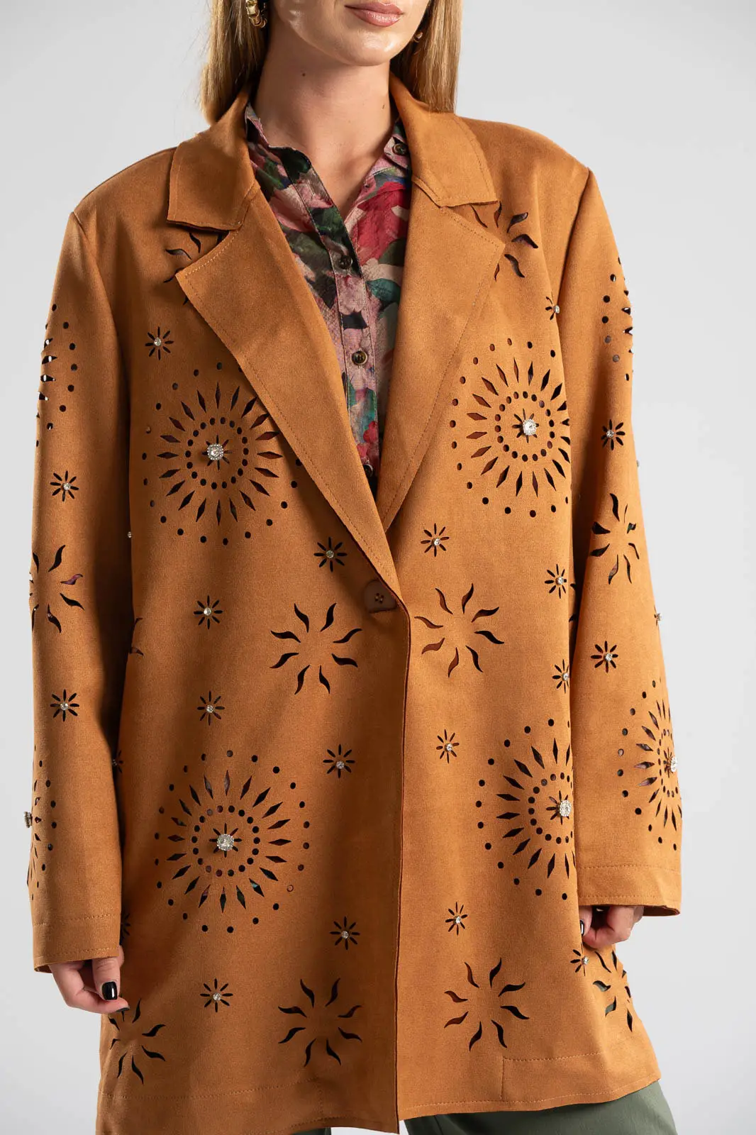 Blazer with collar and lapels. It is perforated and has a suede texture. It fastens with a button and has a straight cut. It is decorated with rhinestones all over. The measurements were taken with the button closed. The measurements in the table are representative for each code. 48% rayon, 28% polyester, 18% nylon, 6% spandex.