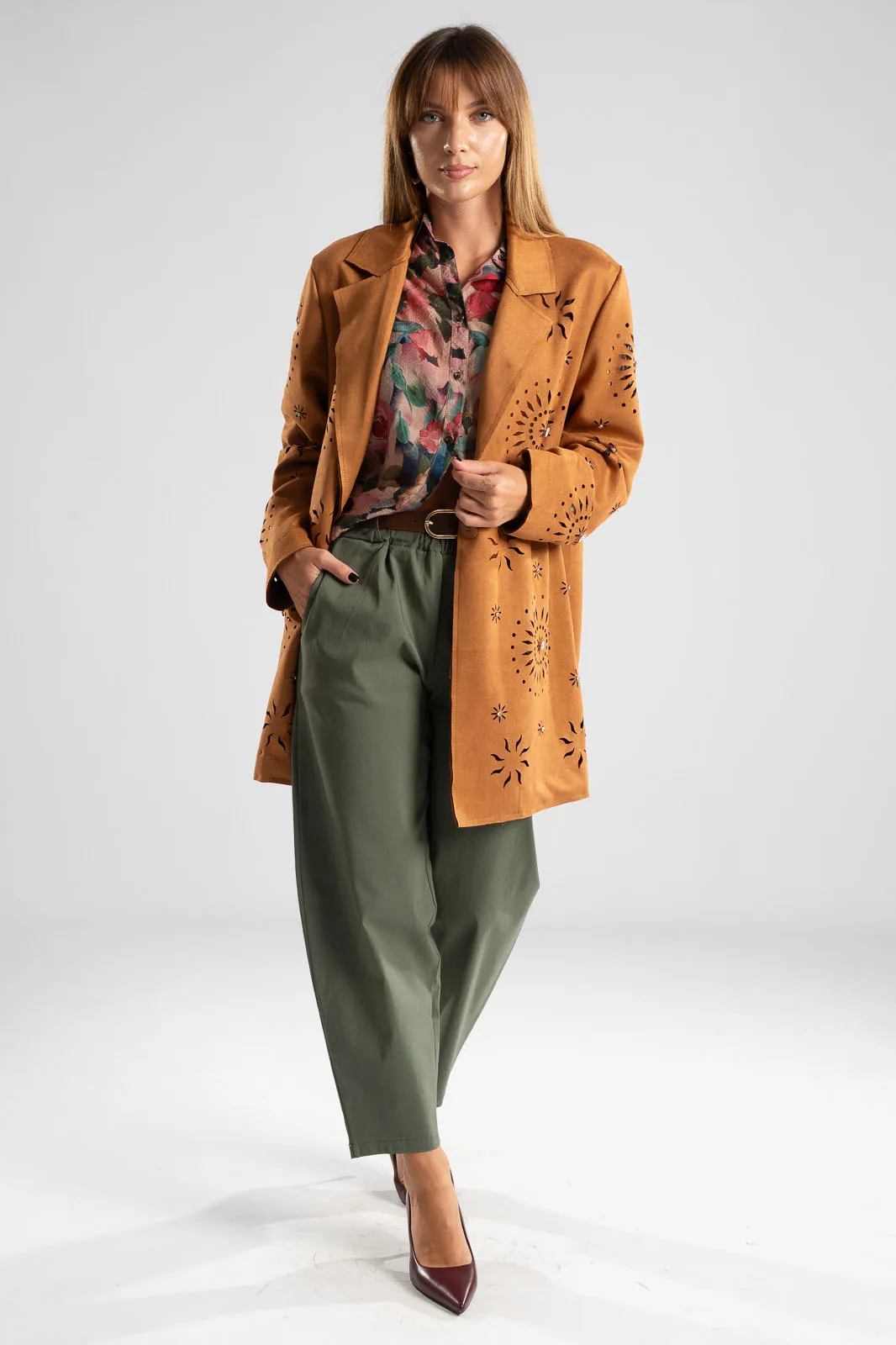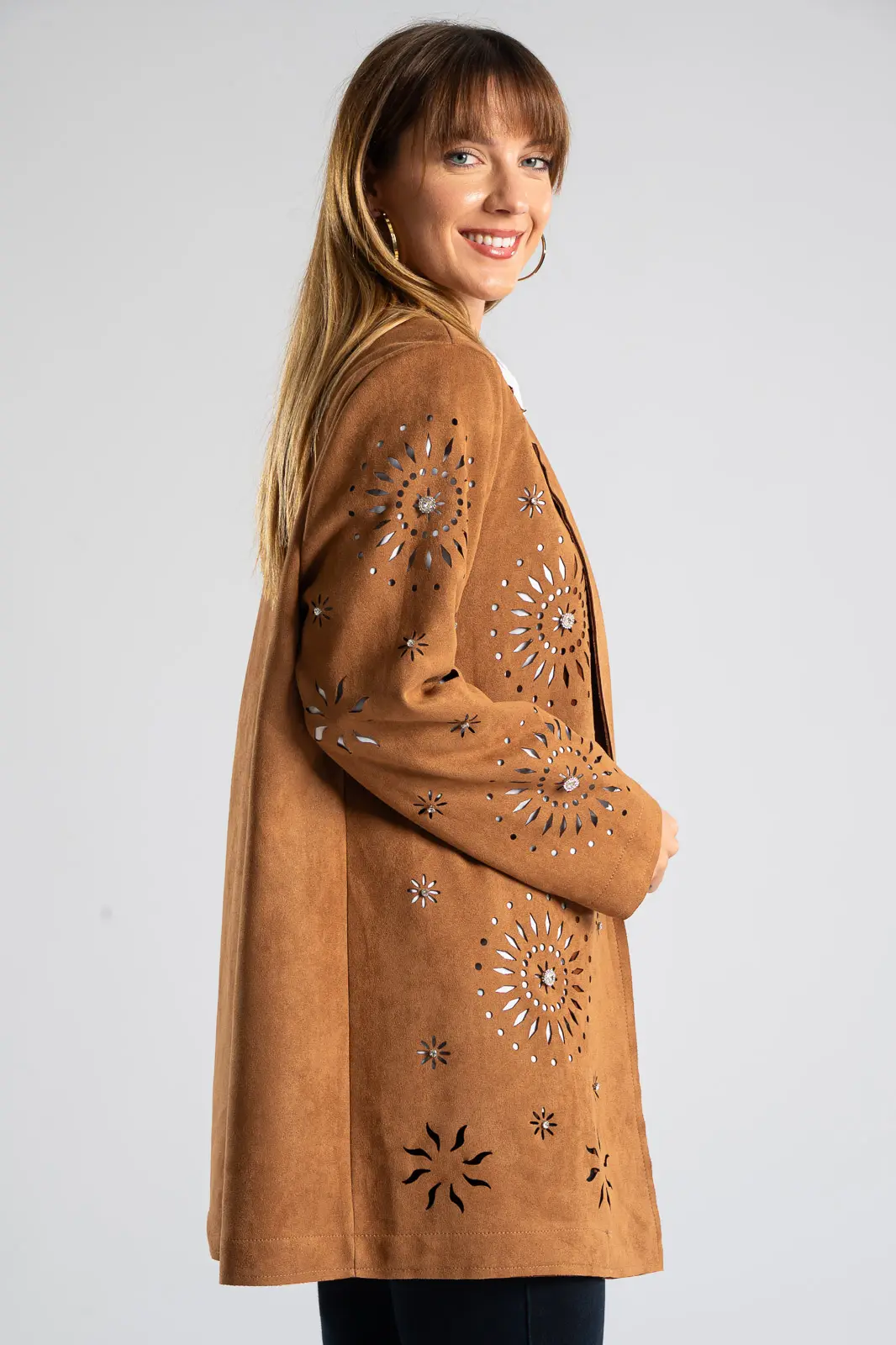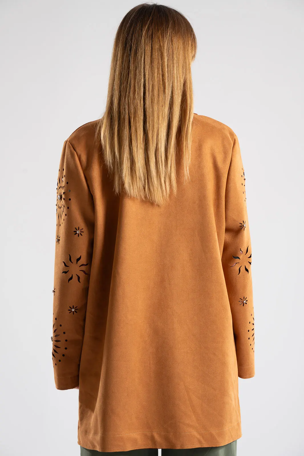 Blazer with collar and lapels. It is perforated and has a suede texture. It fastens with a button and has a straight cut. It is decorated with rhinestones all over. The measurements were taken with the button closed. The measurements in the table are representative for each code. 48% rayon, 28% polyester, 18% nylon, 6% spandex.