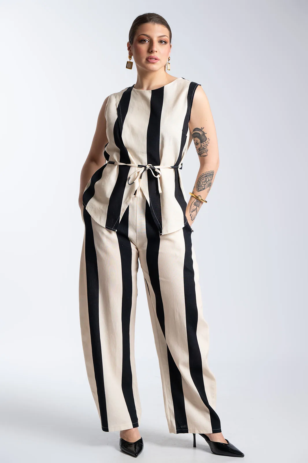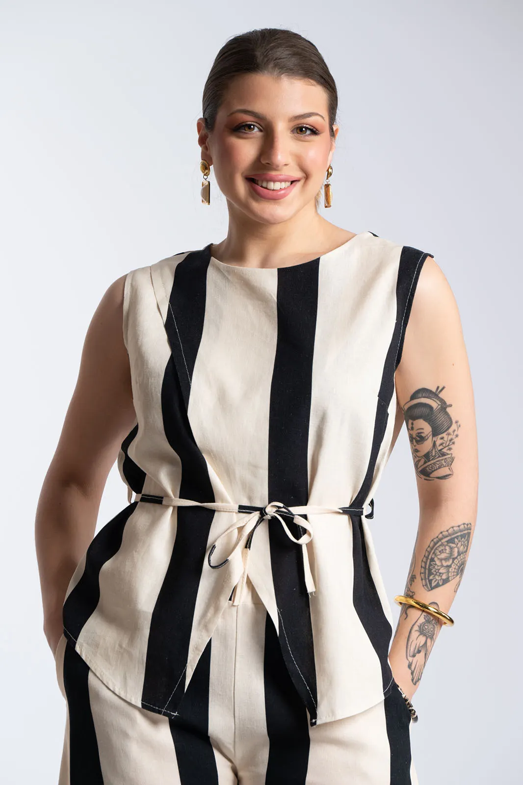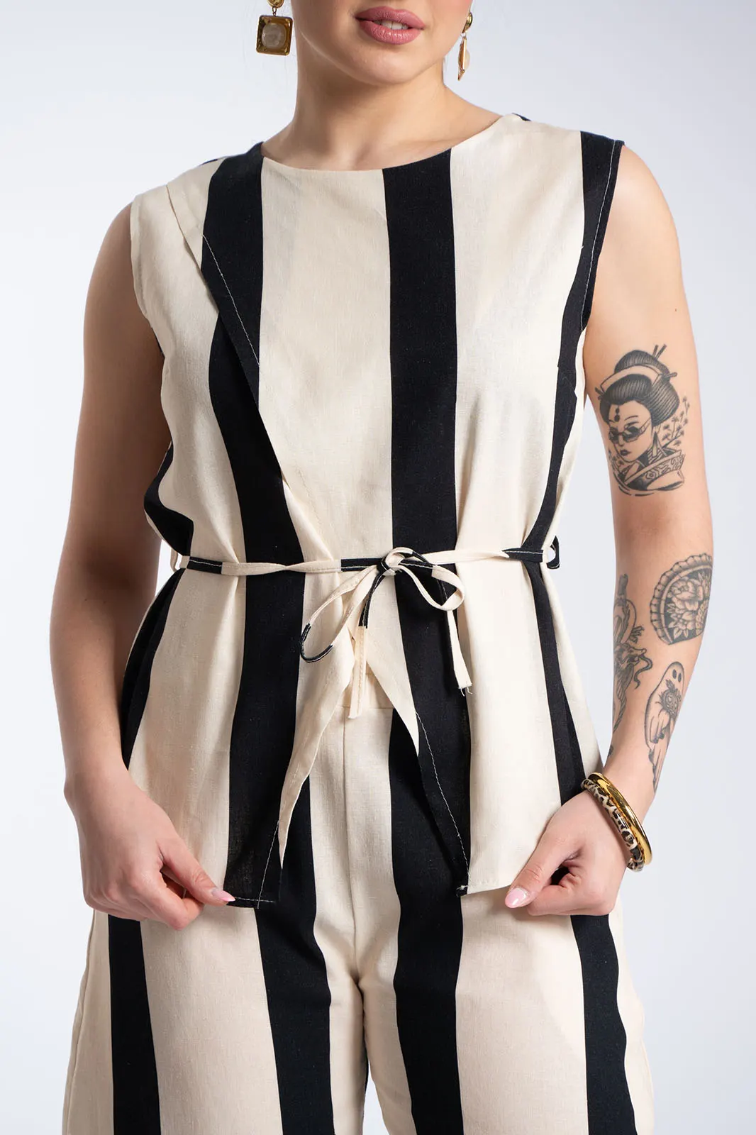 Κομψό και ιδιαίτερο σετ με κάθετες ρίγες που επιμηκύνουν τη σιλουέτα και χαρίζουν μοντέρνο χαρακτήρα. Το top διαθέτει αμάνικο σχέδιο με στρογγυλή λαιμόκοψη και ασύμμετρο κρουαζέ τελείωμα μπροστά. Διαθέτει λεπτό αποσπώμενο κορδόνι για να γίνει μεσάτο, προσθέτοντας μοναδική λεπτομέρεια στο look. Το παντελόνι έχει άνετη γραμμή με λάστιχο στη μέση για τέλεια εφαρμογή και άνεση, ενώ διαθέτει πρακτικές πλαϊνές τσέπες. Οι κάθετες ρίγες δημιουργούν ένα κομψό αποτέλεσμα, ιδανικό για all-day εμφανίσεις.
