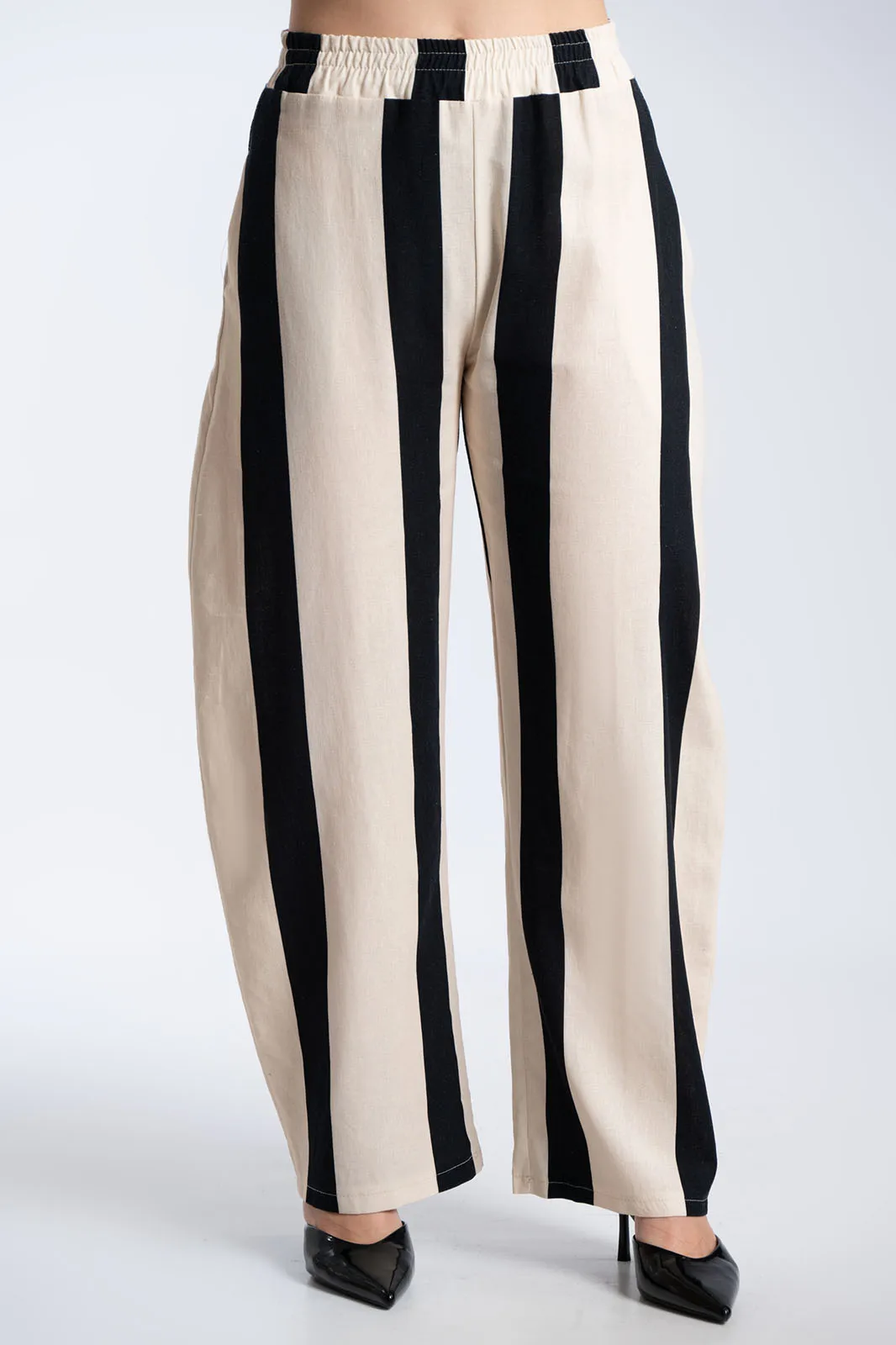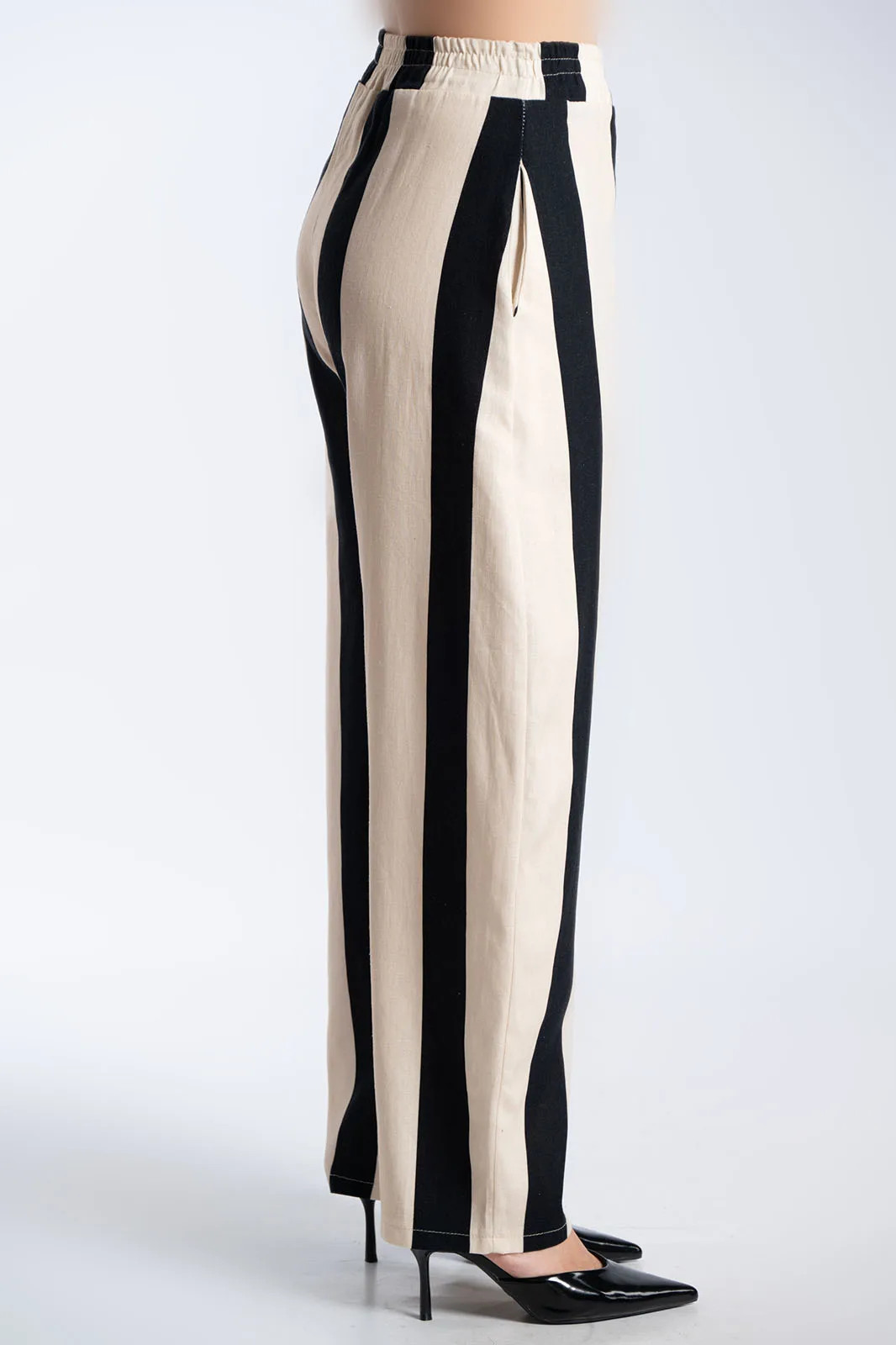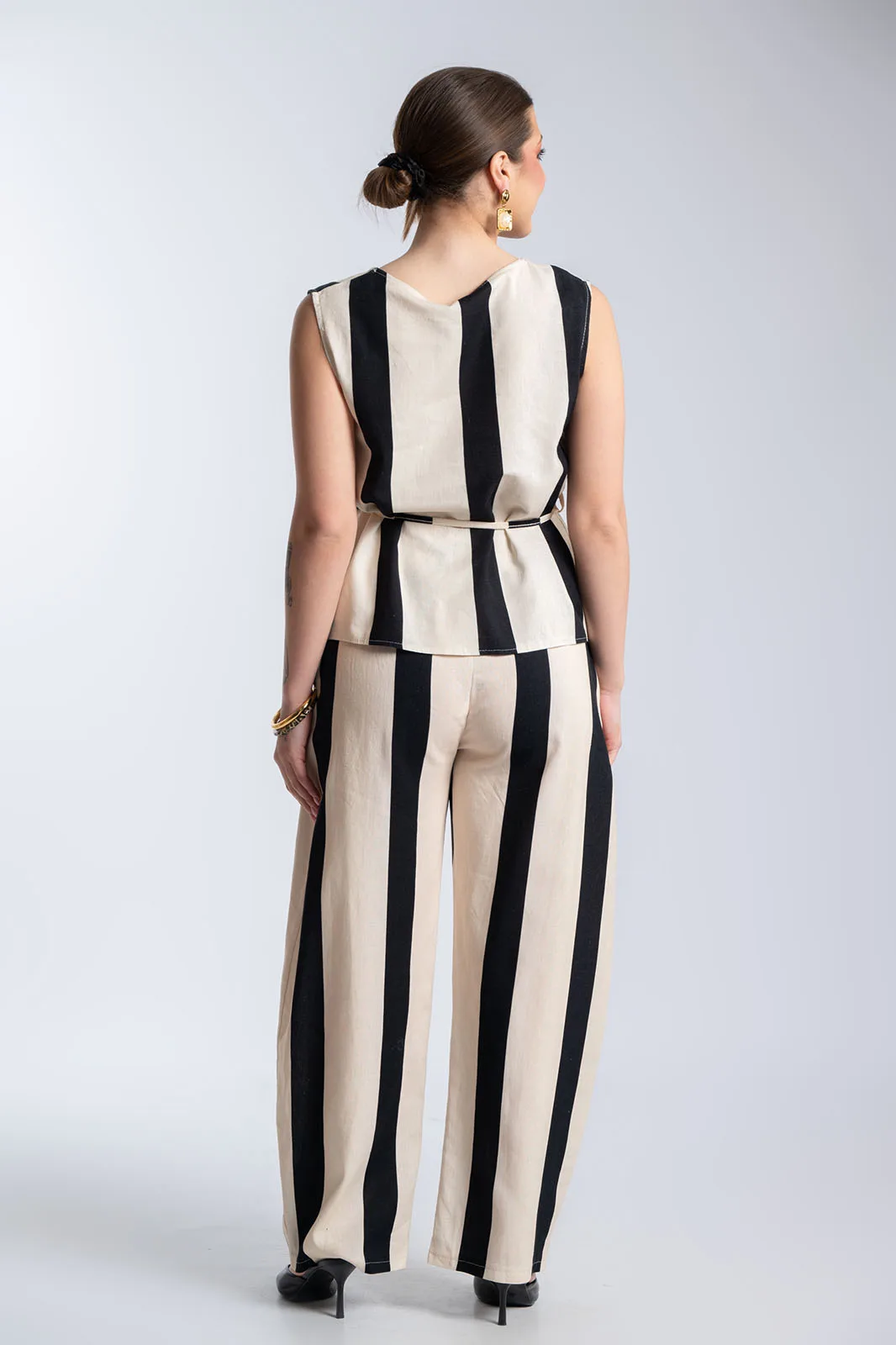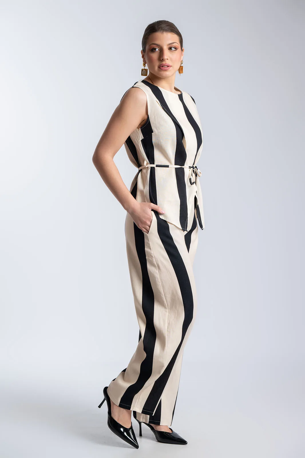 Κομψό και ιδιαίτερο σετ με κάθετες ρίγες που επιμηκύνουν τη σιλουέτα και χαρίζουν μοντέρνο χαρακτήρα. Το top διαθέτει αμάνικο σχέδιο με στρογγυλή λαιμόκοψη και ασύμμετρο κρουαζέ τελείωμα μπροστά. Διαθέτει λεπτό αποσπώμενο κορδόνι για να γίνει μεσάτο, προσθέτοντας μοναδική λεπτομέρεια στο look. Το παντελόνι έχει άνετη γραμμή με λάστιχο στη μέση για τέλεια εφαρμογή και άνεση, ενώ διαθέτει πρακτικές πλαϊνές τσέπες. Οι κάθετες ρίγες δημιουργούν ένα κομψό αποτέλεσμα, ιδανικό για all-day εμφανίσεις.