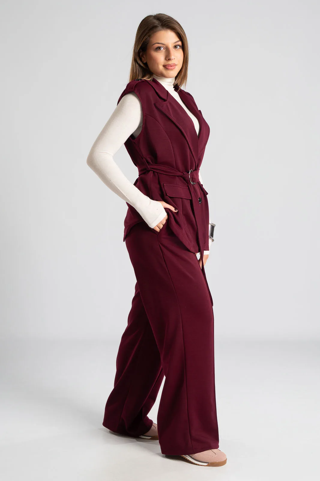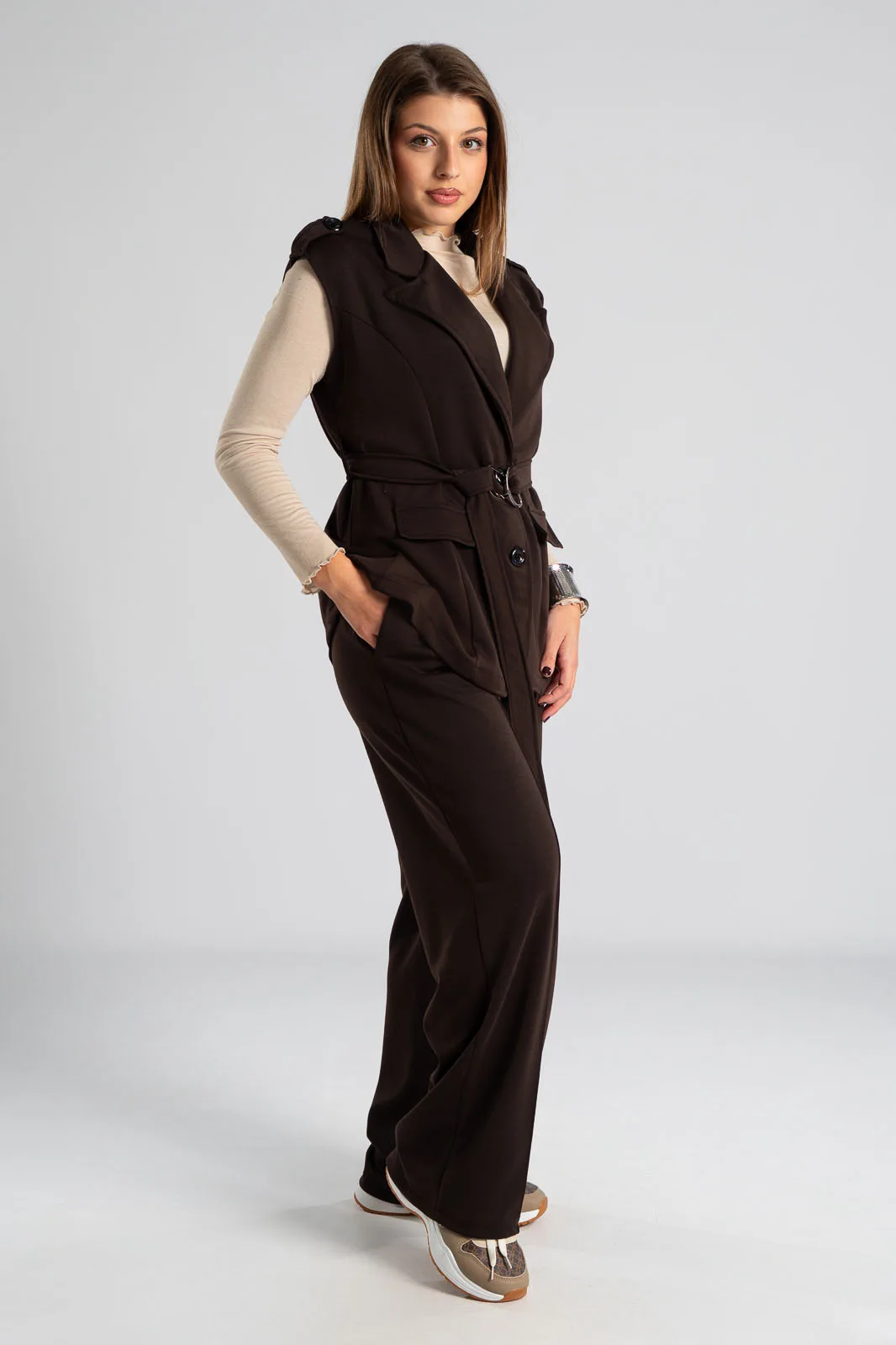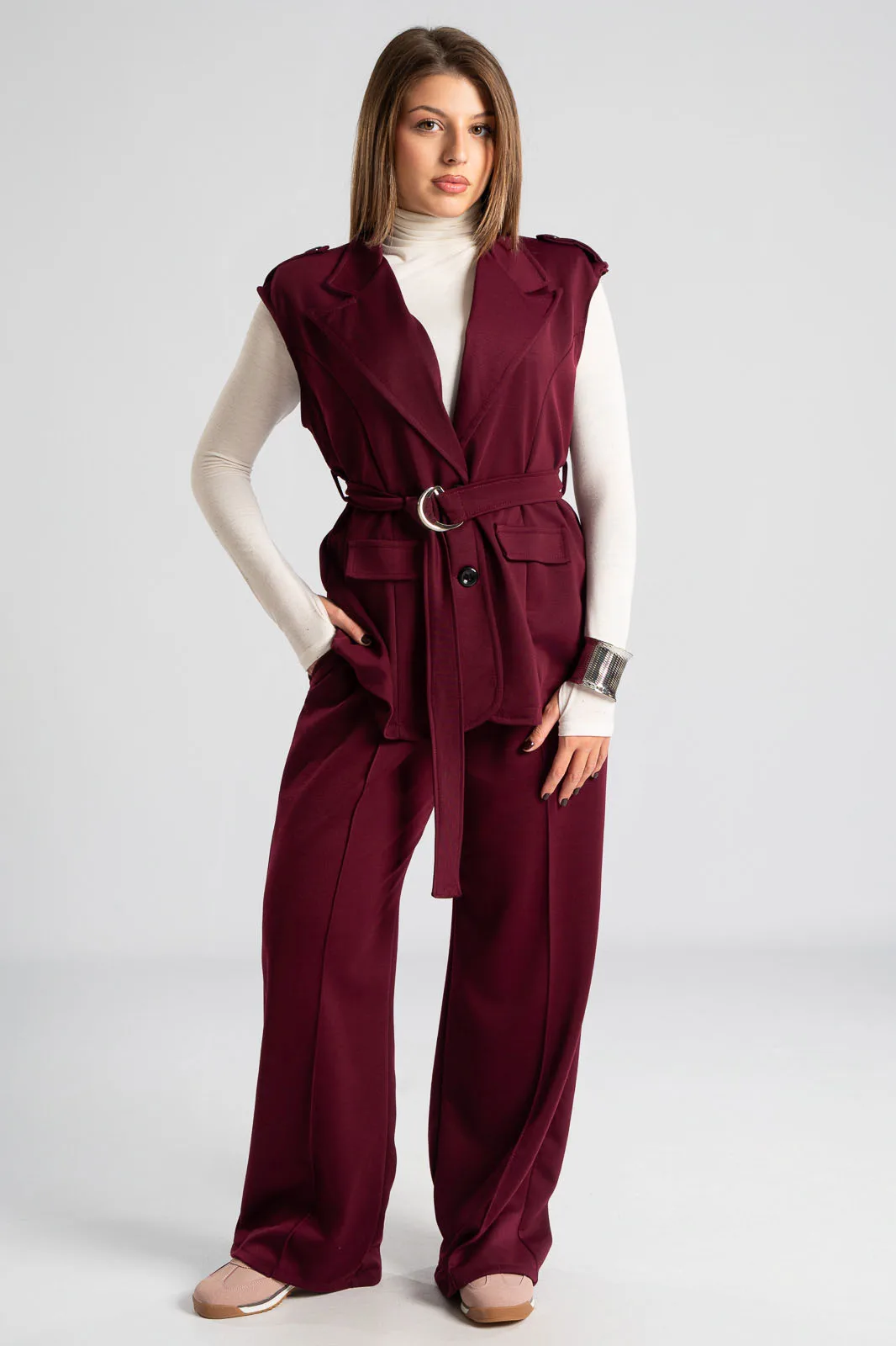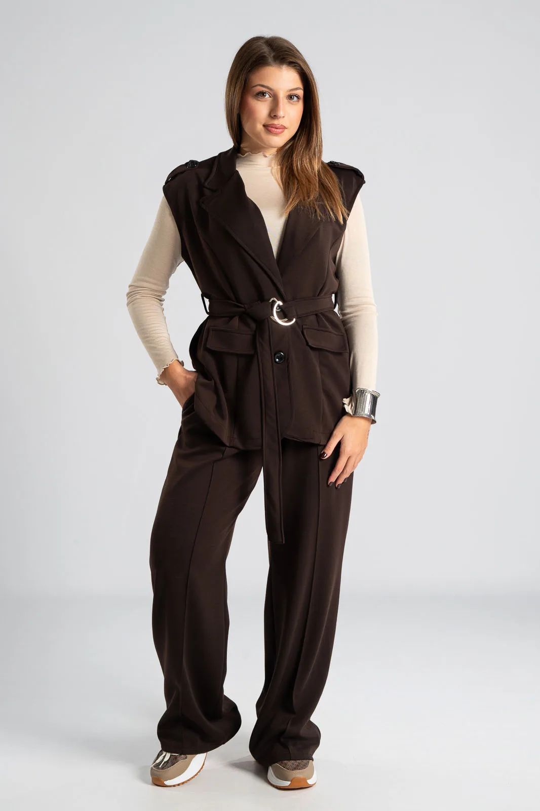 Σετ που αποτελείται από γιλέκο και παντελόνι. Το γιλέκο έχει γιακά και πέτο. Στους ώμους διαθέτει βάτες και κλείνει με κουμπιά. Διαθέτει δική του ζώνη και στο μπροστινό μέρος διαθέτει διακοσμητικό καπάκι τσέπης. Το παντελόνι έχει λάστιχο στη μέση περιμετρικά και κορδόνι για να εφαρμόζει καλύτερα. Είναι σε ίσια γραμμή και στα πλαινά διαθέτει τσέπες. Στο μπροστινό μέρος διαθέτει εξωτερικές ραφές. Οι μετρήσεις του πίνακα είναι αντιπροσωπευτικές για κάθε προϊόν. 55% polyester, 39% viscose, 6% elastan.
