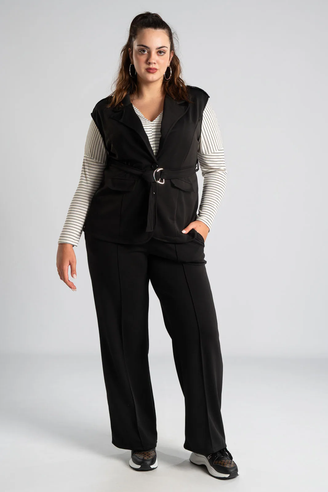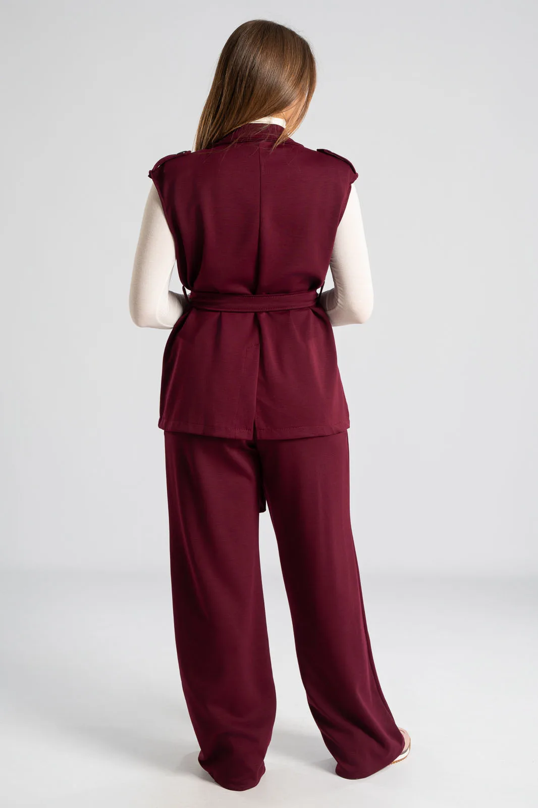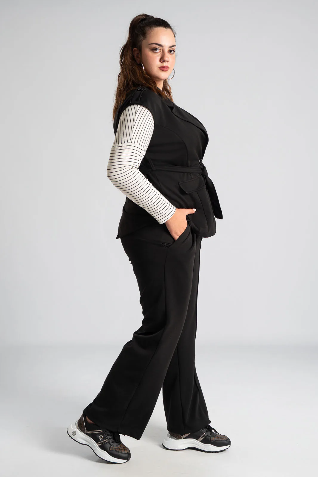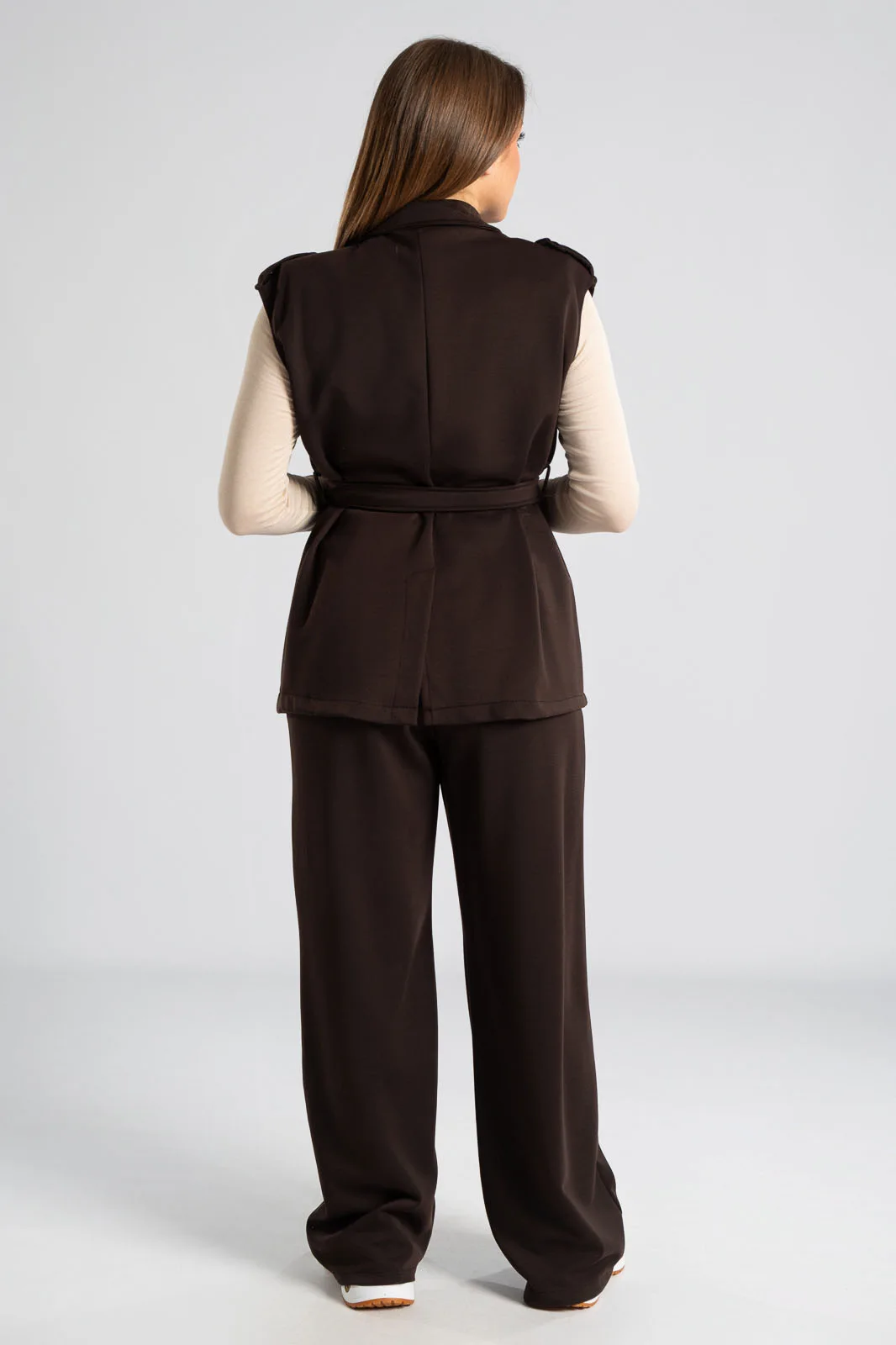 Σετ που αποτελείται από γιλέκο και παντελόνι. Το γιλέκο έχει γιακά και πέτο. Στους ώμους διαθέτει βάτες και κλείνει με κουμπιά. Διαθέτει δική του ζώνη και στο μπροστινό μέρος διαθέτει διακοσμητικό καπάκι τσέπης. Το παντελόνι έχει λάστιχο στη μέση περιμετρικά και κορδόνι για να εφαρμόζει καλύτερα. Είναι σε ίσια γραμμή και στα πλαινά διαθέτει τσέπες. Στο μπροστινό μέρος διαθέτει εξωτερικές ραφές. Οι μετρήσεις του πίνακα είναι αντιπροσωπευτικές για κάθε προϊόν. 55% polyester, 39% viscose, 6% elastan.