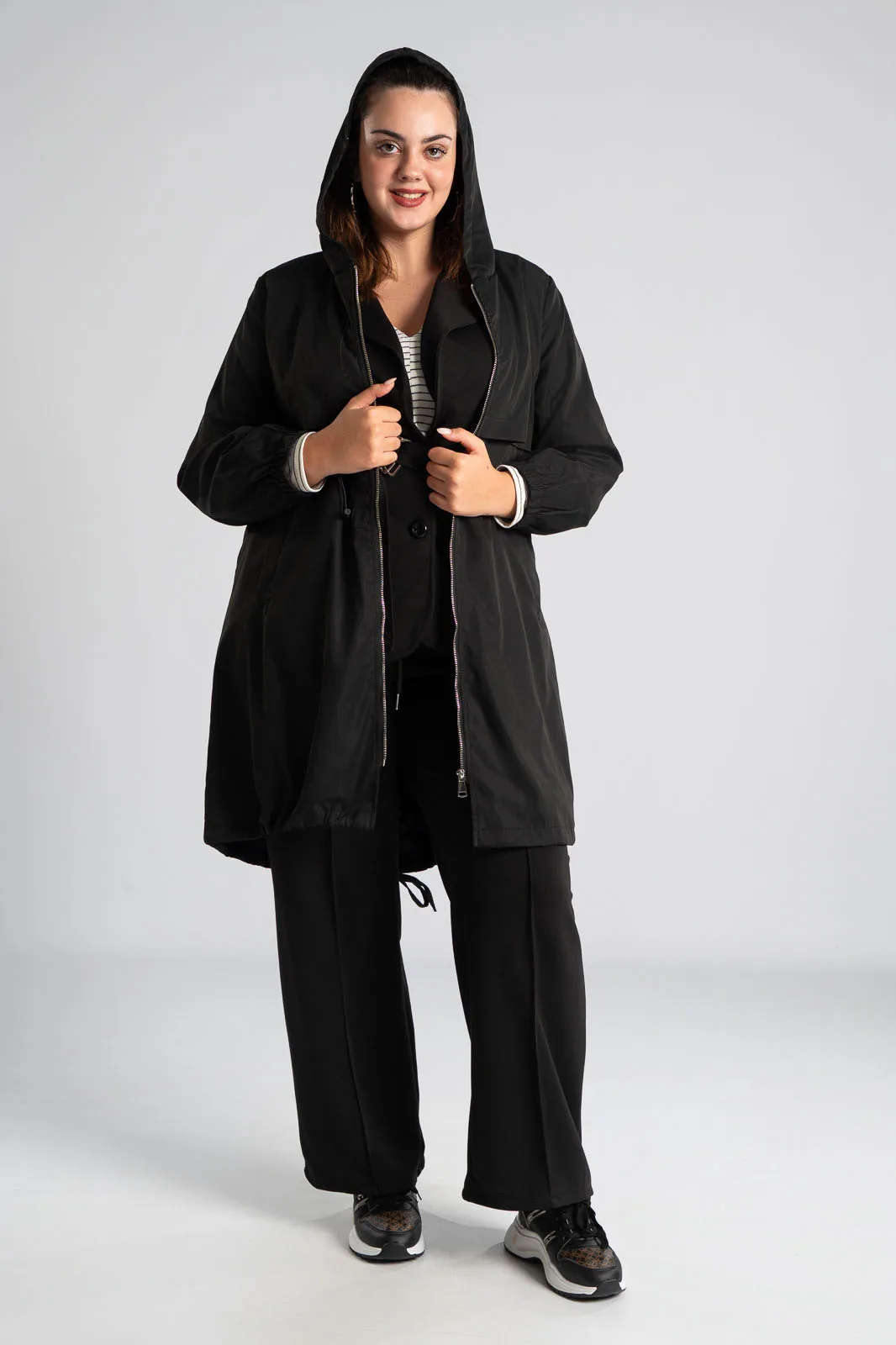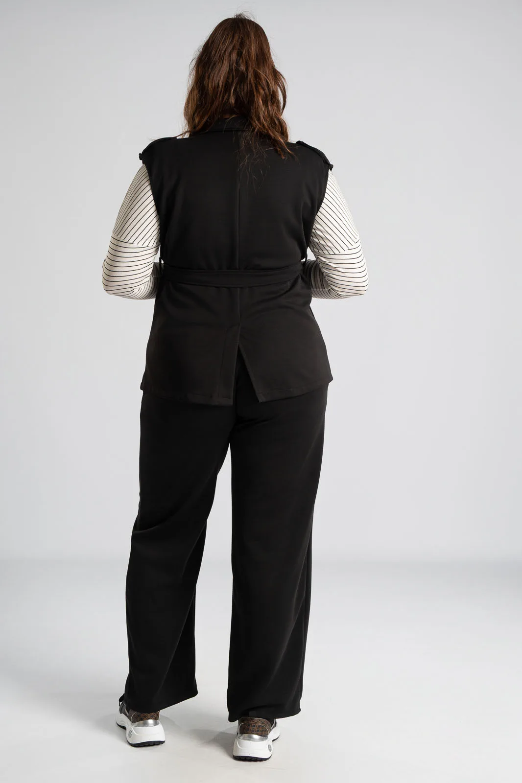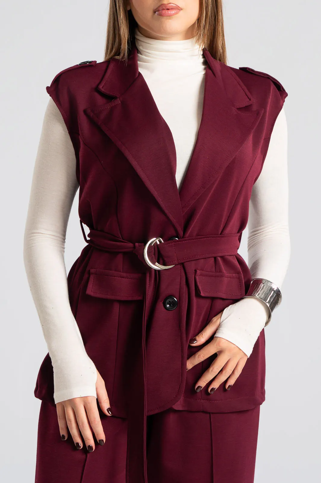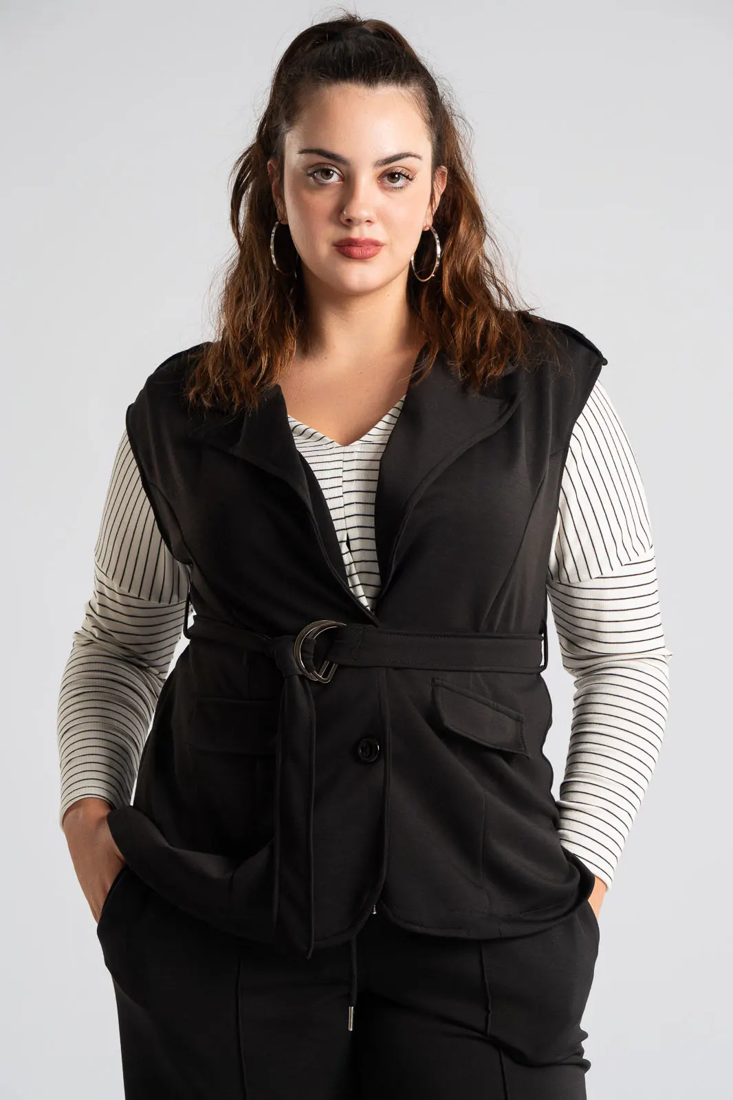 Σετ που αποτελείται από γιλέκο και παντελόνι. Το γιλέκο έχει γιακά και πέτο. Στους ώμους διαθέτει βάτες και κλείνει με κουμπιά. Διαθέτει δική του ζώνη και στο μπροστινό μέρος διαθέτει διακοσμητικό καπάκι τσέπης. Το παντελόνι έχει λάστιχο στη μέση περιμετρικά και κορδόνι για να εφαρμόζει καλύτερα. Είναι σε ίσια γραμμή και στα πλαινά διαθέτει τσέπες. Στο μπροστινό μέρος διαθέτει εξωτερικές ραφές. Οι μετρήσεις του πίνακα είναι αντιπροσωπευτικές για κάθε προϊόν. 55% polyester, 39% viscose, 6% elastan.