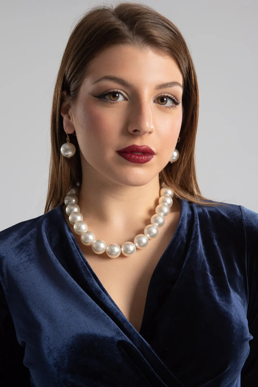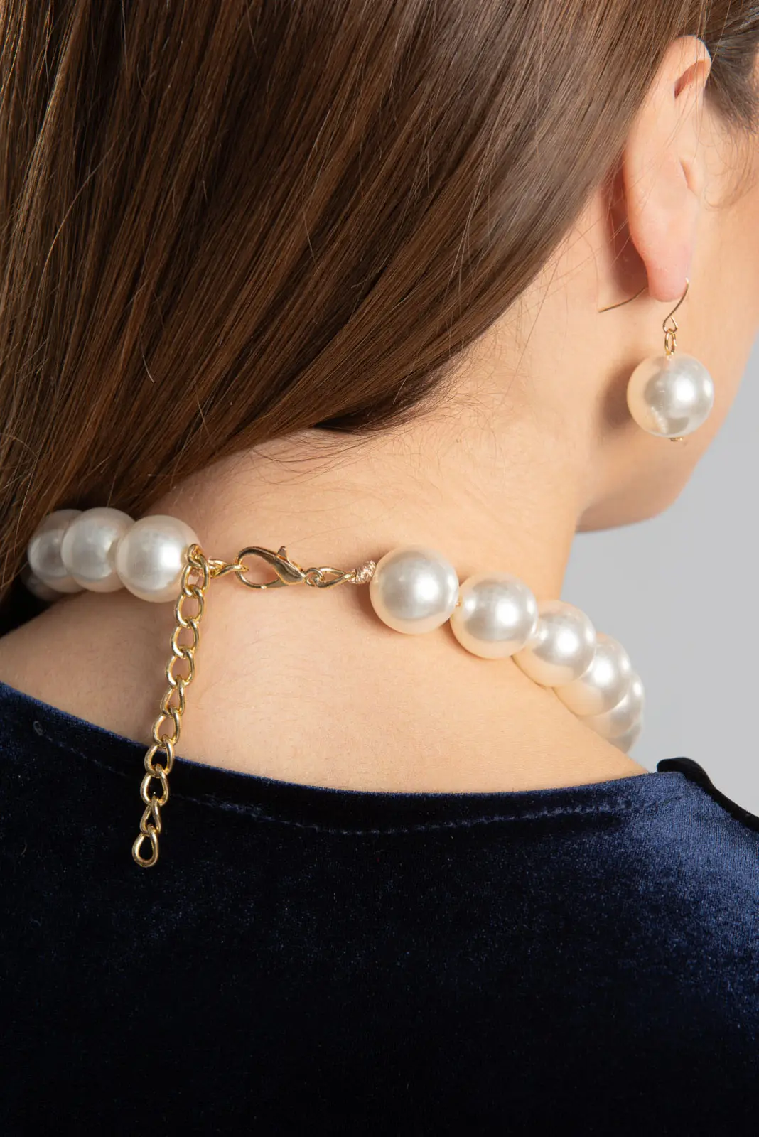 Set consisting of a lace/">necklace and earrings. It is decorated all over with large pearls. It is 44 cm long and has an extra 4 cm extension. The earrings have a large hanging pearl and are hook-type.