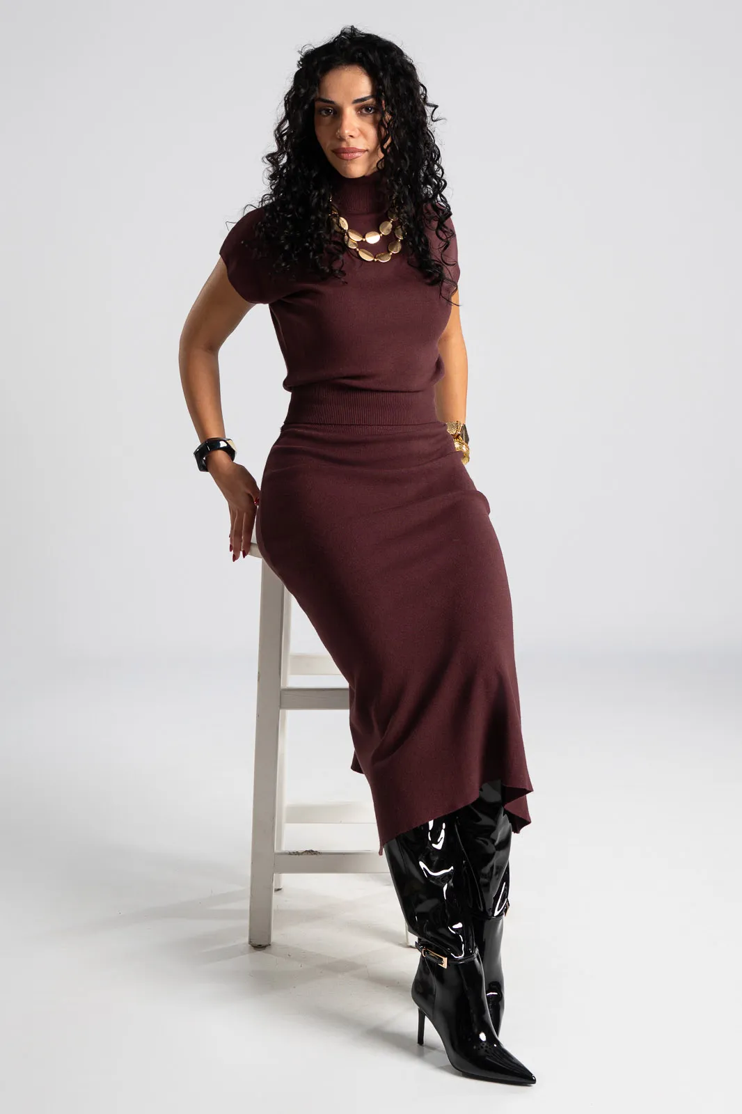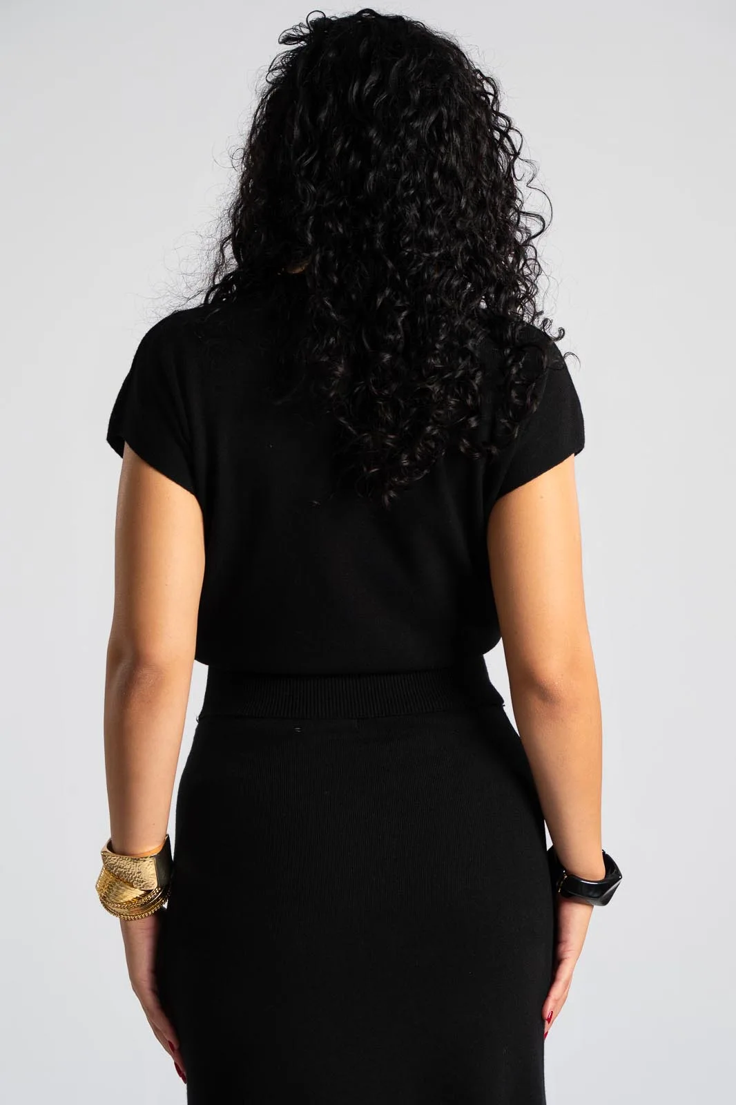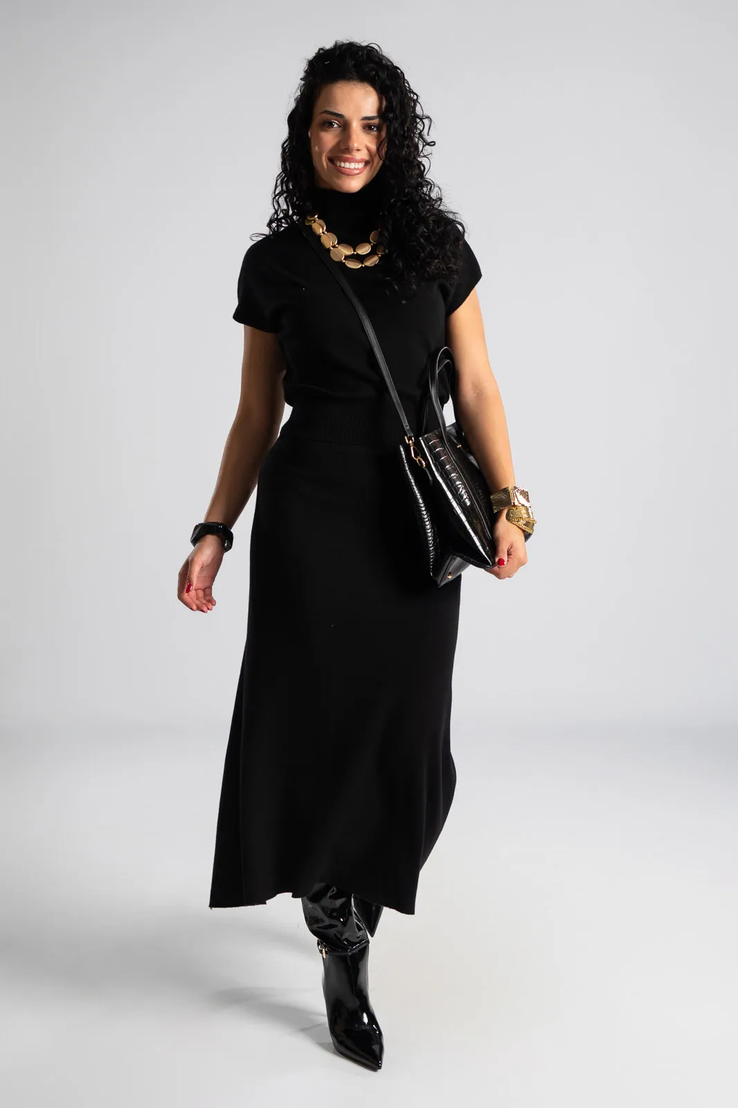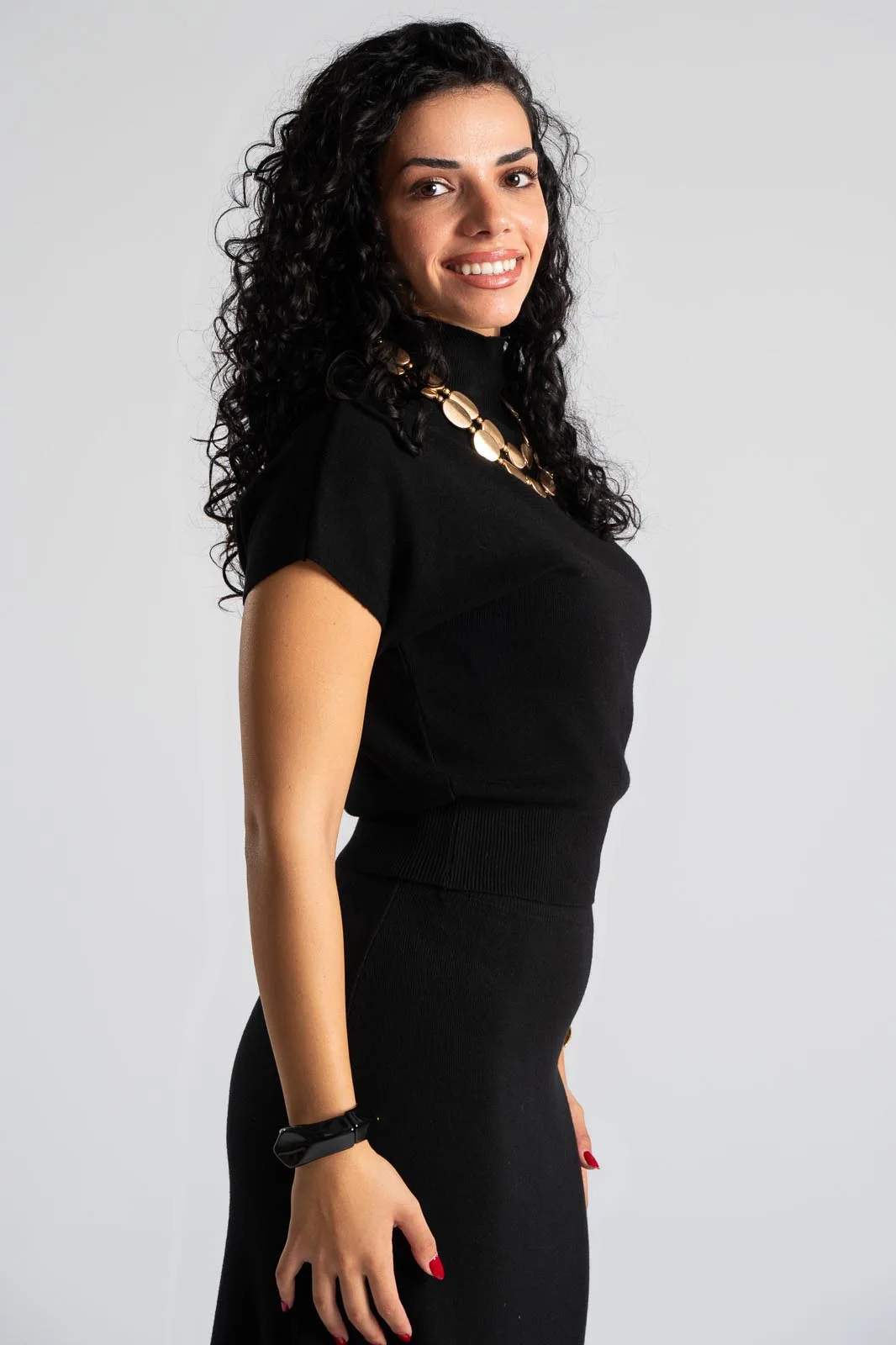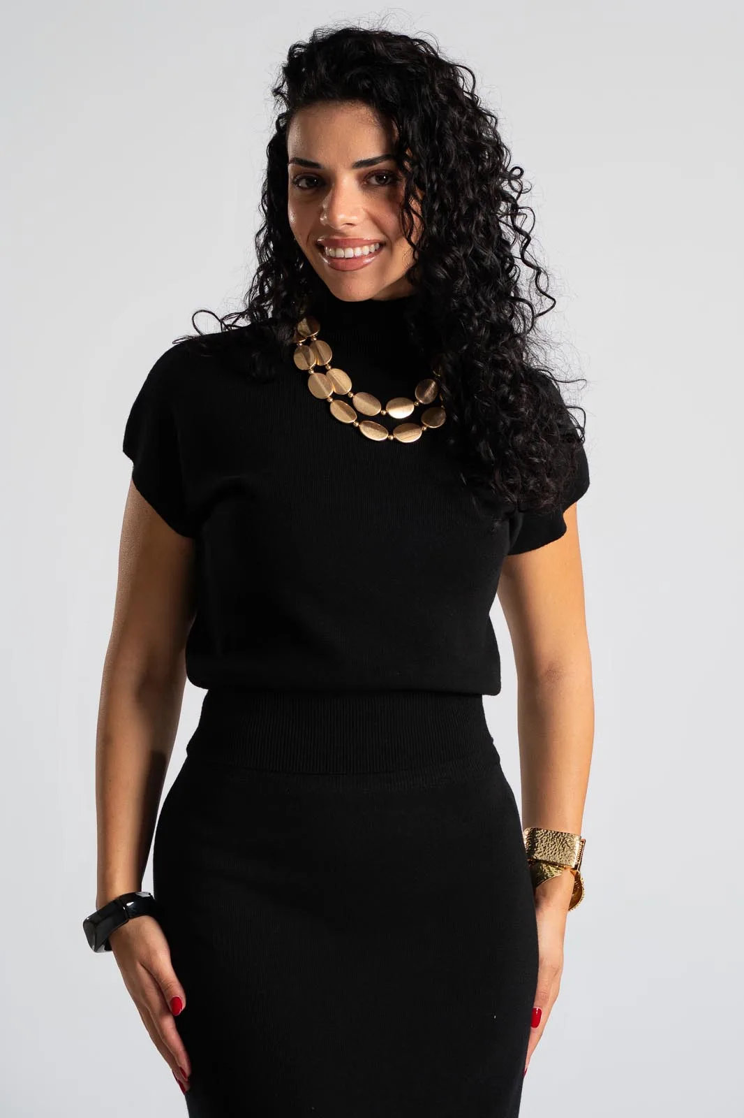 Σετ που αποτελείται από μπλούζα και φούστα σε νημάτινη συμπαγή πλέξη. Η μπλούζα διαθέτει Lupeto λαιμόκοψη και έχει κοντά μανίκια. Στο τελείωμα της διαθέτει λάστιχο φαρδύ για καλύτερη εφαρμογή. Η φούστα έχει λάστιχο στη μέση και είναι σε γραμμή Α.  Οι μετρήσεις του πίνακα είναι αντιπροσωπευτικές για κάθε προϊόν. 88% viscose, 12% nylon.