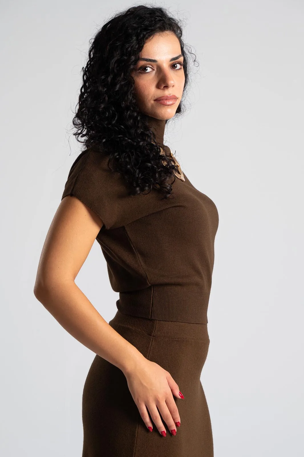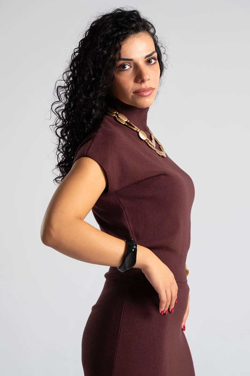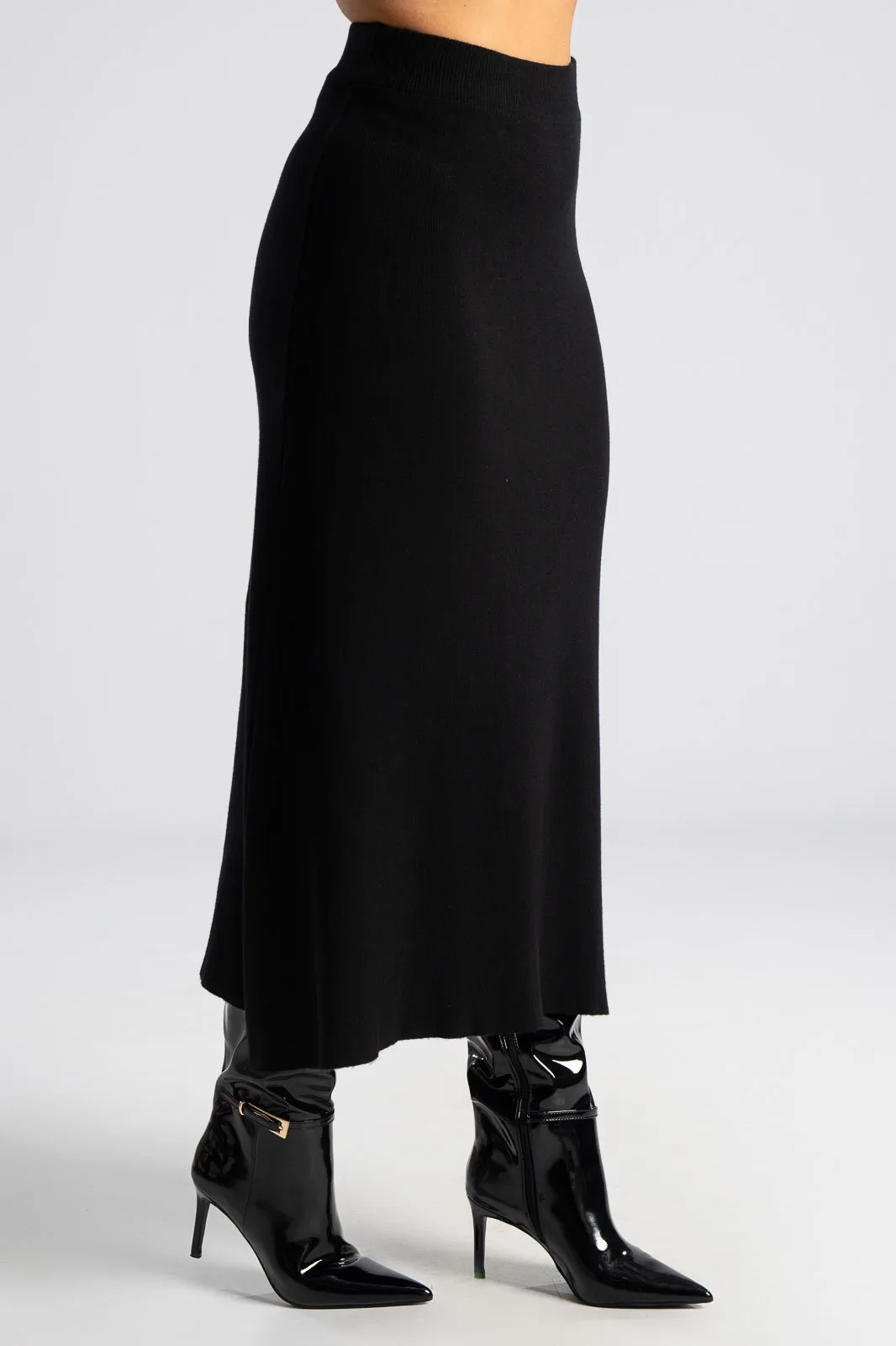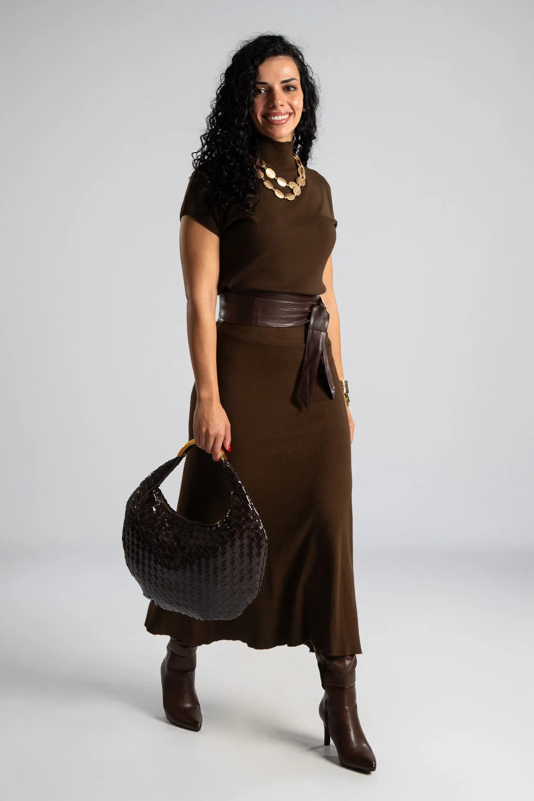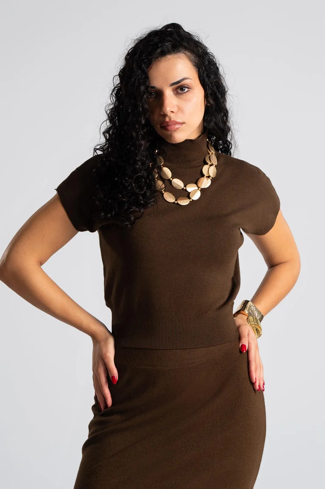 Σετ που αποτελείται από μπλούζα και φούστα σε νημάτινη συμπαγή πλέξη. Η μπλούζα διαθέτει Lupeto λαιμόκοψη και έχει κοντά μανίκια. Στο τελείωμα της διαθέτει λάστιχο φαρδύ για καλύτερη εφαρμογή. Η φούστα έχει λάστιχο στη μέση και είναι σε γραμμή Α.  Οι μετρήσεις του πίνακα είναι αντιπροσωπευτικές για κάθε προϊόν. 88% viscose, 12% nylon.