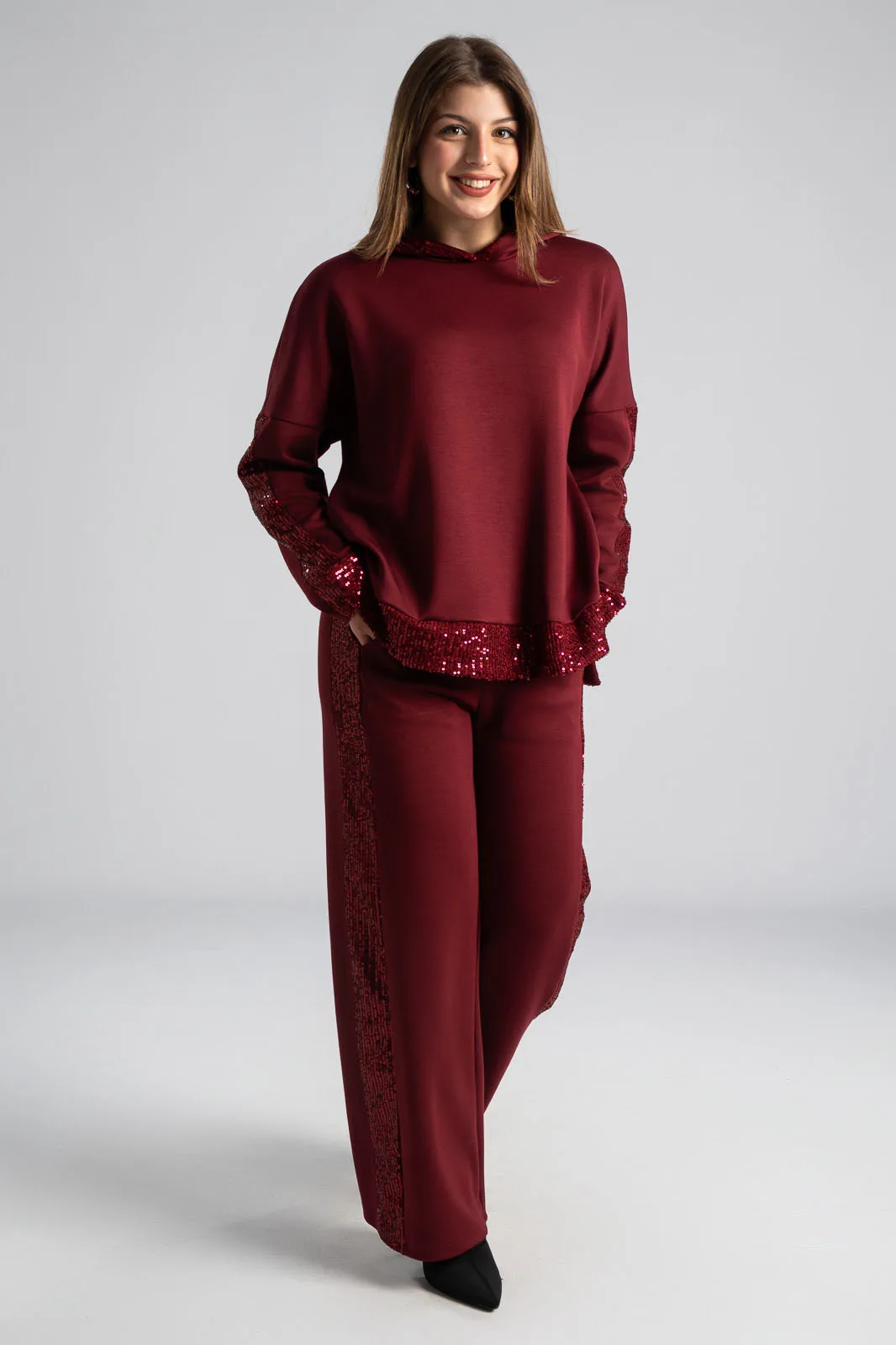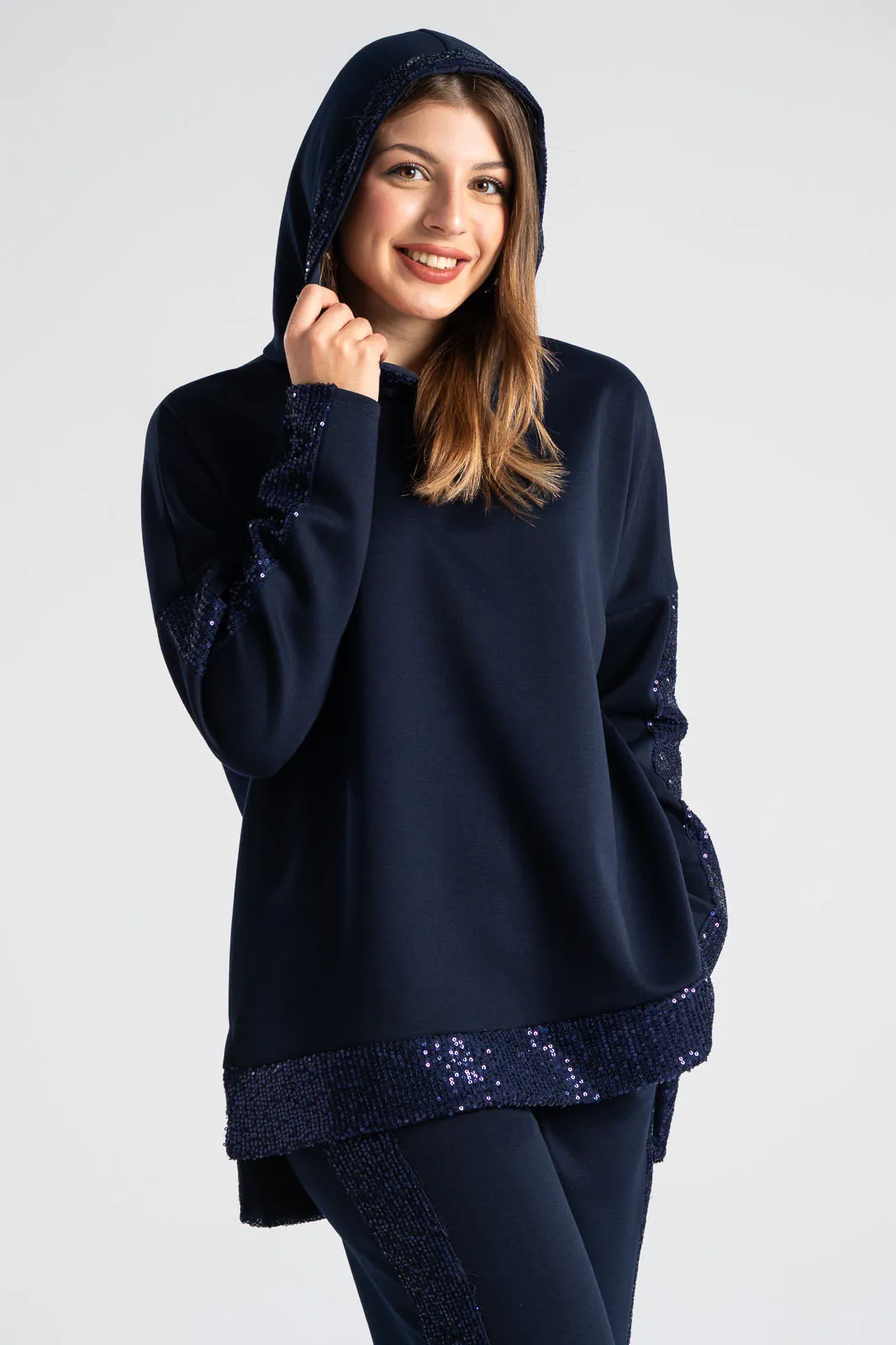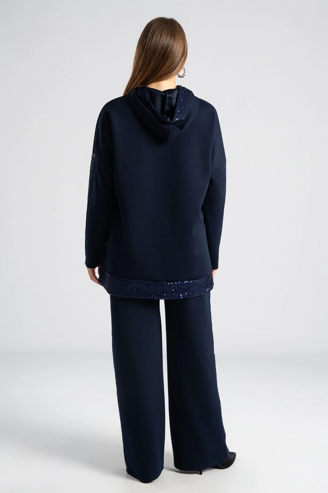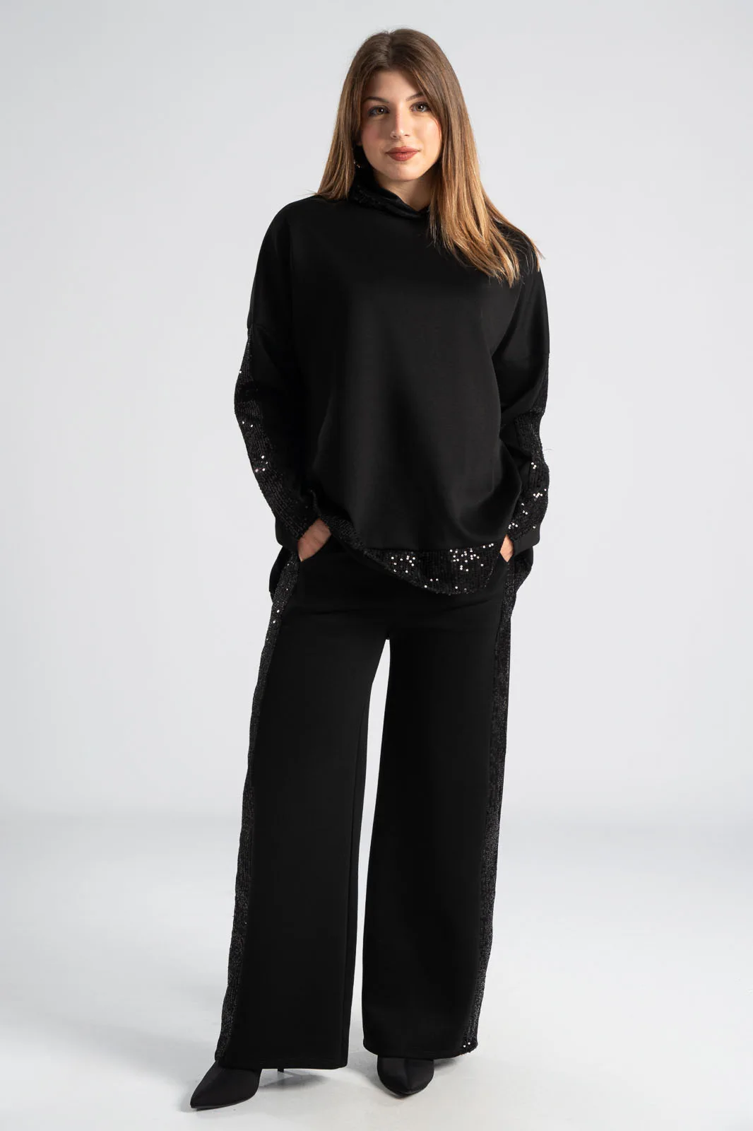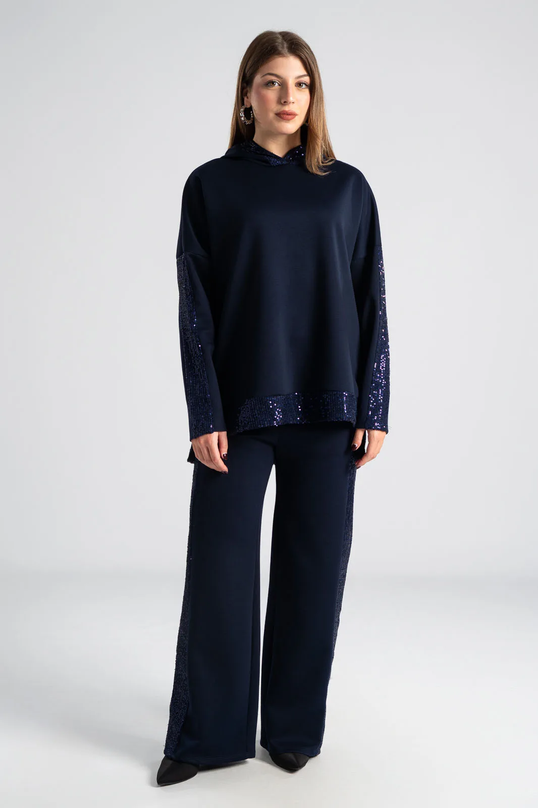 Σετ που αποτελείται από μπλούζα και παντελόνι. Η μπλούζα διαθέτει κουκούλα. Έχει μακριά μανίκια. Περιμετρικά της κουκούλας, στα μανίκια και στο τελείωμα διαθέτει διακοσμητικές παγιέτες. Το πίσω μέρος είναι ελαφρώς μακρύτερο. Το παντελόνι έχει λάστιχο στη μέση. Έχει πλαινές τσέπες. Στα πλαινά της φόρμας διαθέτει μια γραμμή με διακοσμητικές παγιέτες. Οι μετρήσεις του πίνακα είναι αντιπροσωπευτικές για κάθε προϊόν. 50% viscose, 45% polyester, 5% elastan.