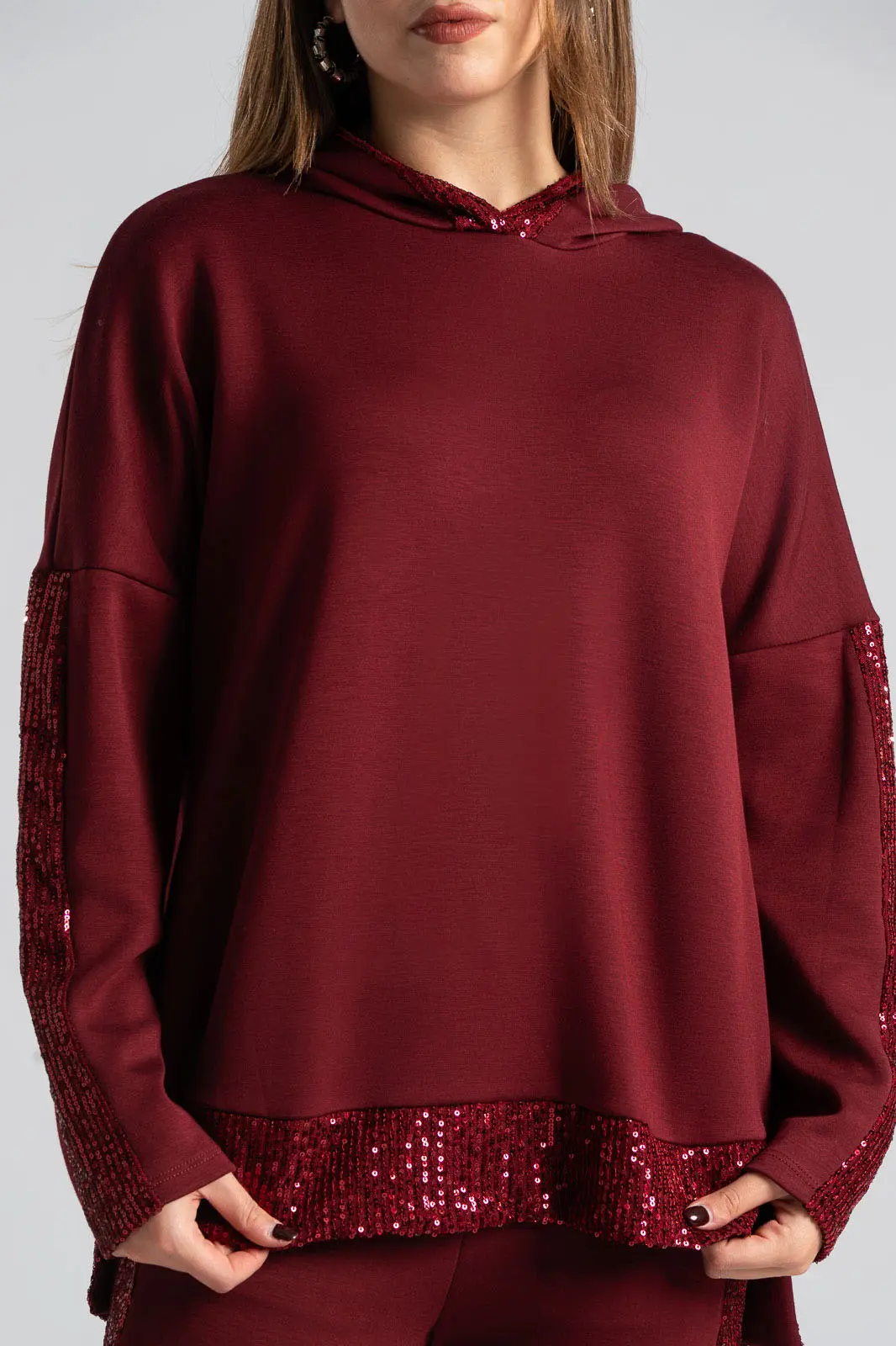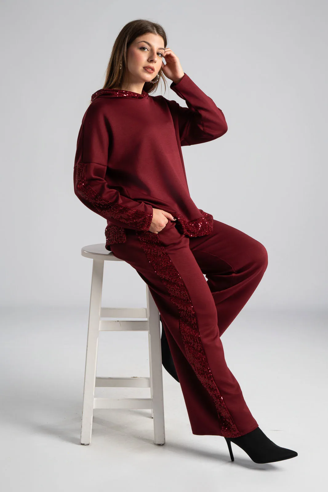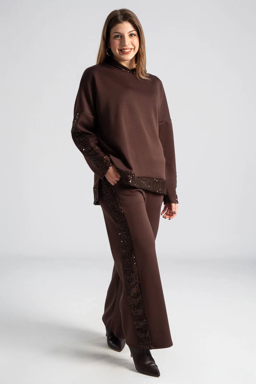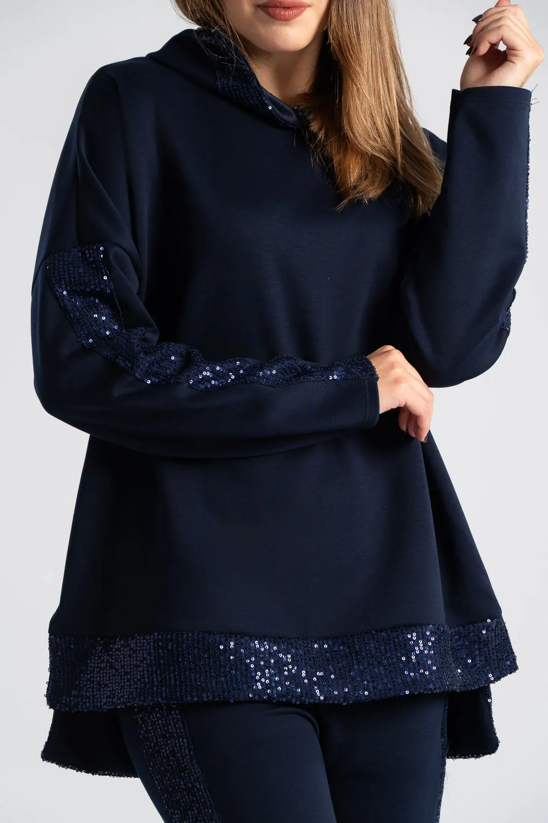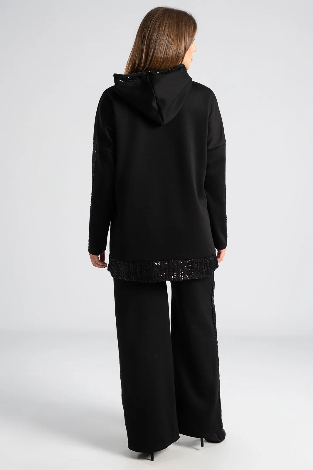 Σετ που αποτελείται από μπλούζα και παντελόνι. Η μπλούζα διαθέτει κουκούλα. Έχει μακριά μανίκια. Περιμετρικά της κουκούλας, στα μανίκια και στο τελείωμα διαθέτει διακοσμητικές παγιέτες. Το πίσω μέρος είναι ελαφρώς μακρύτερο. Το παντελόνι έχει λάστιχο στη μέση. Έχει πλαινές τσέπες. Στα πλαινά της φόρμας διαθέτει μια γραμμή με διακοσμητικές παγιέτες. Οι μετρήσεις του πίνακα είναι αντιπροσωπευτικές για κάθε προϊόν. 50% viscose, 45% polyester, 5% elastan.