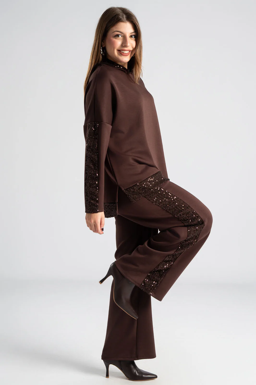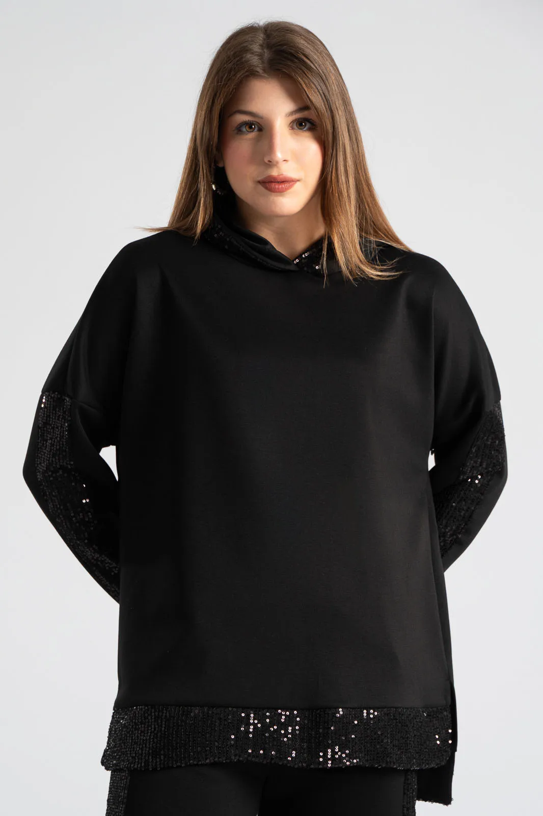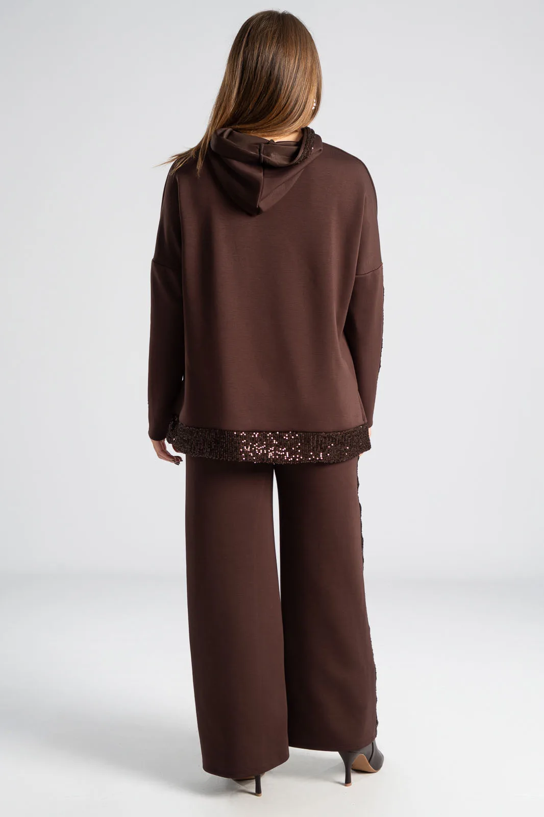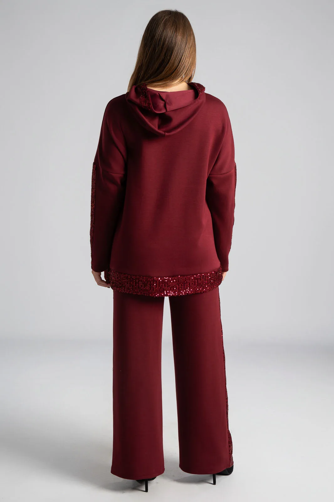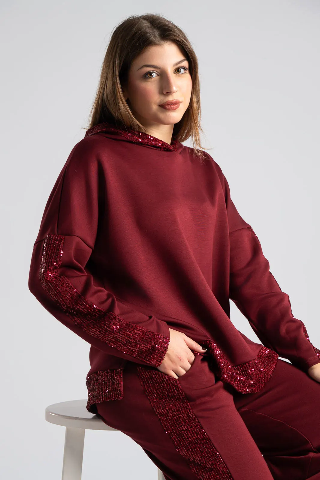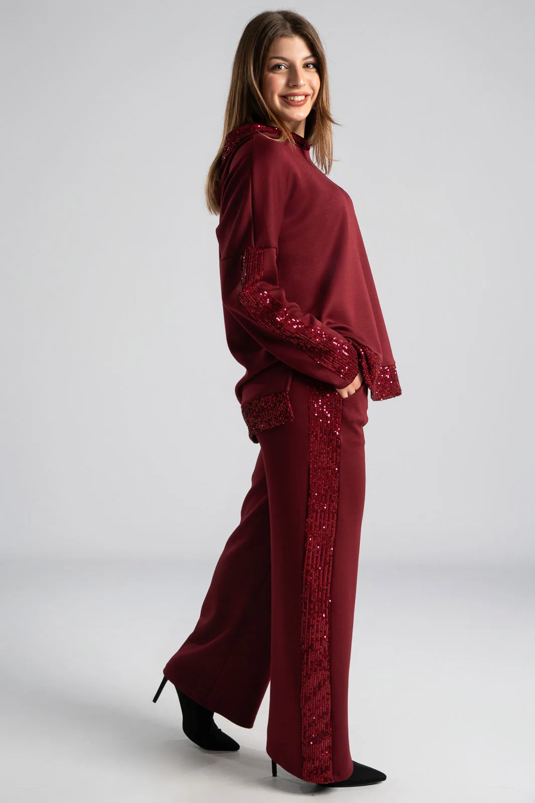 Σετ που αποτελείται από μπλούζα και παντελόνι. Η μπλούζα διαθέτει κουκούλα. Έχει μακριά μανίκια. Περιμετρικά της κουκούλας, στα μανίκια και στο τελείωμα διαθέτει διακοσμητικές παγιέτες. Το πίσω μέρος είναι ελαφρώς μακρύτερο. Το παντελόνι έχει λάστιχο στη μέση. Έχει πλαινές τσέπες. Στα πλαινά της φόρμας διαθέτει μια γραμμή με διακοσμητικές παγιέτες. Οι μετρήσεις του πίνακα είναι αντιπροσωπευτικές για κάθε προϊόν. 50% viscose, 45% polyester, 5% elastan.