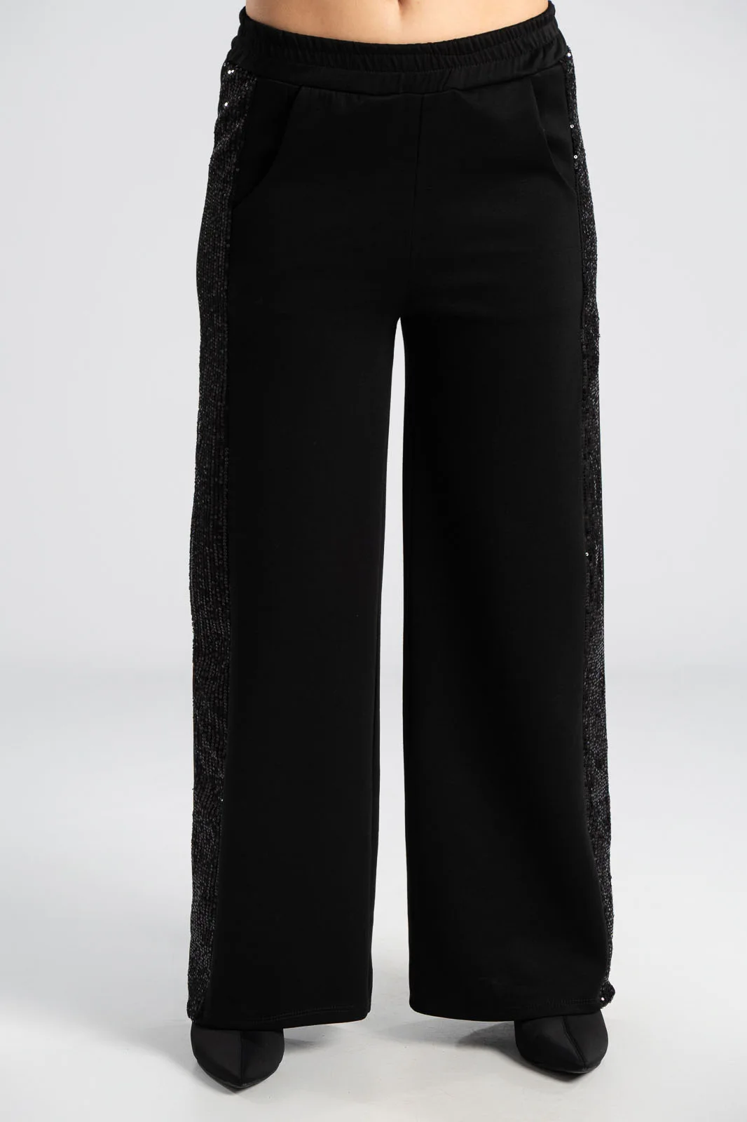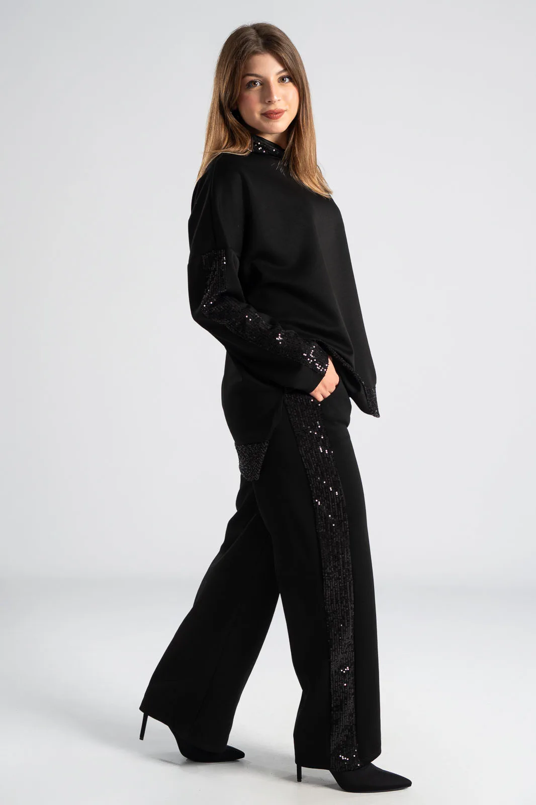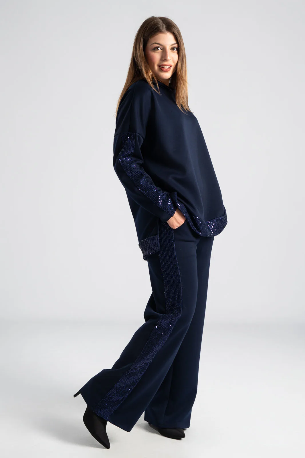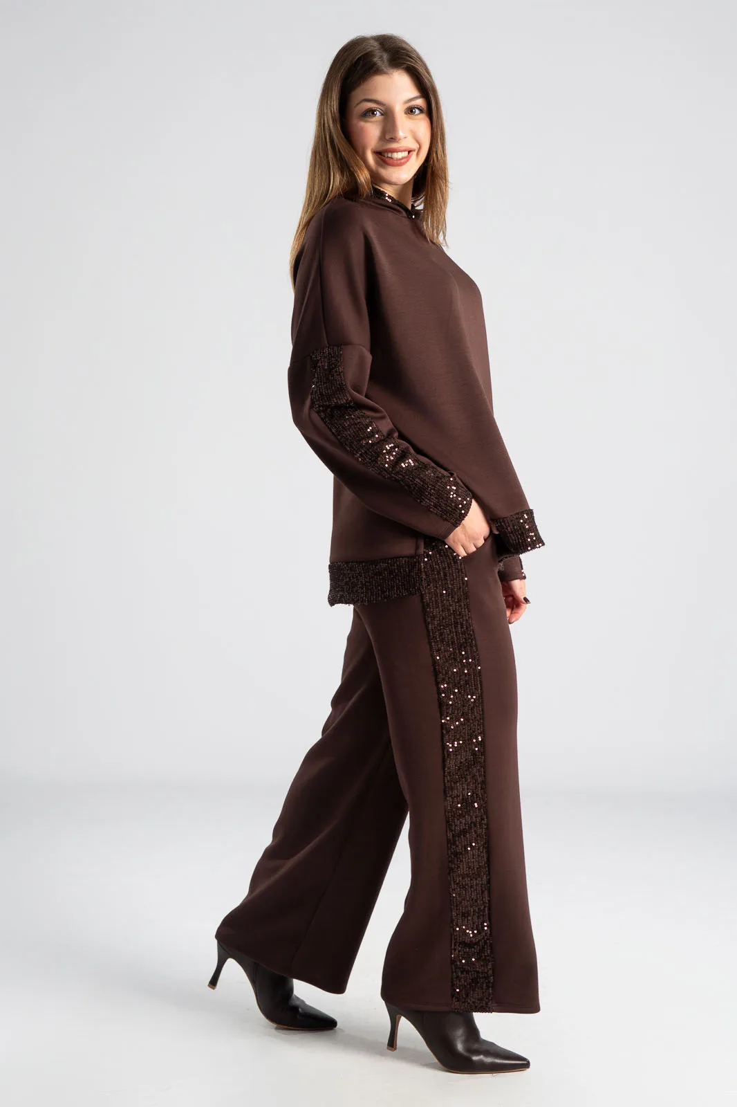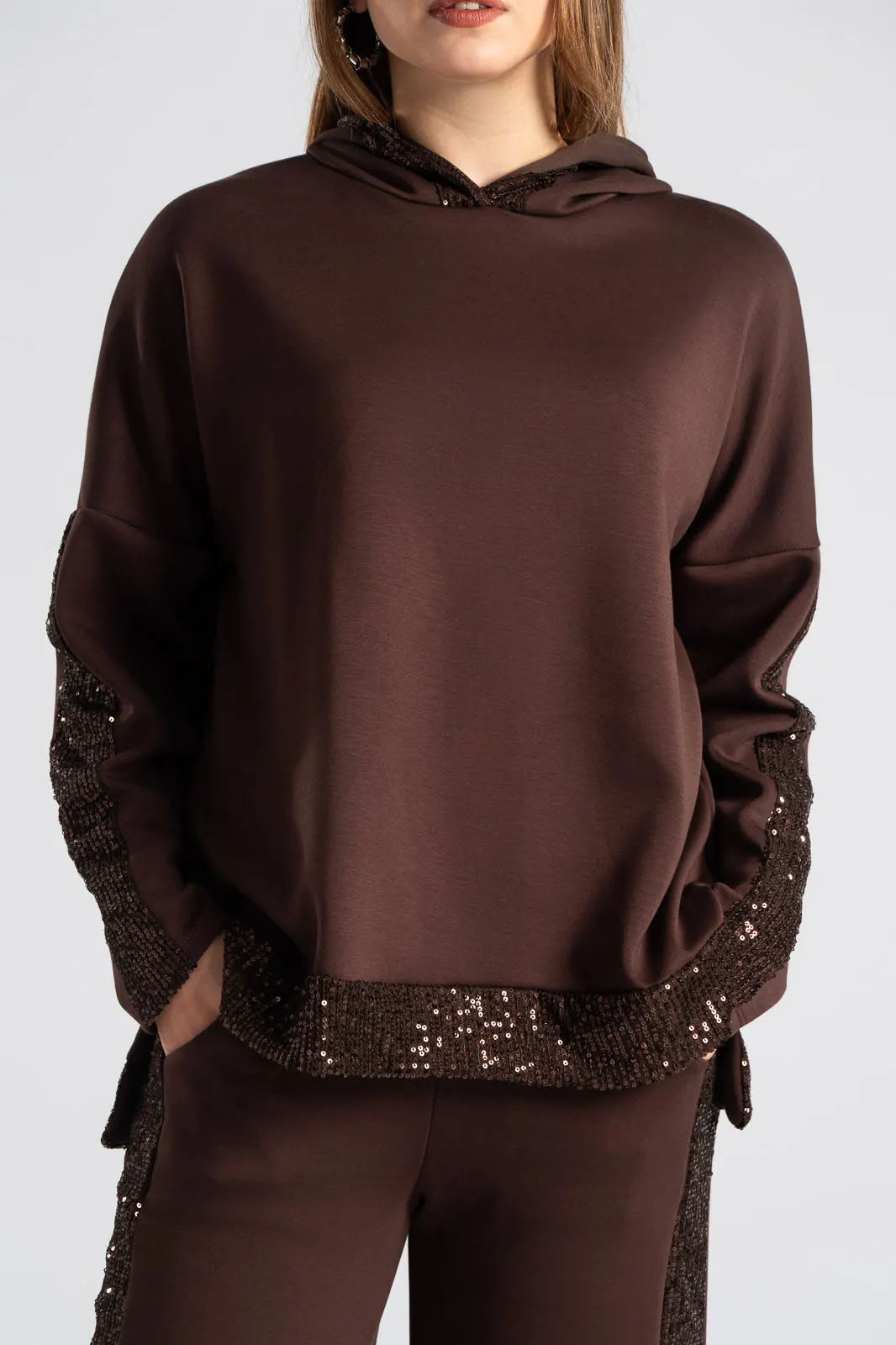 Σετ που αποτελείται από μπλούζα και παντελόνι. Η μπλούζα διαθέτει κουκούλα. Έχει μακριά μανίκια. Περιμετρικά της κουκούλας, στα μανίκια και στο τελείωμα διαθέτει διακοσμητικές παγιέτες. Το πίσω μέρος είναι ελαφρώς μακρύτερο. Το παντελόνι έχει λάστιχο στη μέση. Έχει πλαινές τσέπες. Στα πλαινά της φόρμας διαθέτει μια γραμμή με διακοσμητικές παγιέτες. Οι μετρήσεις του πίνακα είναι αντιπροσωπευτικές για κάθε προϊόν. 50% viscose, 45% polyester, 5% elastan.