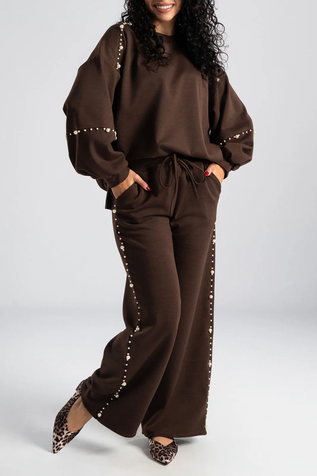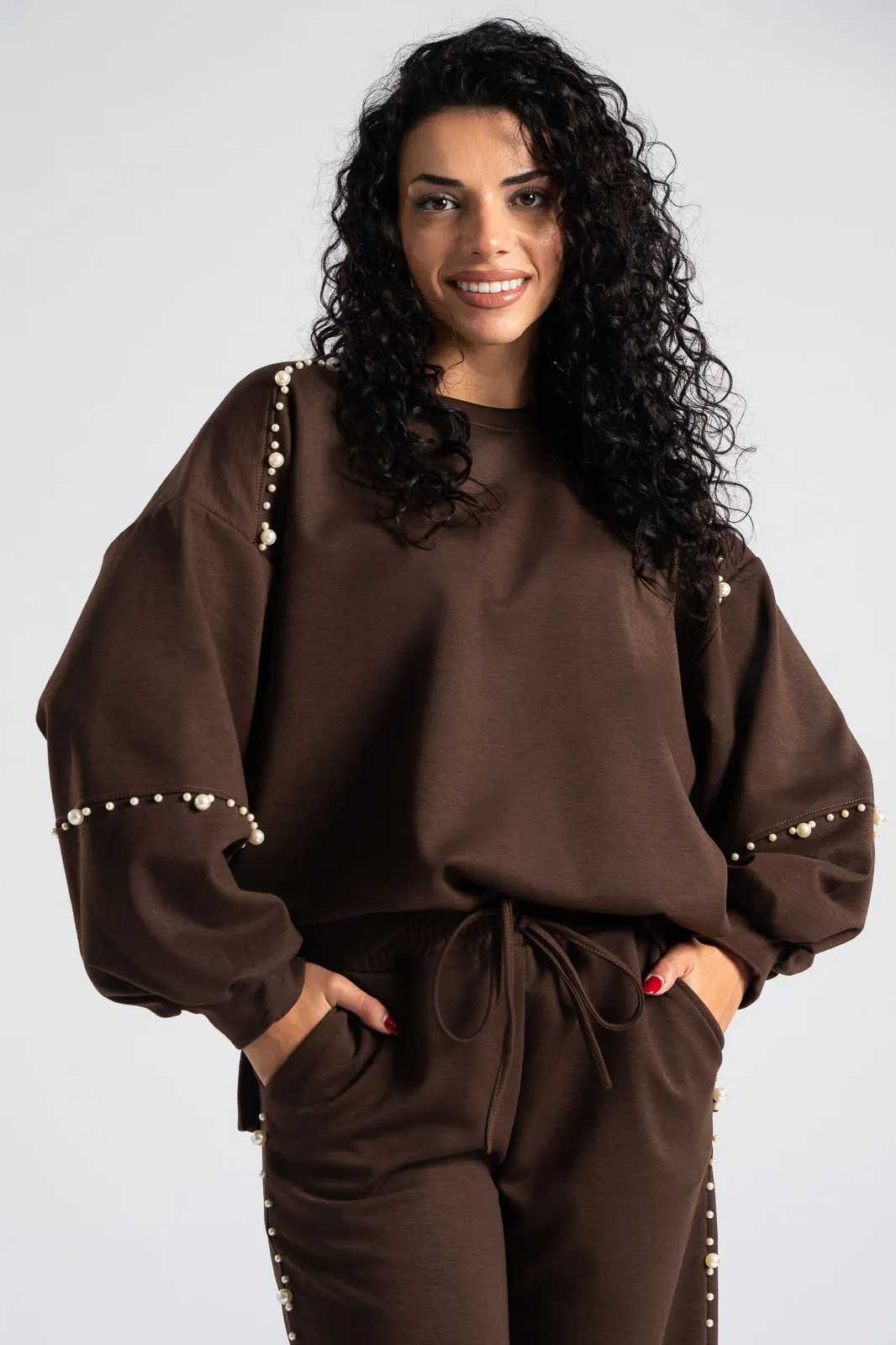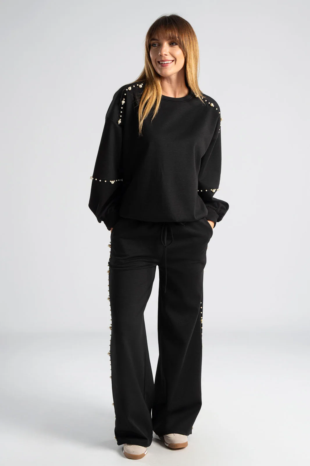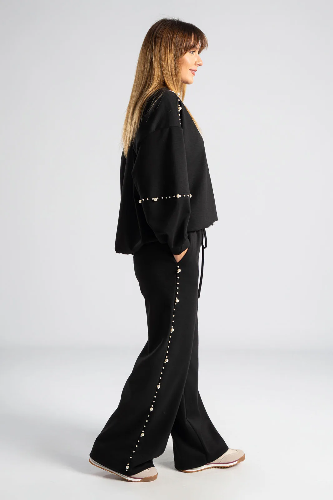 Σετ που αποτελείται από μπλούζα και παντελόνι. Η μπλούζα διαθέτει μακριά μανίκια. Το πίσω μέρος είναι ελαφρώς μακρύτερο. Το παντελόνι έχει λάστιχο στη μέση και εσωτερικό κορδόνι για καλύτερη εφαρμογή. Στα πλαινά έχει τσέπες. Περιμετρικά στους ώμους, στα μανίκια και στα πλαινά του παντελονιού έχει διακοσμητικές πέρλες. Οι μετρήσεις του πίνακα είναι αντιπροσωπευτικές για κάθε προϊόν. 97% viscose, 3% elastan.