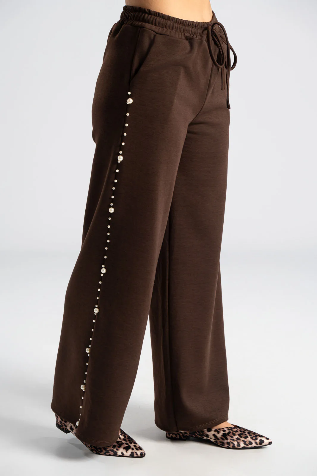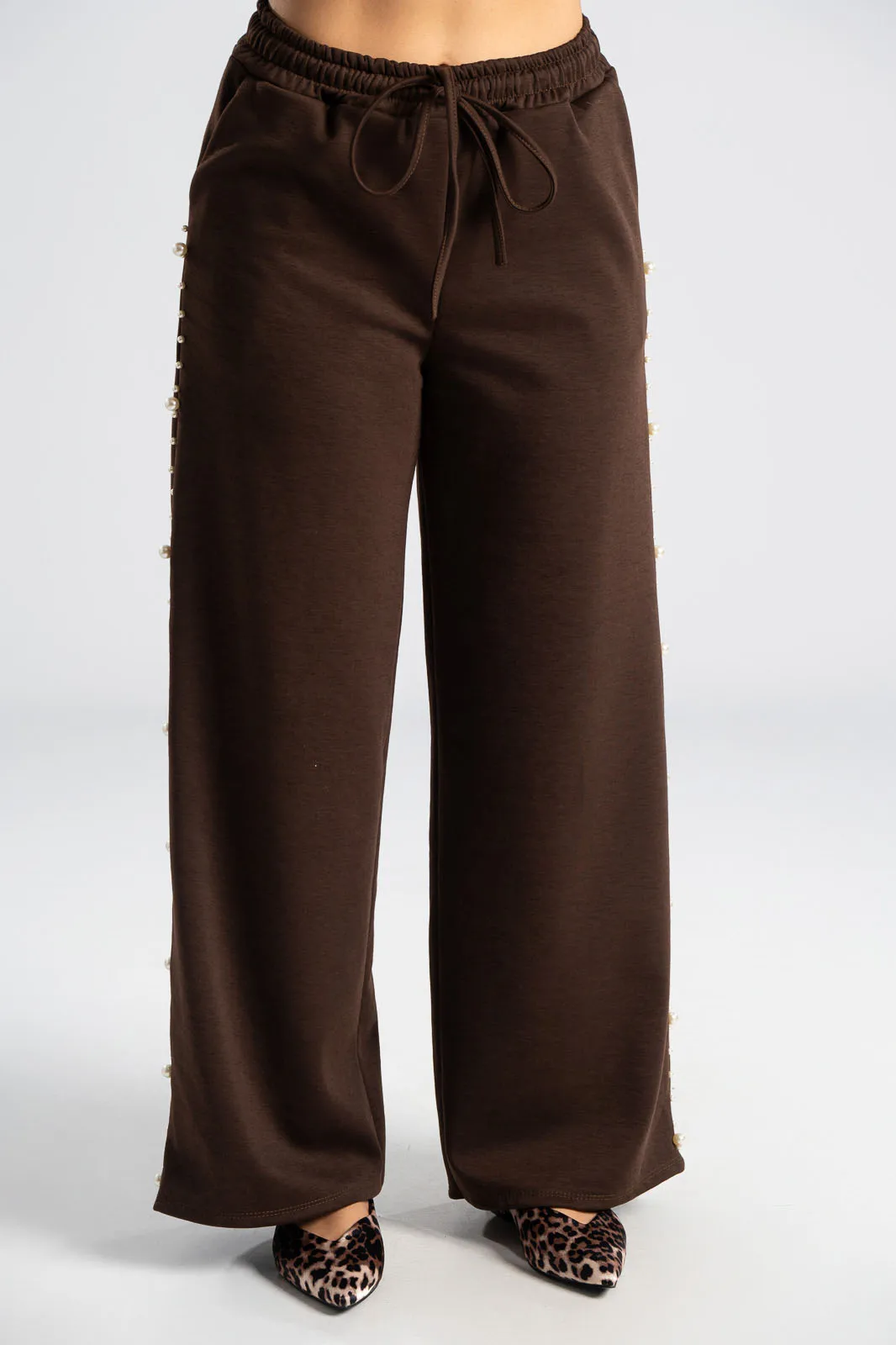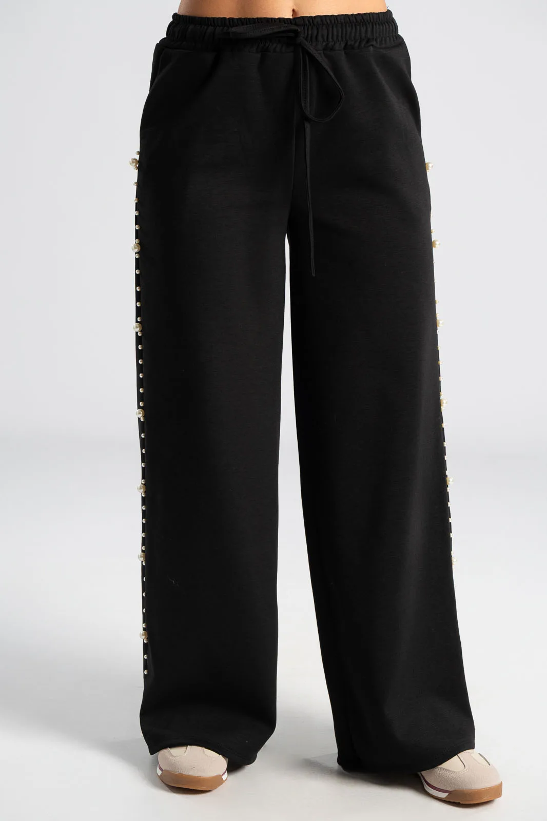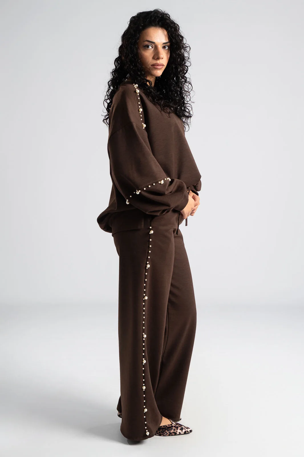 Σετ που αποτελείται από μπλούζα και παντελόνι. Η μπλούζα διαθέτει μακριά μανίκια. Το πίσω μέρος είναι ελαφρώς μακρύτερο. Το παντελόνι έχει λάστιχο στη μέση και εσωτερικό κορδόνι για καλύτερη εφαρμογή. Στα πλαινά έχει τσέπες. Περιμετρικά στους ώμους, στα μανίκια και στα πλαινά του παντελονιού έχει διακοσμητικές πέρλες. Οι μετρήσεις του πίνακα είναι αντιπροσωπευτικές για κάθε προϊόν. 97% viscose, 3% elastan.