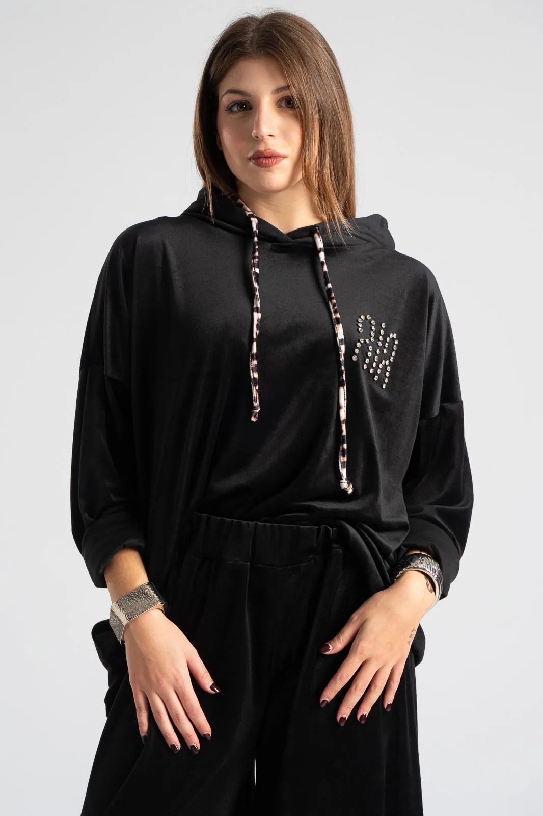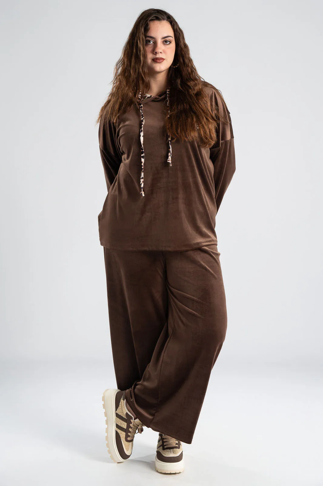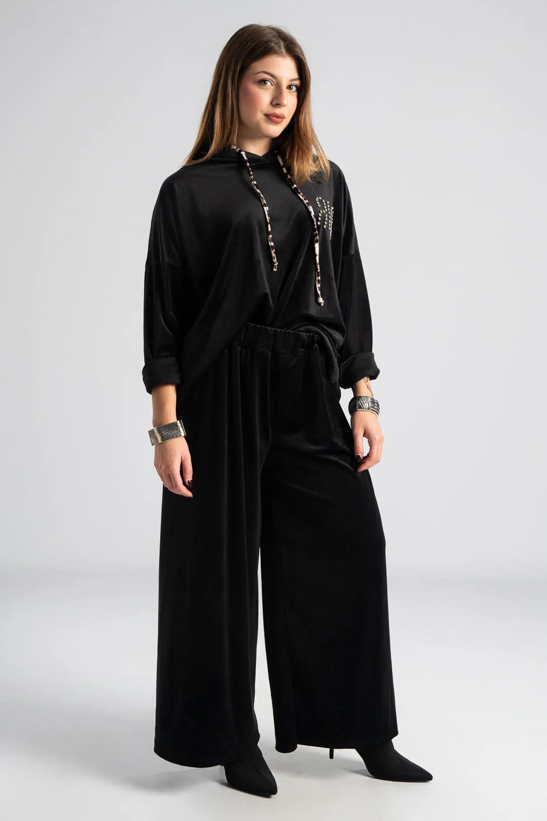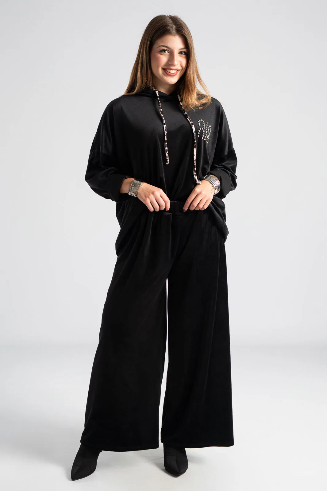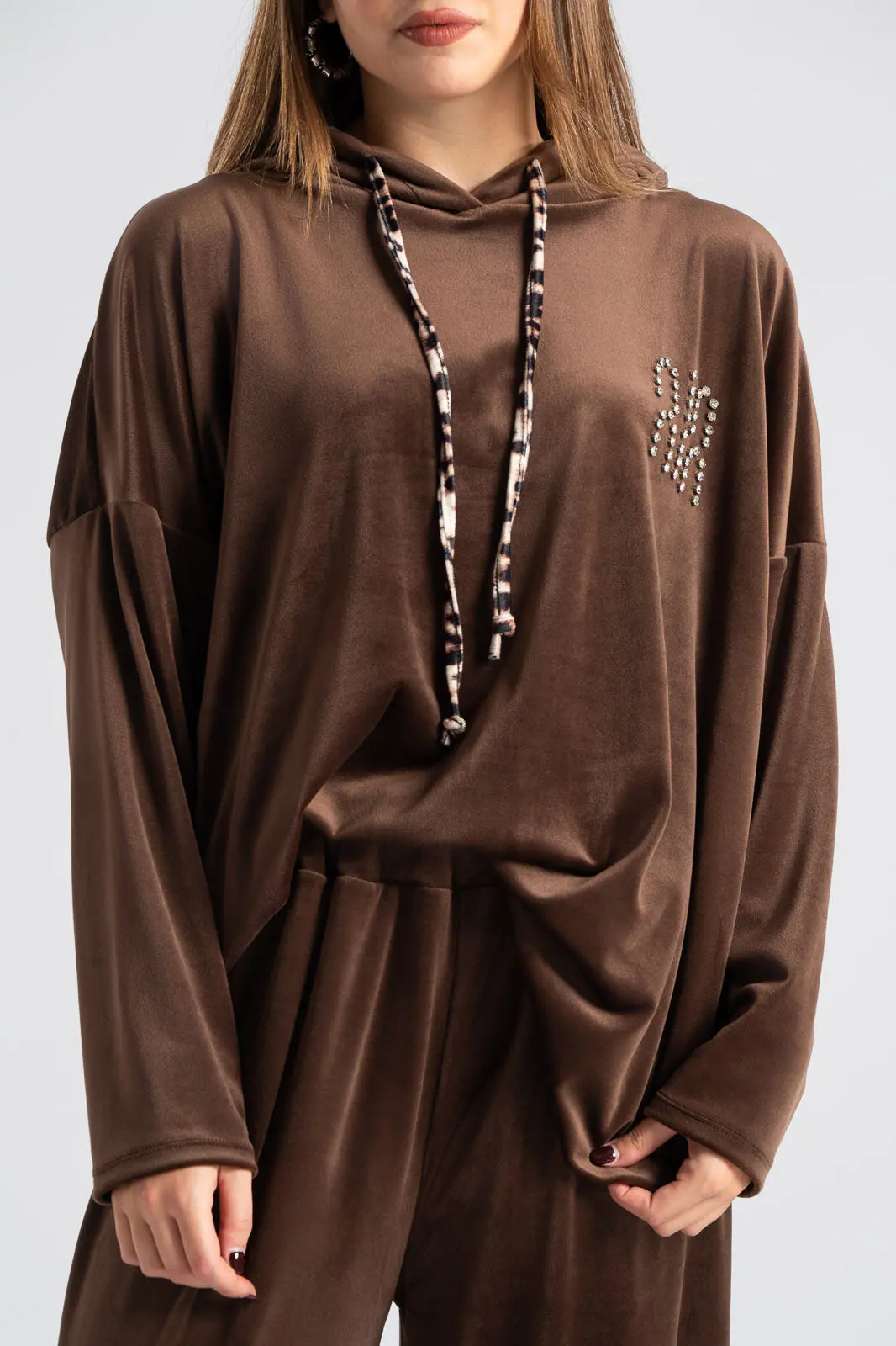 Σετ που αποτελείται από μπλούζα και παντελόνι. Η μπλούζα διαθέτει κουκούλα με εσωτερικό κορδόνι σε leopar print. Στο μπροστινό μέρος στη μια πλευρά έχει διακοσμητικά μεγάλα στρας. Το παντελόνι έχει λάστιχο στην μέση. Σε όλη την επιφάνεια έχει velvet υφή. Οι μετρήσεις του πίνακα είναι αντιπροσωπευτικές για κάθε προϊόν. 95% viscose, 5% elastan.