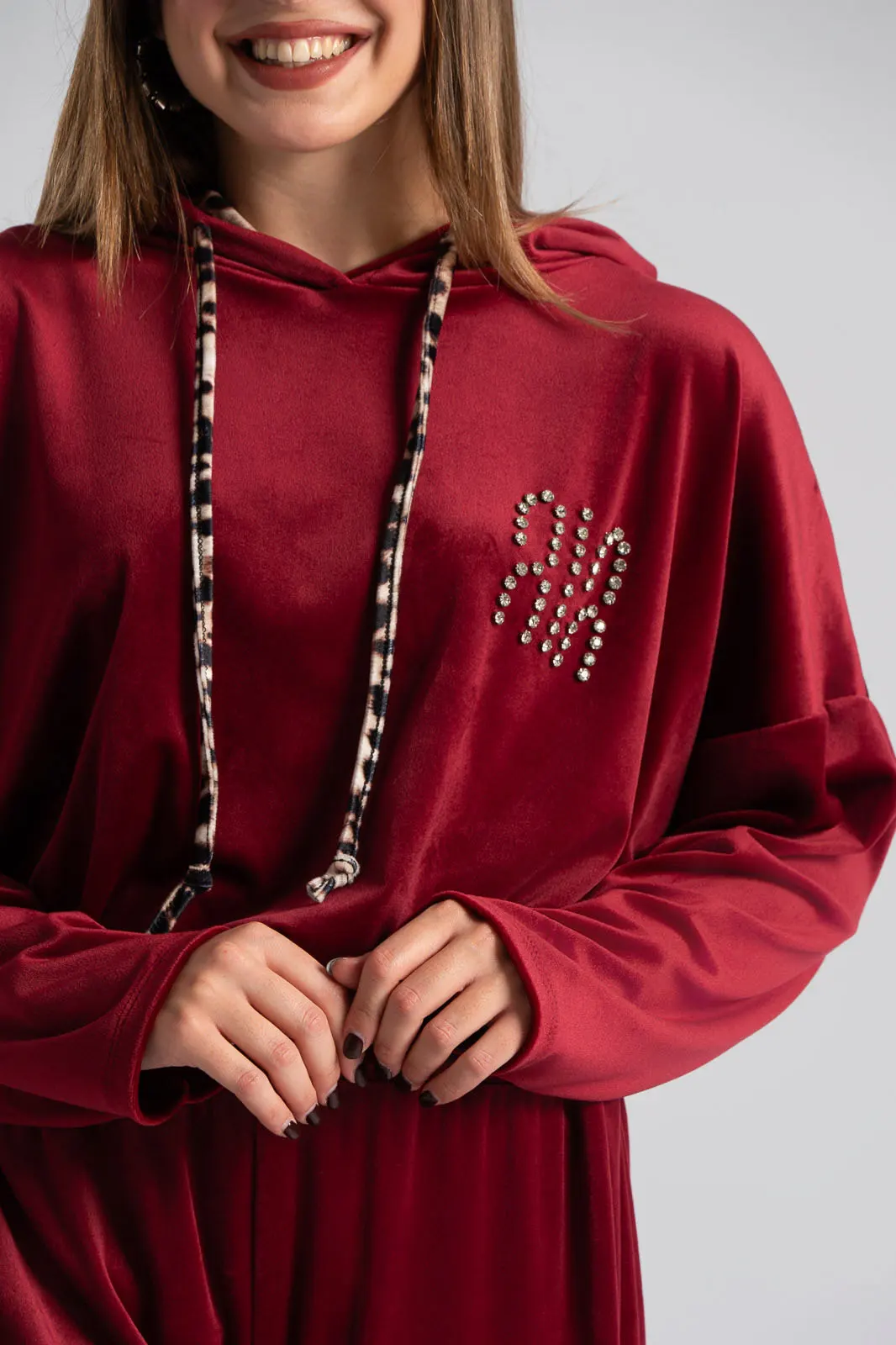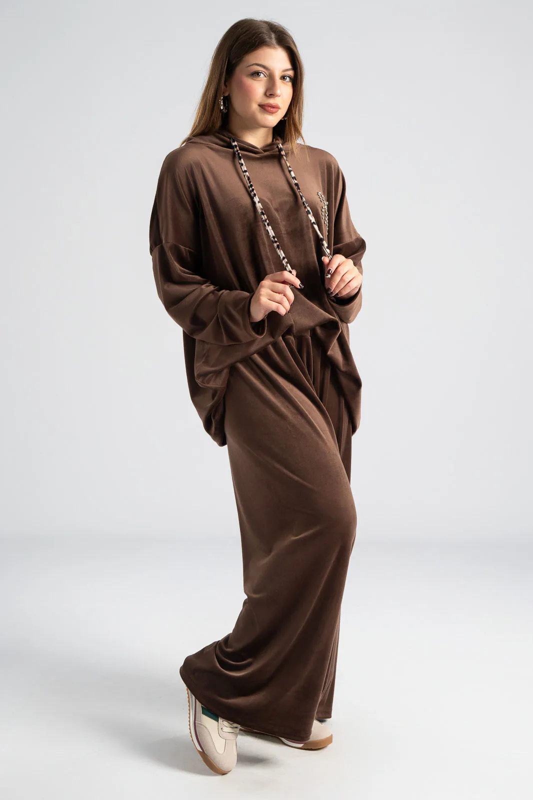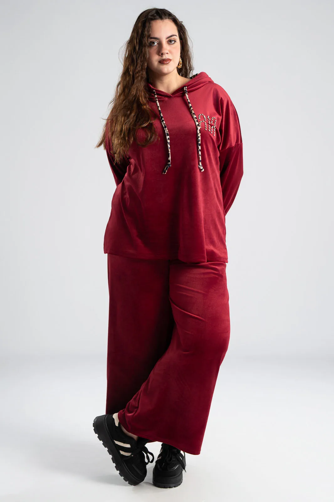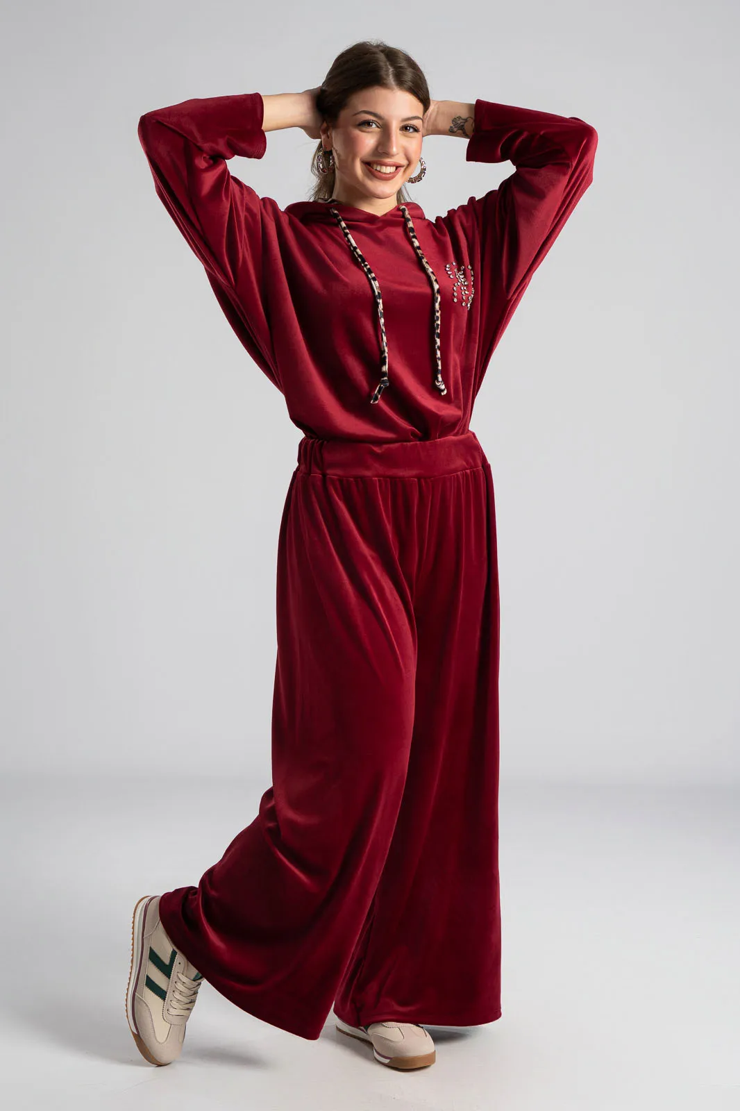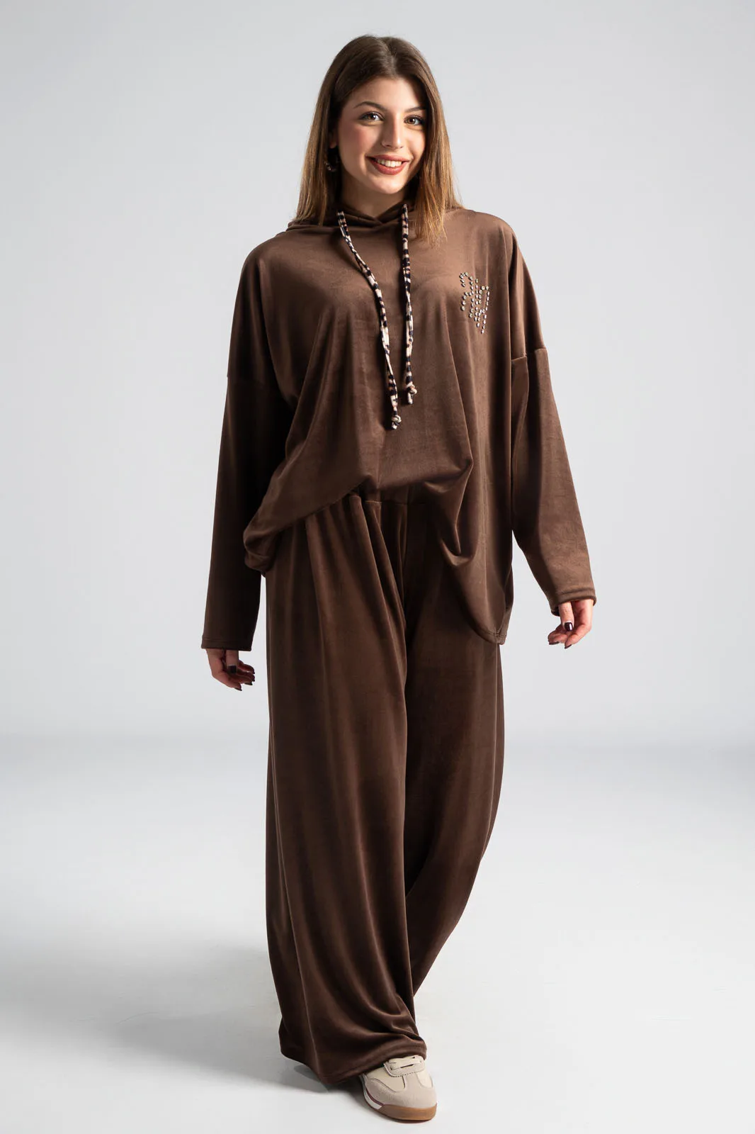 Σετ που αποτελείται από μπλούζα και παντελόνι. Η μπλούζα διαθέτει κουκούλα με εσωτερικό κορδόνι σε leopar print. Στο μπροστινό μέρος στη μια πλευρά έχει διακοσμητικά μεγάλα στρας. Το παντελόνι έχει λάστιχο στην μέση. Σε όλη την επιφάνεια έχει velvet υφή. Οι μετρήσεις του πίνακα είναι αντιπροσωπευτικές για κάθε προϊόν. 95% viscose, 5% elastan.