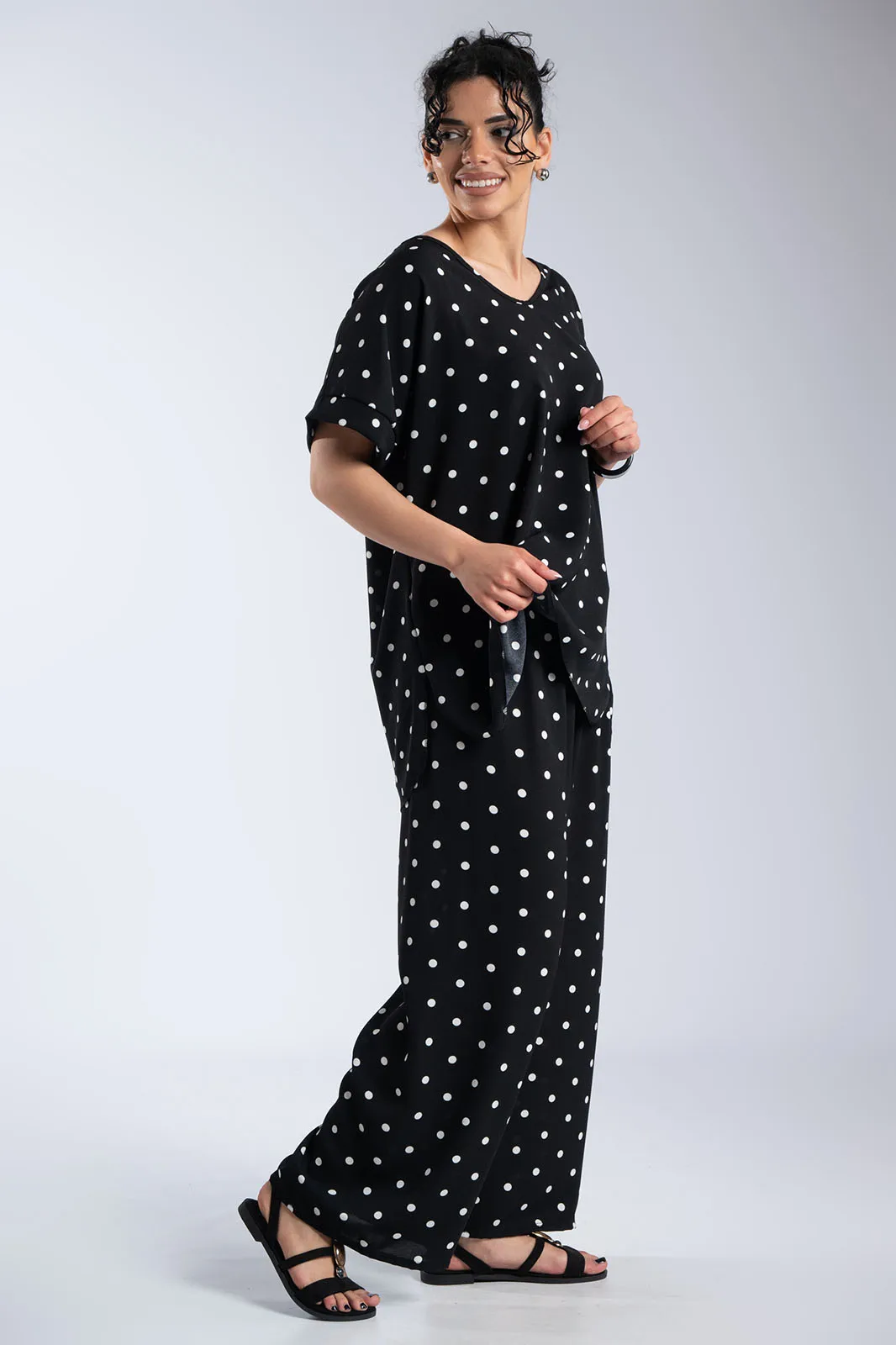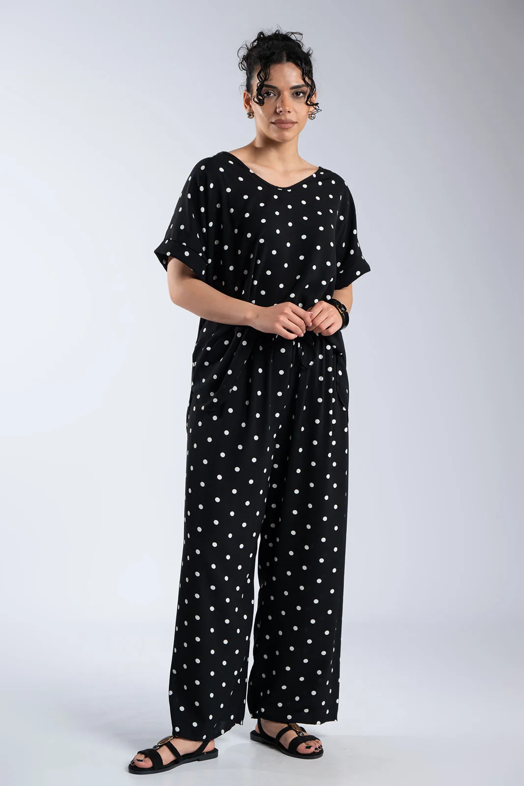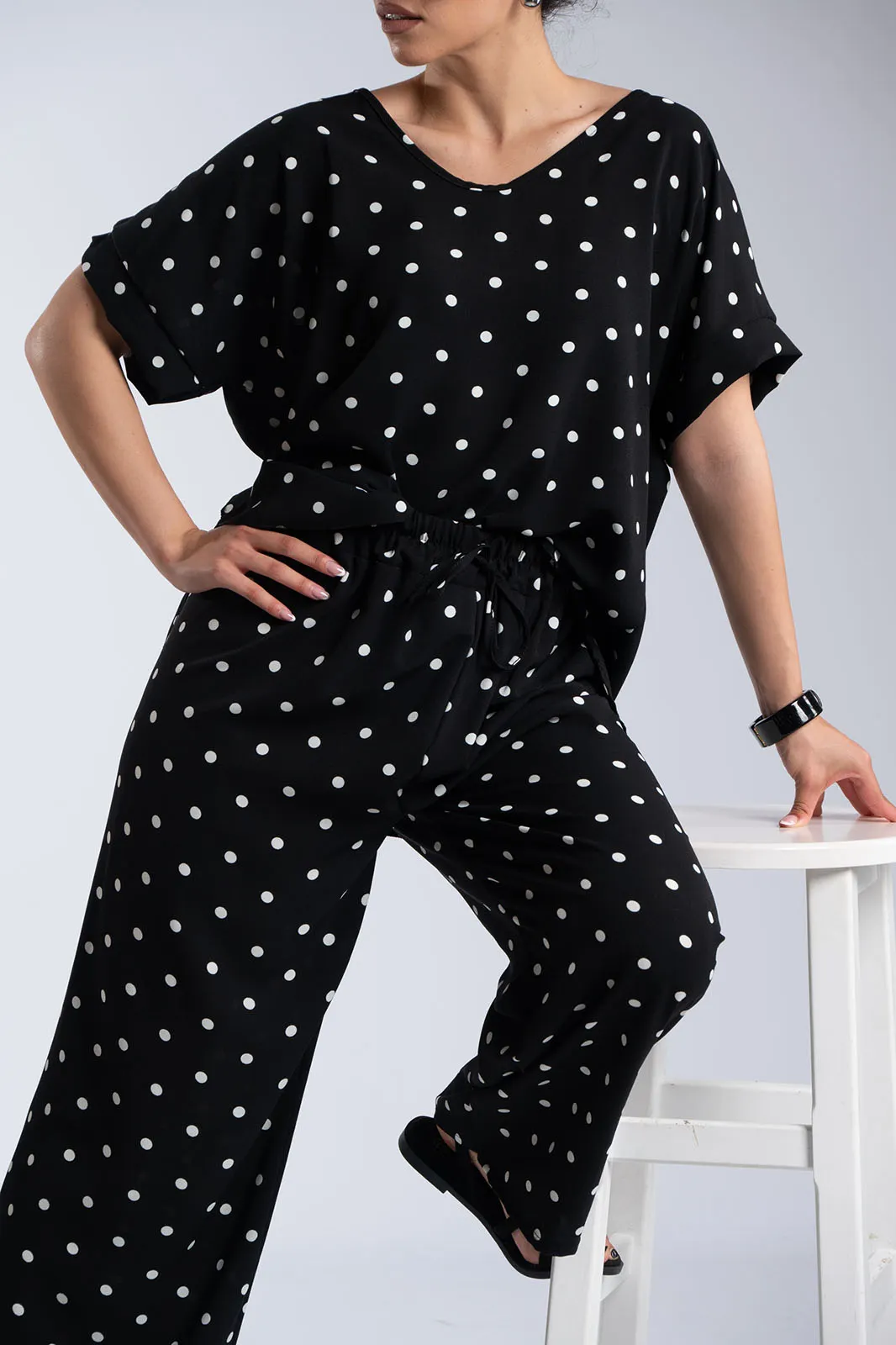 Κομψό και άνετο σετ σε διαχρονικό πουά μοτίβο που συνδυάζει στιλ και ευκολία στην καθημερινότητα. Η μπλούζα με στρογγυλή λαιμόκοψη και χαλαρή γραμμή αγκαλιάζει απαλά το σώμα, ενώ τα διακριτικά ανοίγματα στα πλαϊνά στο τελείωμα προσθέτουν κίνηση και μια σύγχρονη πινελιά στο σχέδιο. Η παντελόνα διαθέτει άνετη εφαρμογή με λάστιχο στη μέση που προσαρμόζεται ιδανικά, προσφέροντας ελευθερία κινήσεων καθ’ όλη τη διάρκεια της ημέρας. Το διακοσμητικό κορδόνι ολοκληρώνει το look, δίνοντας ένα casual-chic χαρακτήρα χωρίς να περιορίζει την άνεση. Το ανάλαφρο ύφασμα και η ρευστή εφαρμογή κάνουν το σύνολο ιδανικό για all day εμφανίσεις, από πρωινές εξόδους μέχρι πιο χαλαρές βραδινές στιγμές.