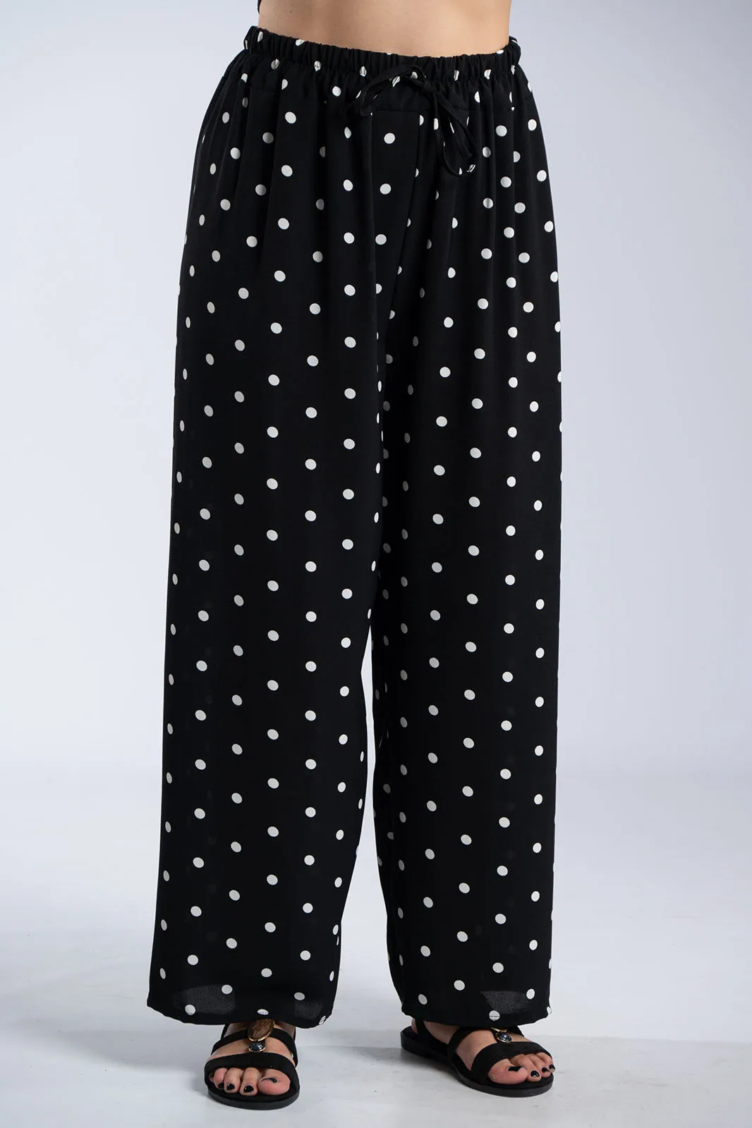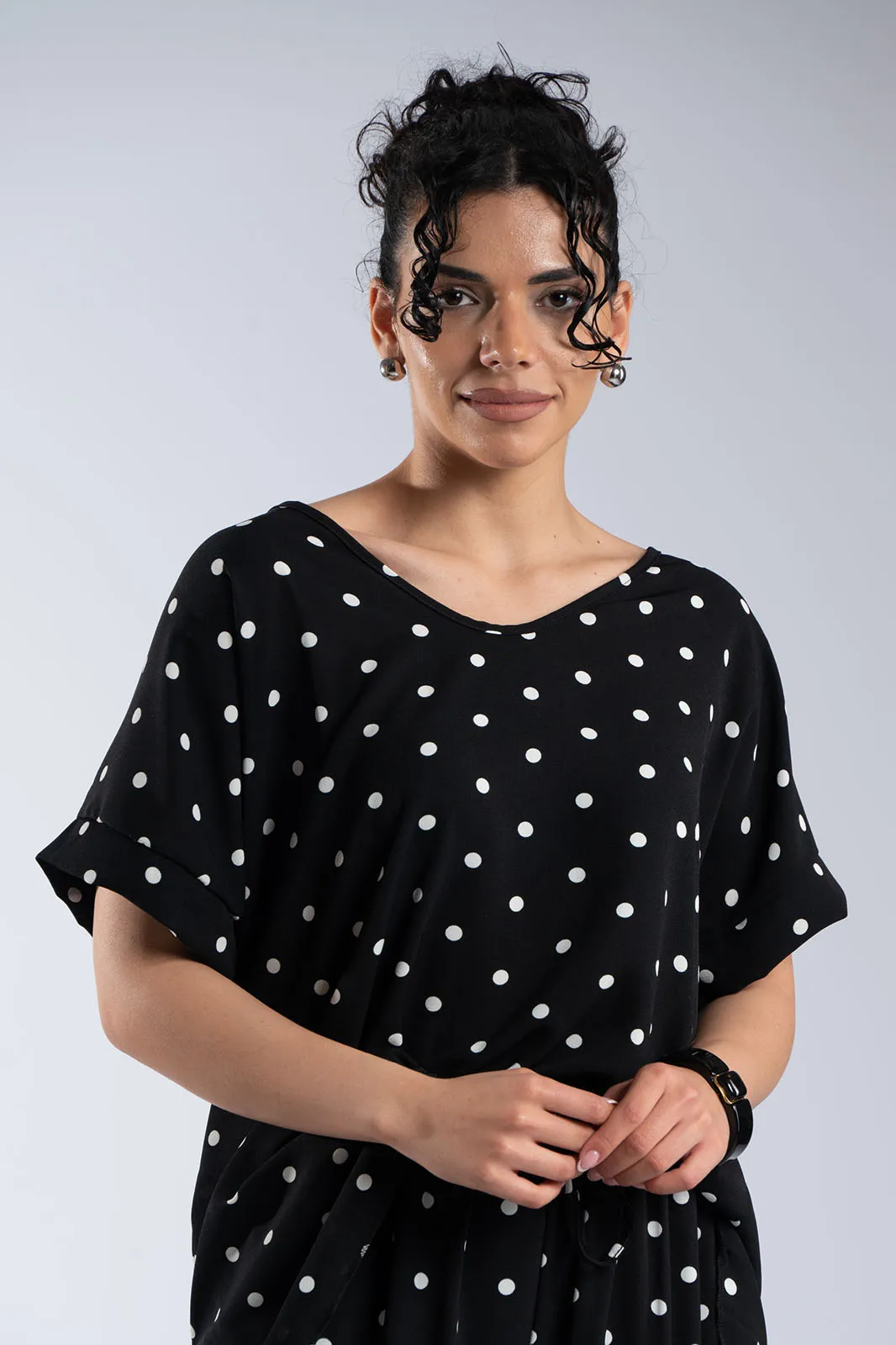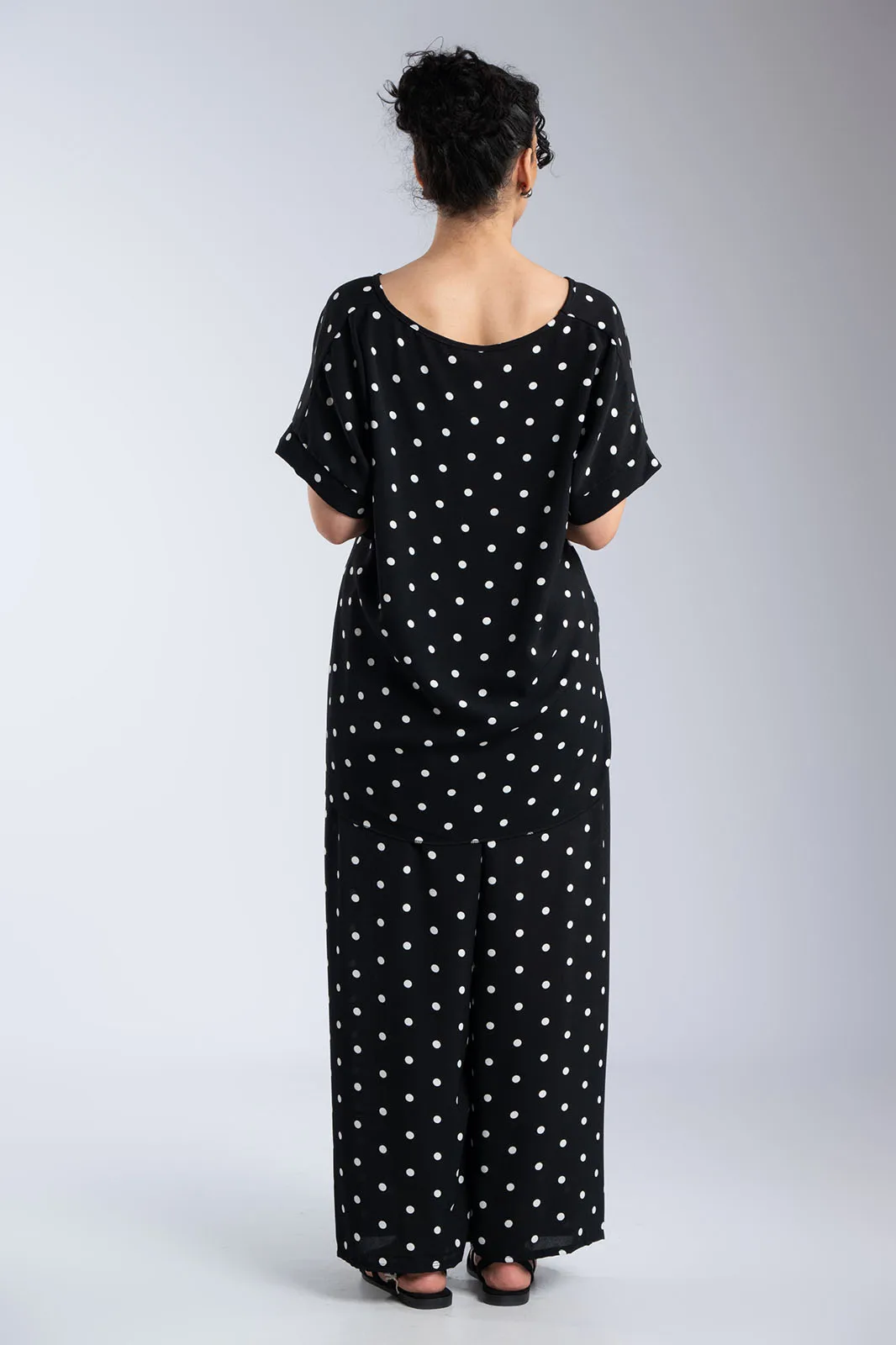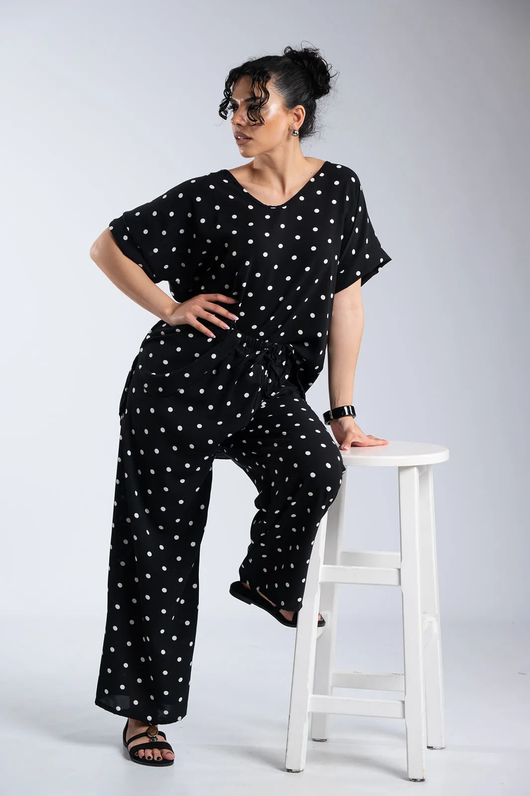 Κομψό και άνετο σετ σε διαχρονικό πουά μοτίβο που συνδυάζει στιλ και ευκολία στην καθημερινότητα. Η μπλούζα με στρογγυλή λαιμόκοψη και χαλαρή γραμμή αγκαλιάζει απαλά το σώμα, ενώ τα διακριτικά ανοίγματα στα πλαϊνά στο τελείωμα προσθέτουν κίνηση και μια σύγχρονη πινελιά στο σχέδιο. Η παντελόνα διαθέτει άνετη εφαρμογή με λάστιχο στη μέση που προσαρμόζεται ιδανικά, προσφέροντας ελευθερία κινήσεων καθ’ όλη τη διάρκεια της ημέρας. Το διακοσμητικό κορδόνι ολοκληρώνει το look, δίνοντας ένα casual-chic χαρακτήρα χωρίς να περιορίζει την άνεση. Το ανάλαφρο ύφασμα και η ρευστή εφαρμογή κάνουν το σύνολο ιδανικό για all day εμφανίσεις, από πρωινές εξόδους μέχρι πιο χαλαρές βραδινές στιγμές.