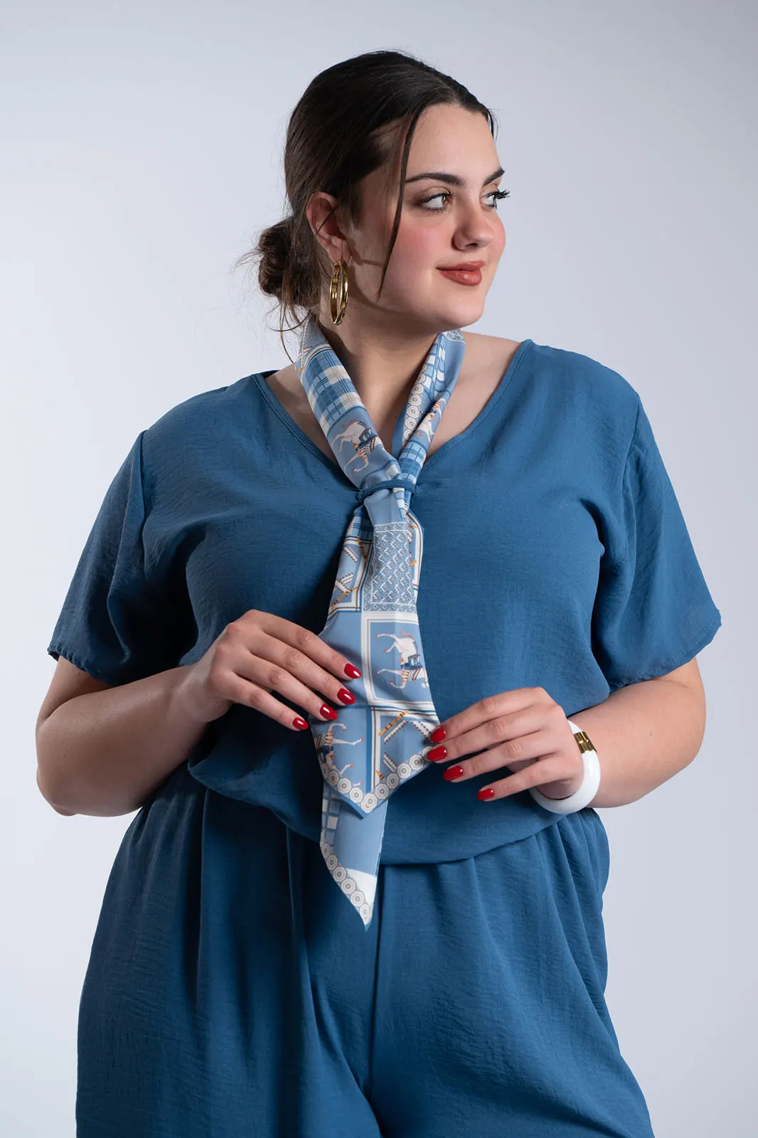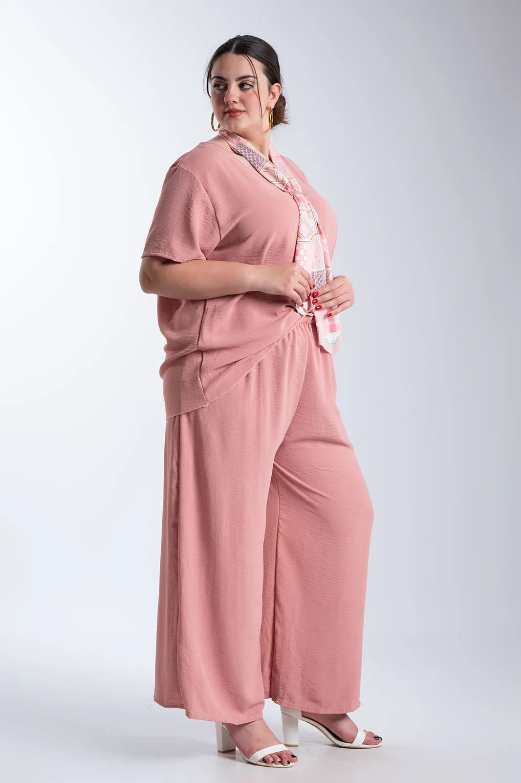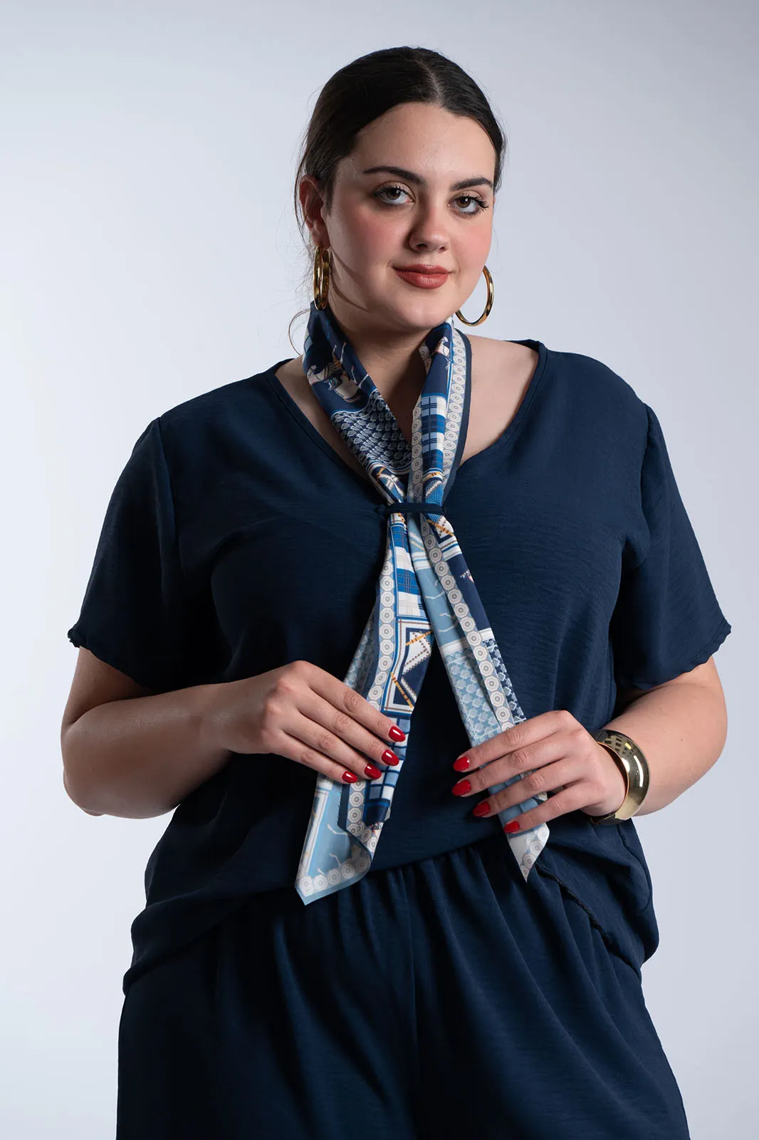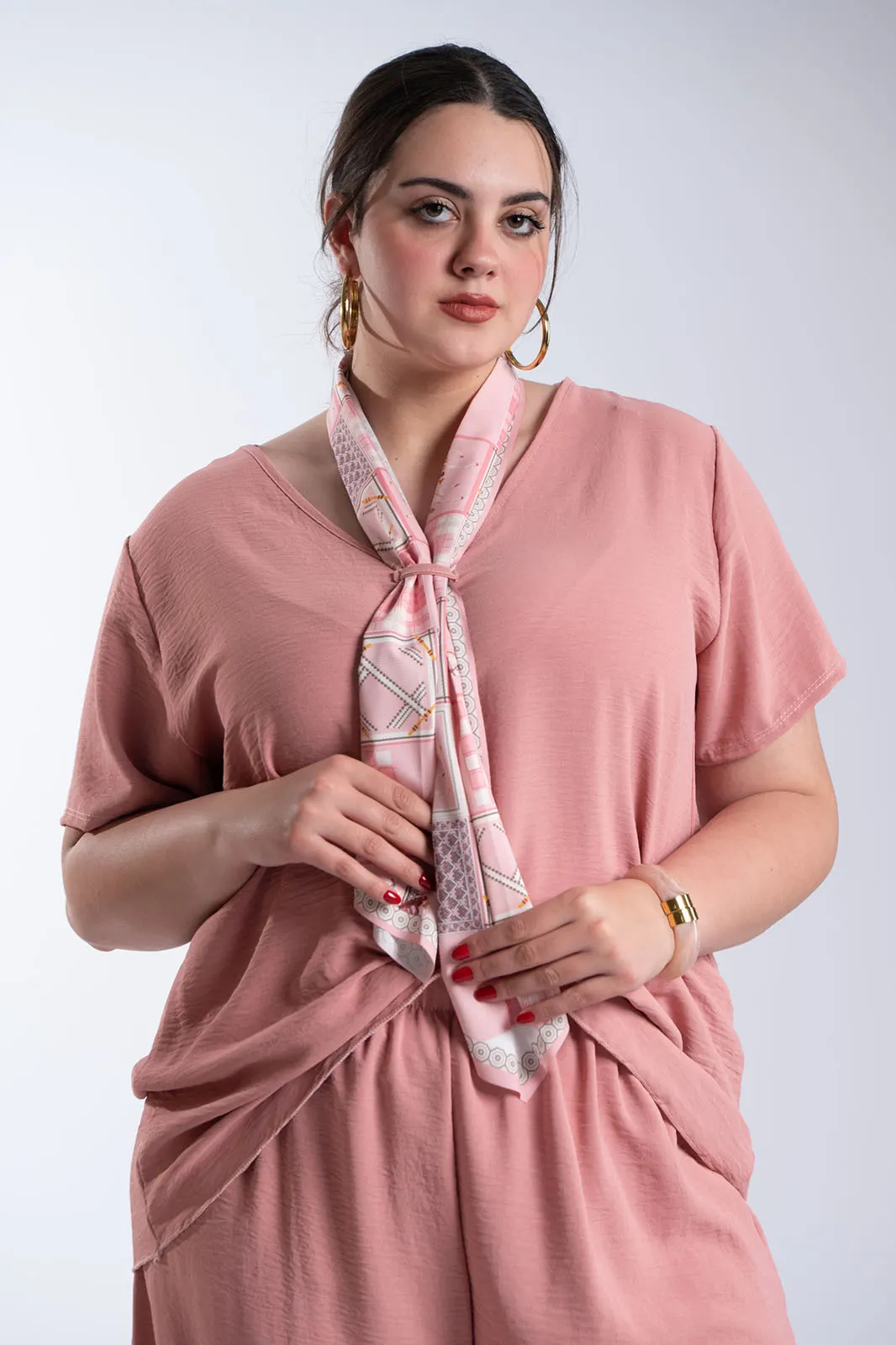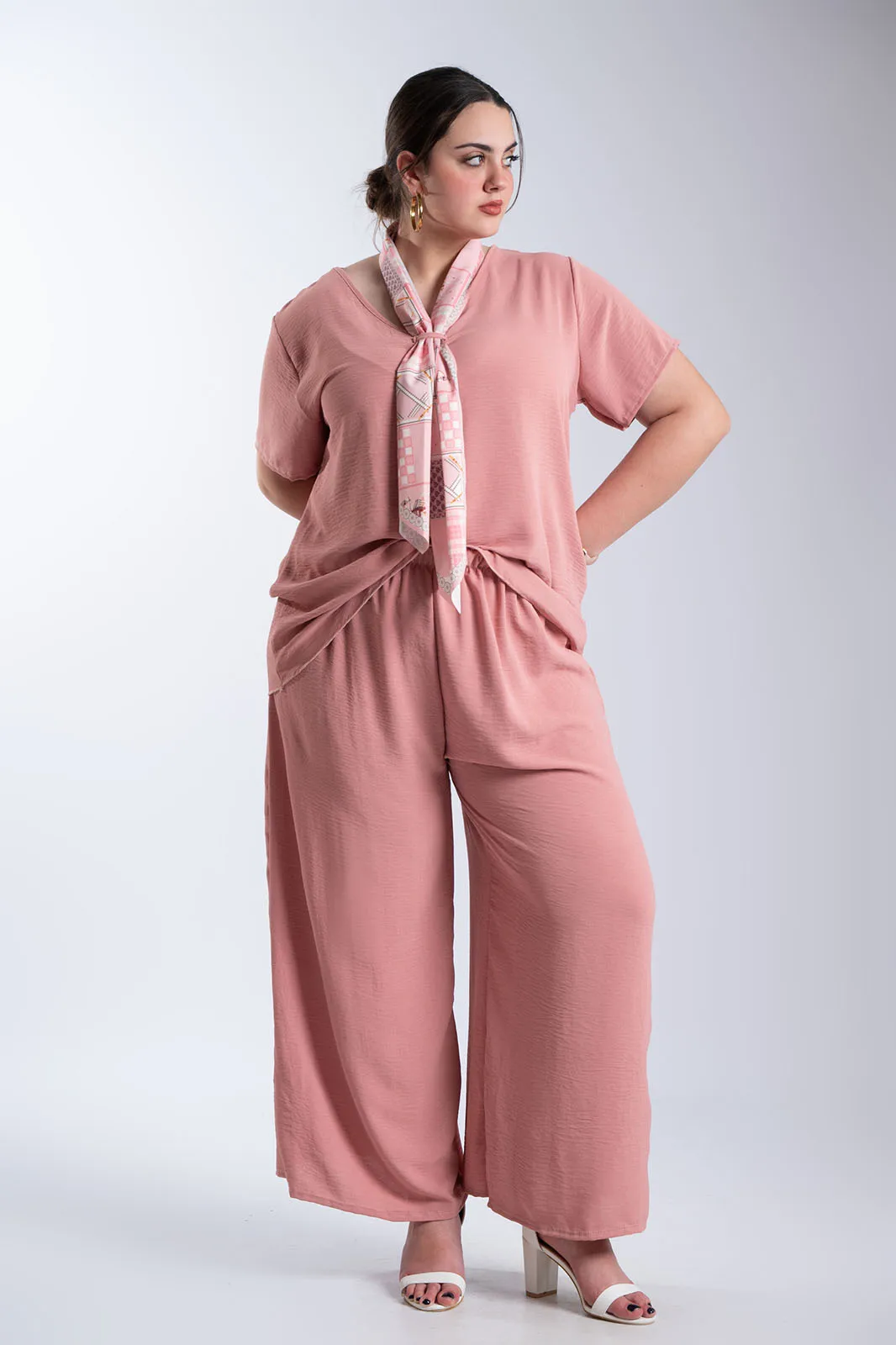 Κομψό και άνετο σετ που αποτελείται από μπλούζα και παντελόνι, ιδανικό για καθημερινές αλλά και πιο προσεγμένες εμφανίσεις. Η μπλούζα διαθέτει λαιμόκοψη V και κοντά μανίκια, προσφέροντας άνετη εφαρμογή και minimal αισθητική. Το διακοσμητικό φουλάρι είναι αποσπώμενο και μπορεί να φορεθεί με διαφορετικούς τρόπους, χαρίζοντας ευελιξία στο styling. Διαθέτει ειδικό θηλάκι στο κάτω μέρος του V ώστε να εφαρμόζει σταθερά και κομψά. Το παντελόνι έχει λάστιχο στη μέση για άνεση και σωστή εφαρμογή, ενώ η ίσια και άνετη γραμμή του το καθιστά ιδανικό για all day looks.