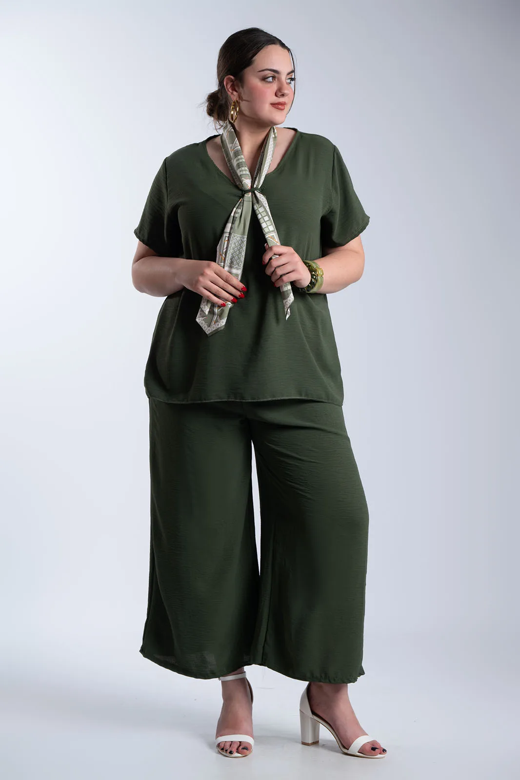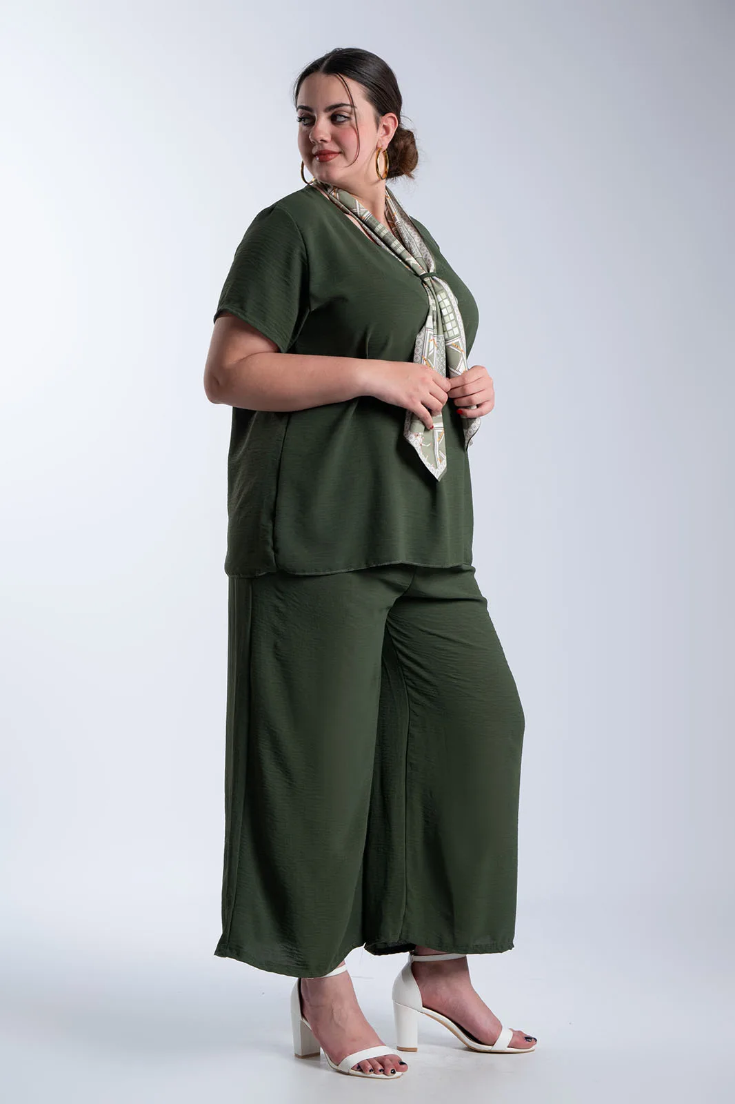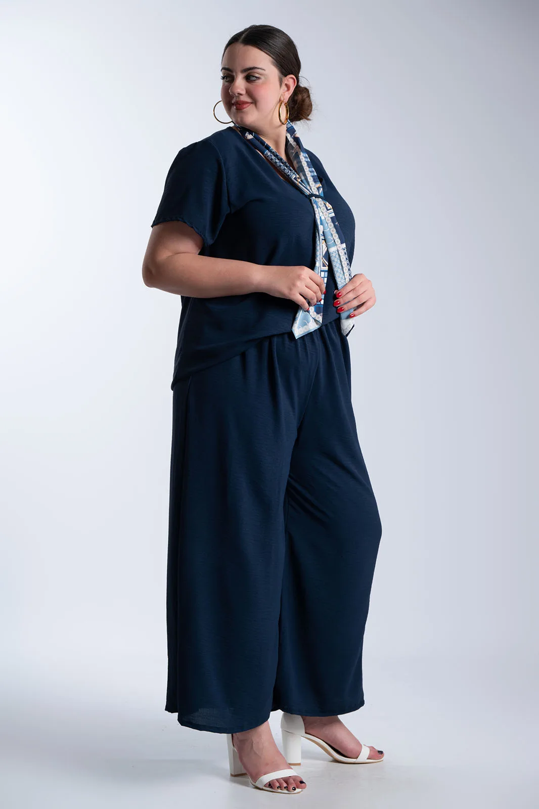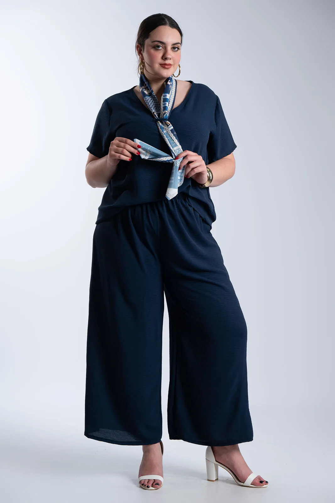 Κομψό και άνετο σετ που αποτελείται από μπλούζα και παντελόνι, ιδανικό για καθημερινές αλλά και πιο προσεγμένες εμφανίσεις. Η μπλούζα διαθέτει λαιμόκοψη V και κοντά μανίκια, προσφέροντας άνετη εφαρμογή και minimal αισθητική. Το διακοσμητικό φουλάρι είναι αποσπώμενο και μπορεί να φορεθεί με διαφορετικούς τρόπους, χαρίζοντας ευελιξία στο styling. Διαθέτει ειδικό θηλάκι στο κάτω μέρος του V ώστε να εφαρμόζει σταθερά και κομψά. Το παντελόνι έχει λάστιχο στη μέση για άνεση και σωστή εφαρμογή, ενώ η ίσια και άνετη γραμμή του το καθιστά ιδανικό για all day looks.
