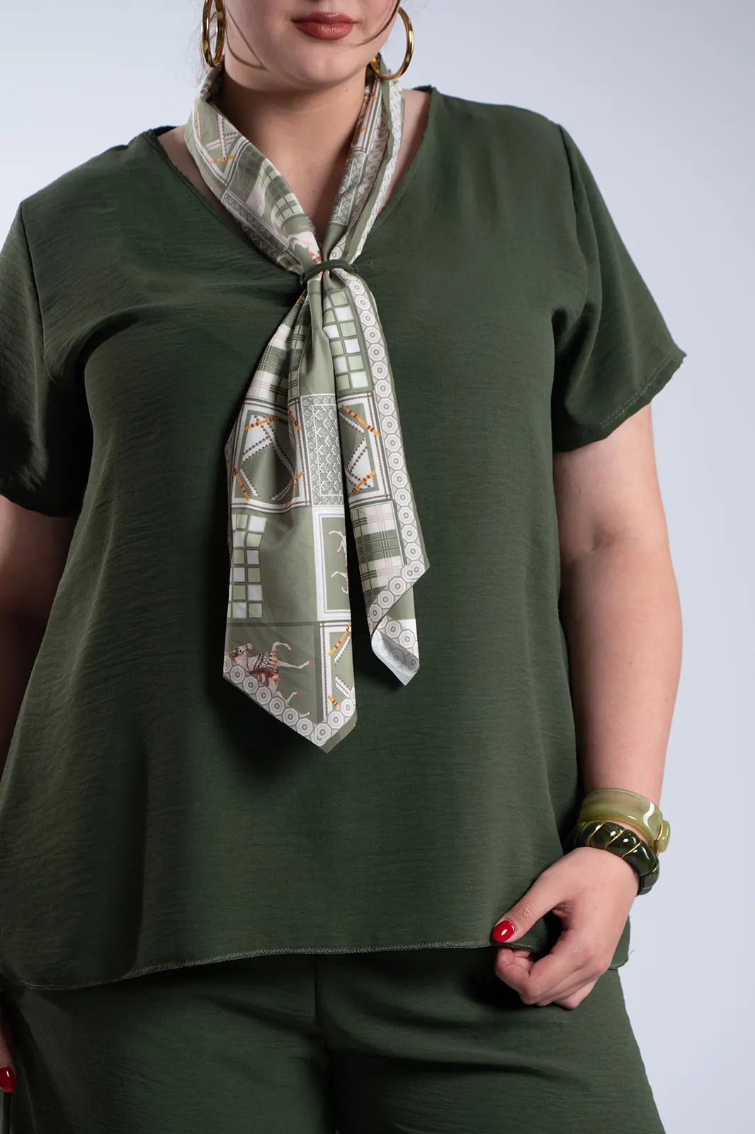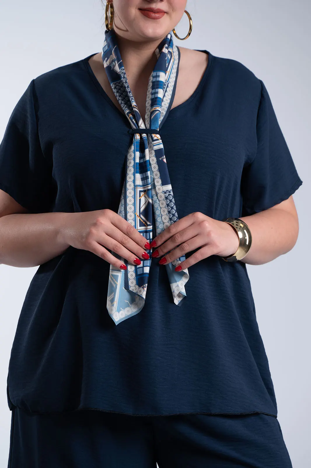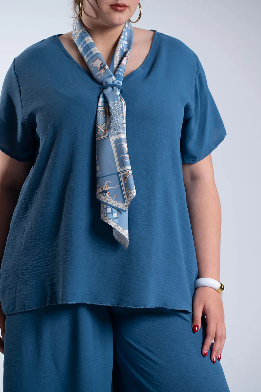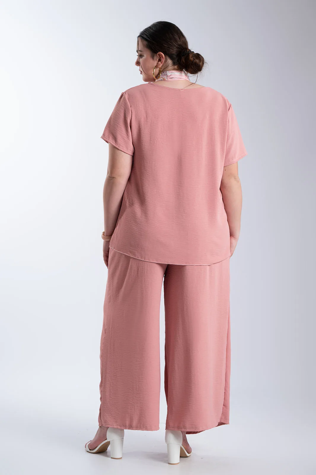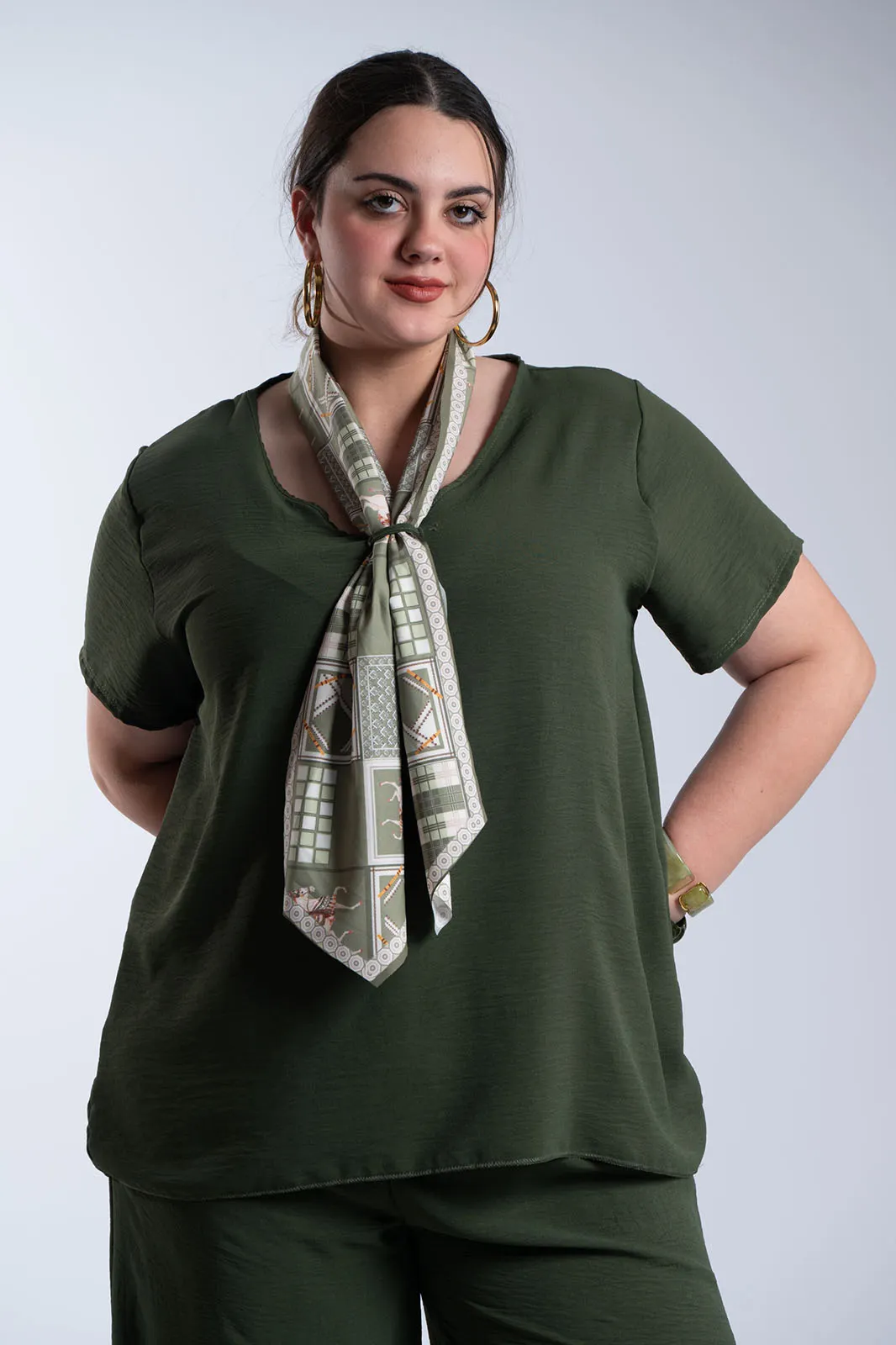 Κομψό και άνετο σετ που αποτελείται από μπλούζα και παντελόνι, ιδανικό για καθημερινές αλλά και πιο προσεγμένες εμφανίσεις. Η μπλούζα διαθέτει λαιμόκοψη V και κοντά μανίκια, προσφέροντας άνετη εφαρμογή και minimal αισθητική. Το διακοσμητικό φουλάρι είναι αποσπώμενο και μπορεί να φορεθεί με διαφορετικούς τρόπους, χαρίζοντας ευελιξία στο styling. Διαθέτει ειδικό θηλάκι στο κάτω μέρος του V ώστε να εφαρμόζει σταθερά και κομψά. Το παντελόνι έχει λάστιχο στη μέση για άνεση και σωστή εφαρμογή, ενώ η ίσια και άνετη γραμμή του το καθιστά ιδανικό για all day looks.