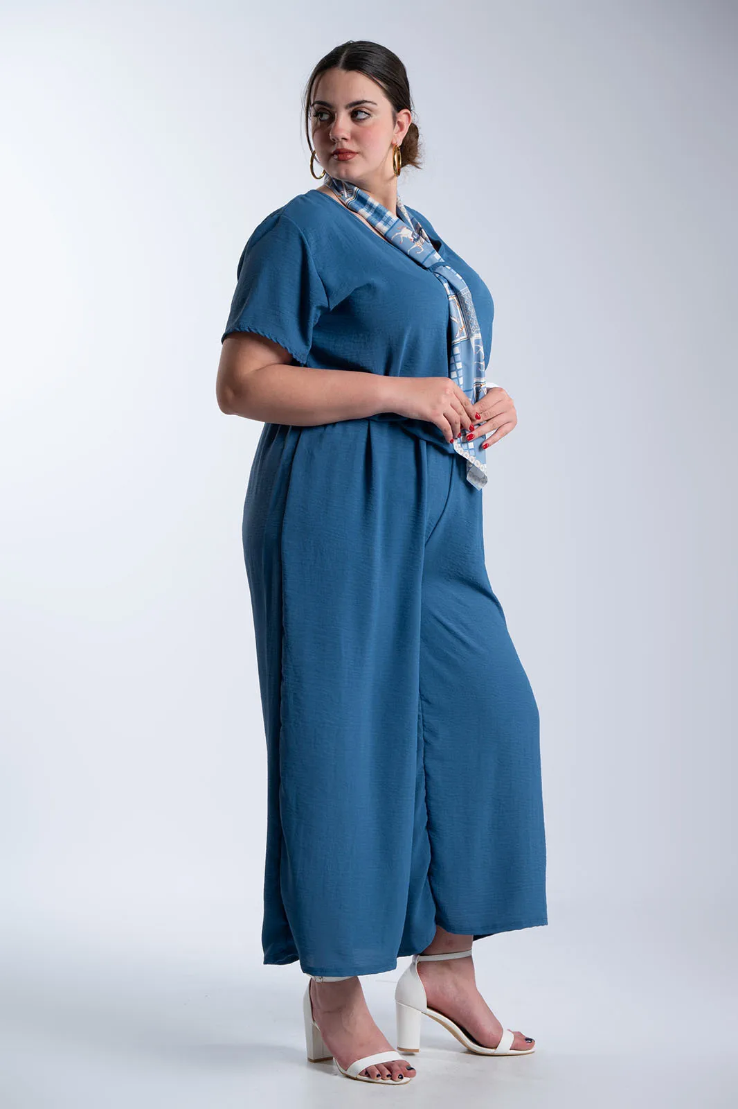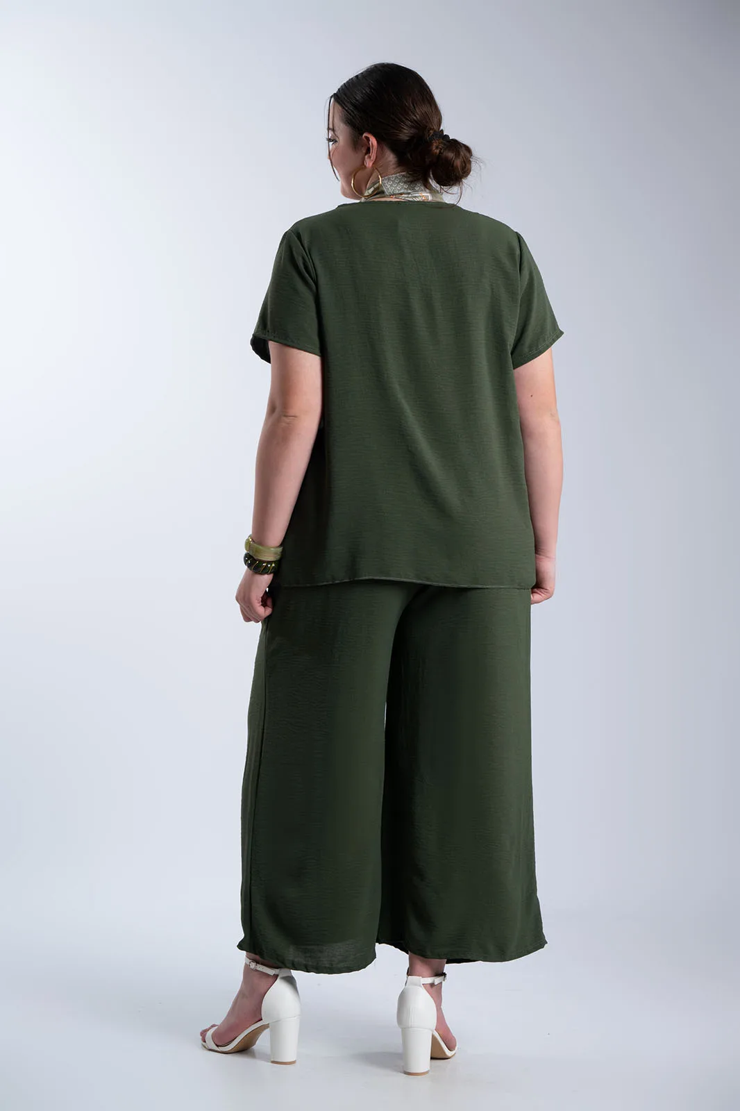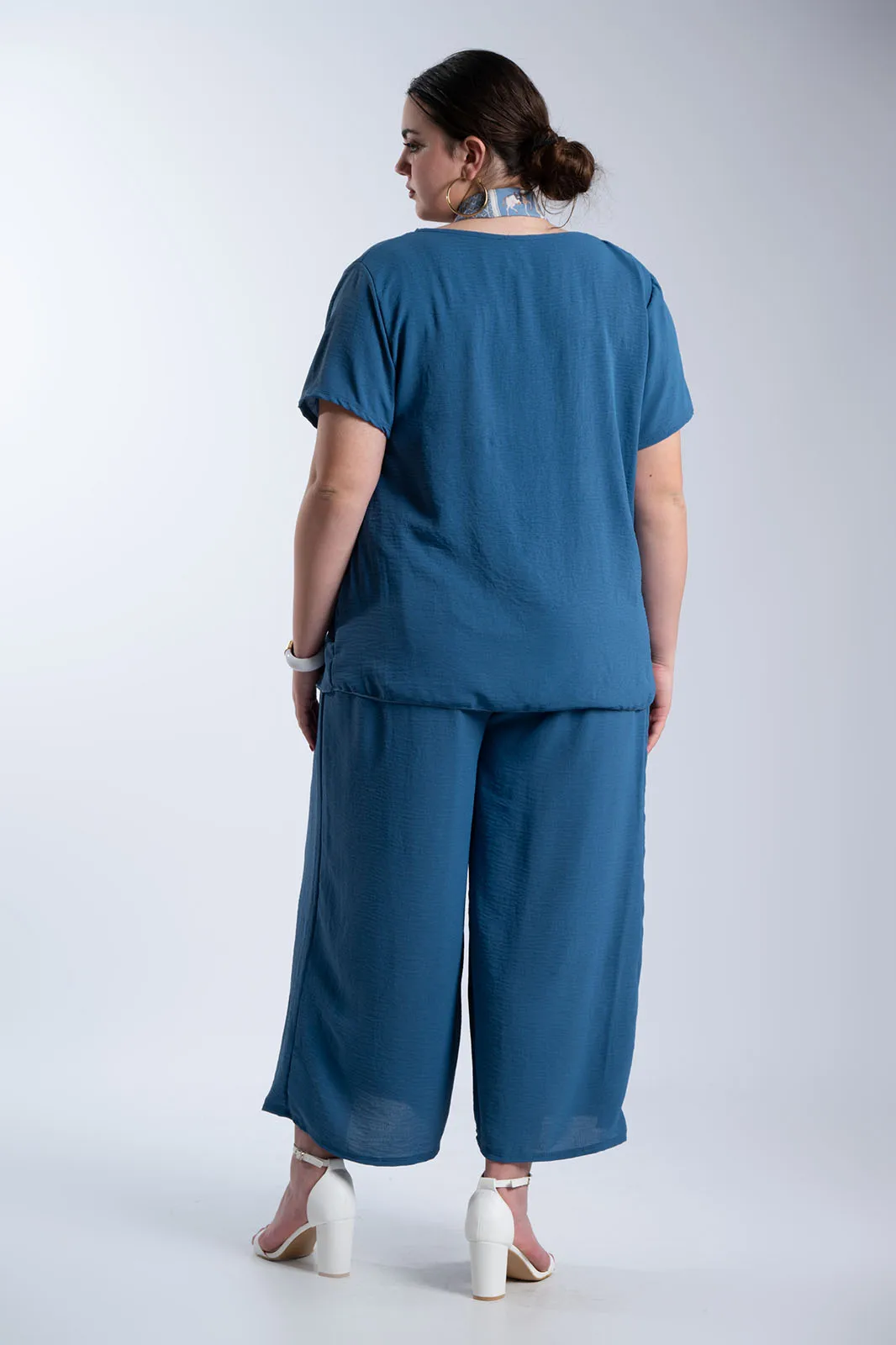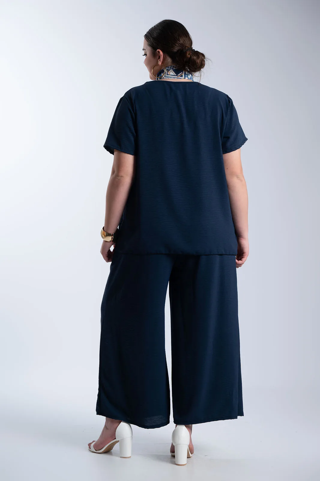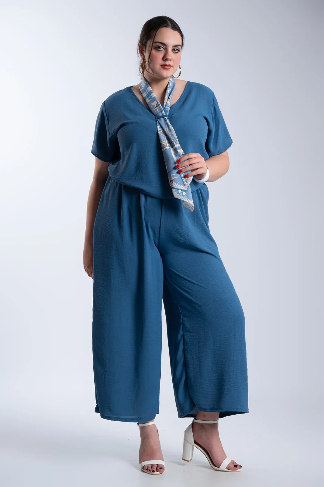 Κομψό και άνετο σετ που αποτελείται από μπλούζα και παντελόνι, ιδανικό για καθημερινές αλλά και πιο προσεγμένες εμφανίσεις. Η μπλούζα διαθέτει λαιμόκοψη V και κοντά μανίκια, προσφέροντας άνετη εφαρμογή και minimal αισθητική. Το διακοσμητικό φουλάρι είναι αποσπώμενο και μπορεί να φορεθεί με διαφορετικούς τρόπους, χαρίζοντας ευελιξία στο styling. Διαθέτει ειδικό θηλάκι στο κάτω μέρος του V ώστε να εφαρμόζει σταθερά και κομψά. Το παντελόνι έχει λάστιχο στη μέση για άνεση και σωστή εφαρμογή, ενώ η ίσια και άνετη γραμμή του το καθιστά ιδανικό για all day looks.