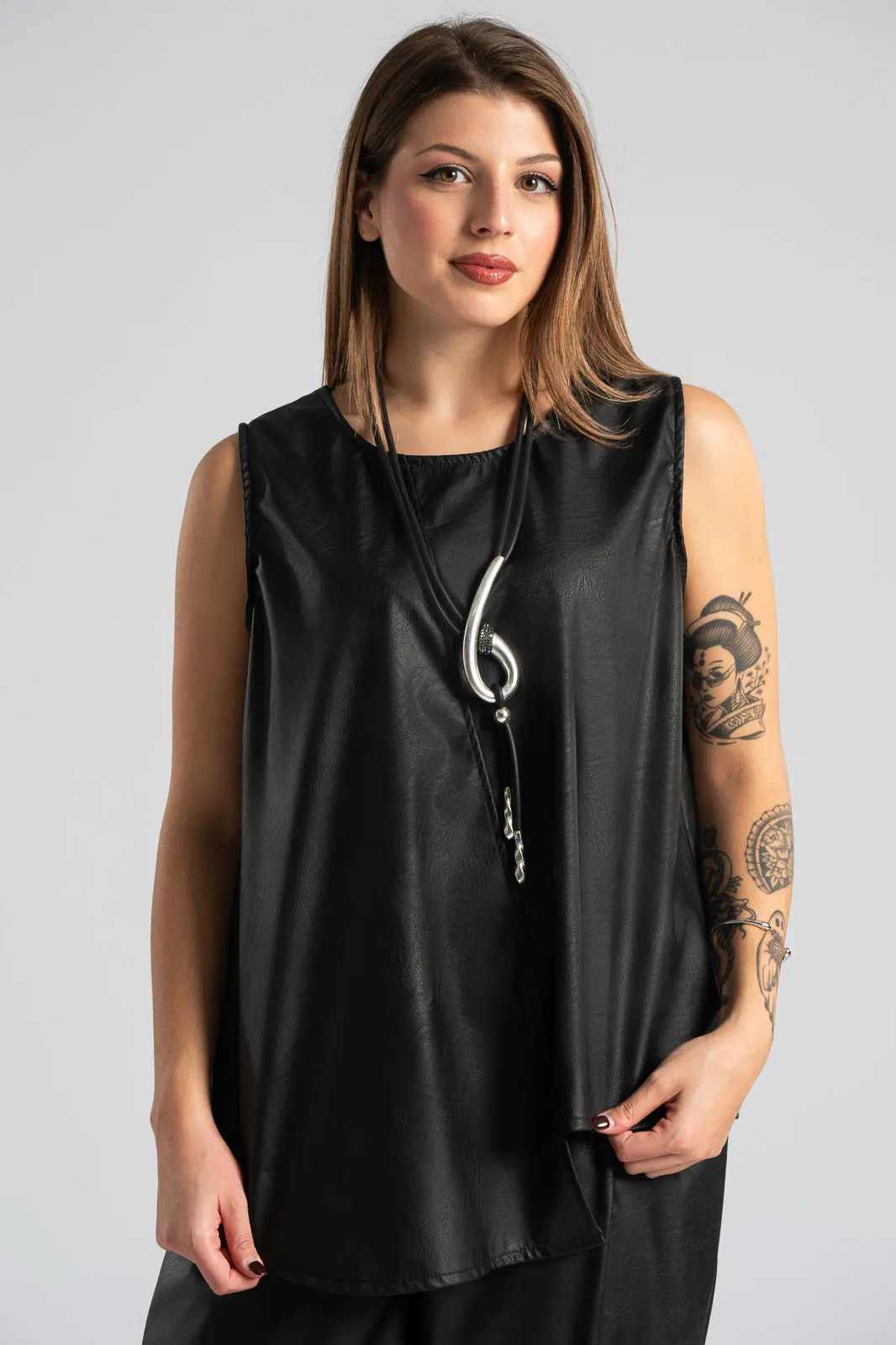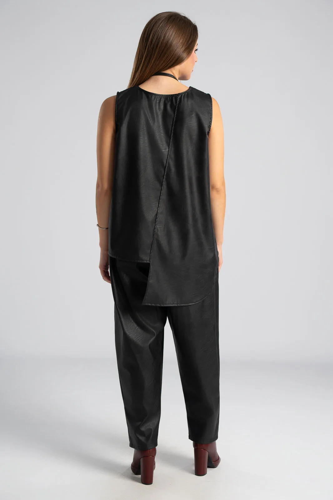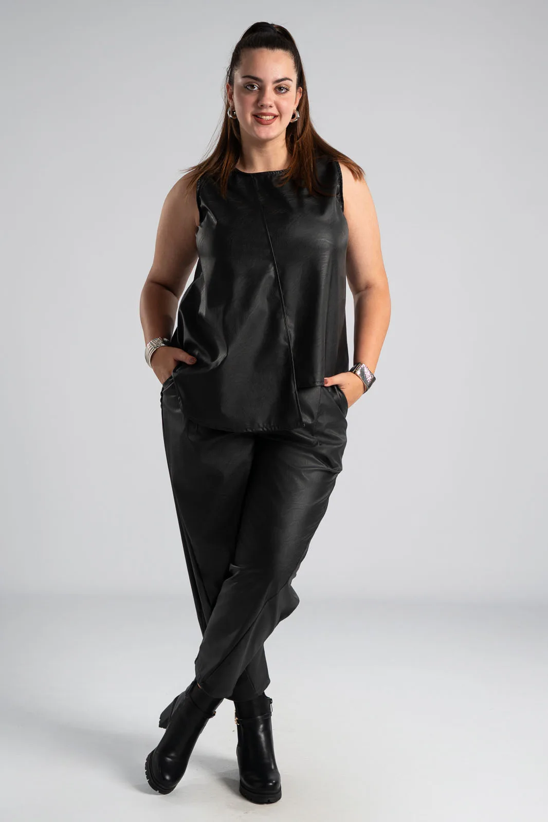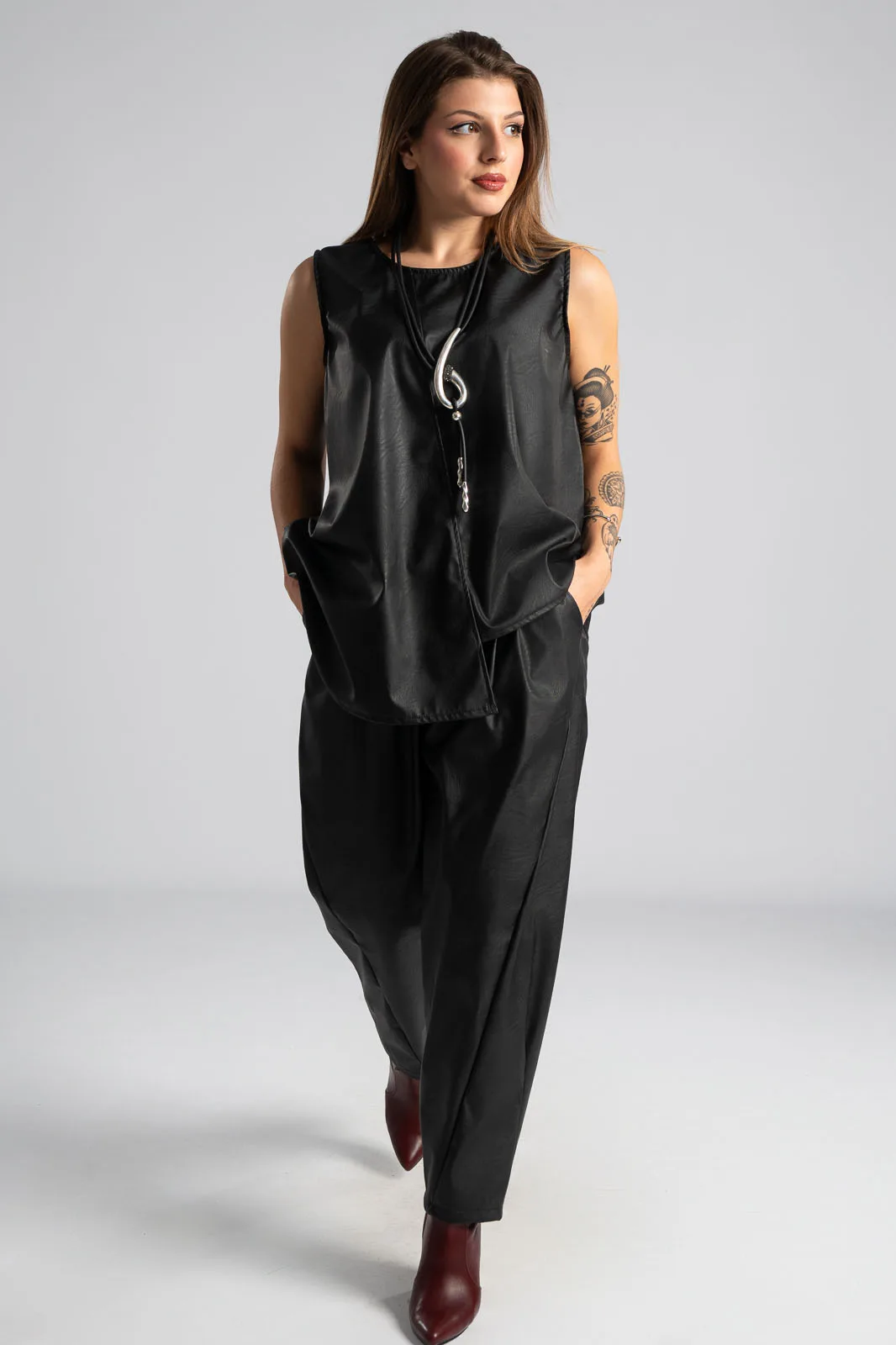 Σετ που αποτελείται από αμάνικη μπλούζα και παντελόνι. Είναι από εξαιρετικής ποιότητας δερματίνη και εσωτερικά είναι επενδυμένο. Η μπλούζα είναι αμάνικη και έχει στρογγυλή λαιμόκοψη. Είναι σε Α γραμμή και είναι ασύμμετρη. Το παντελόνι διαθέτει λάστιχο περιμετρικά για καλύτερη εφαρμογή. Έχει πλαϊνές τσέπες και δεν έχει φερμουάρ. Οι μετρήσεις του πίνακα είναι αντιπροσωπευτικές για κάθε προϊόν. 76% viscose, 19% polyamide, 5% elastan.