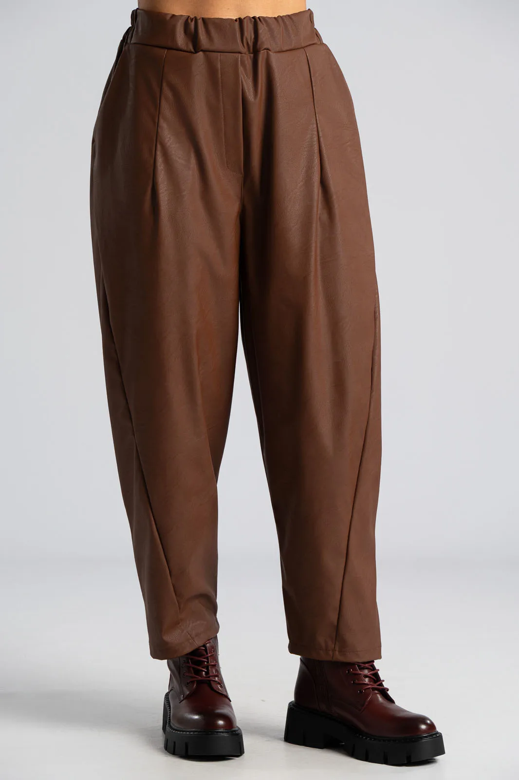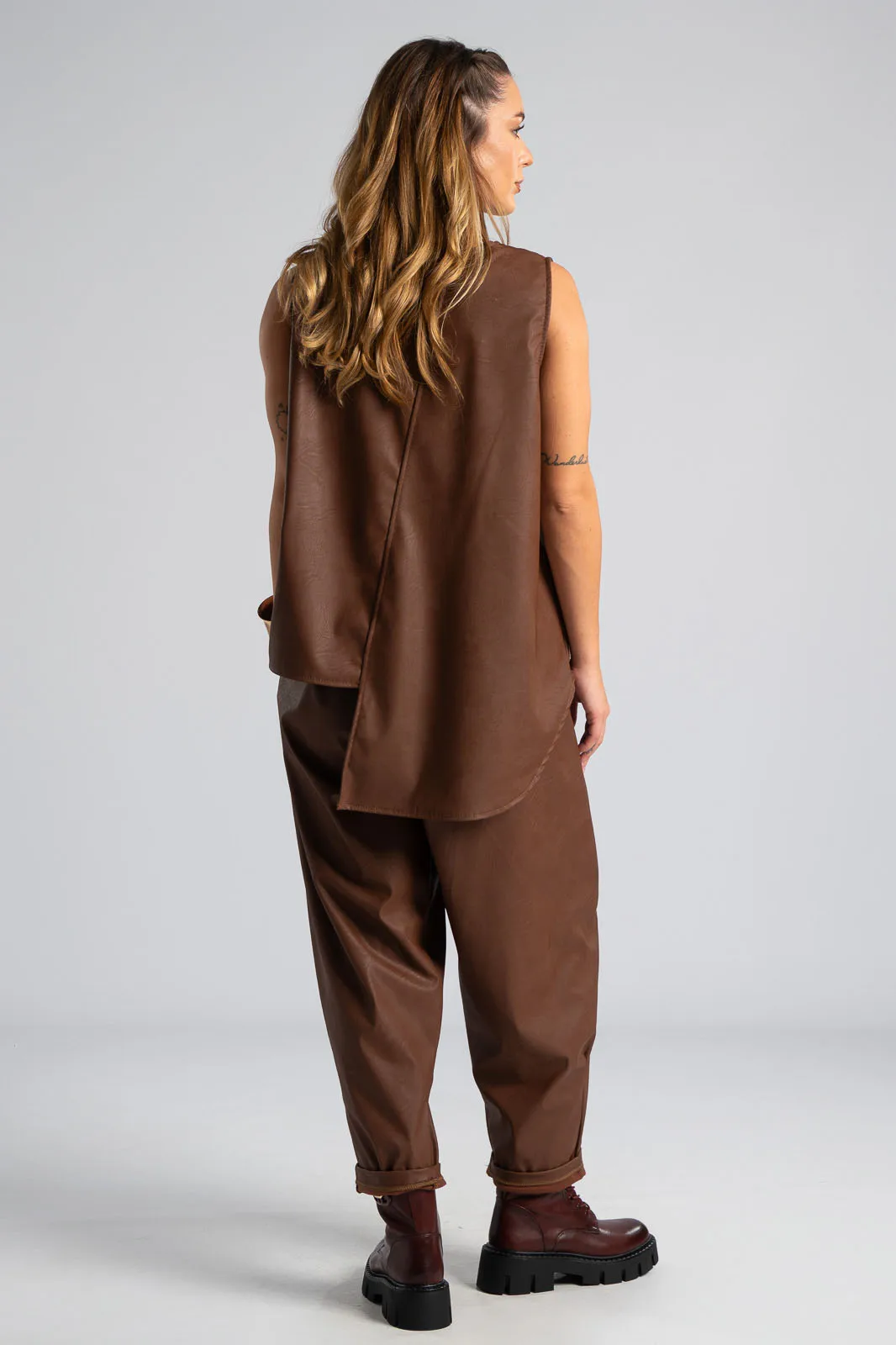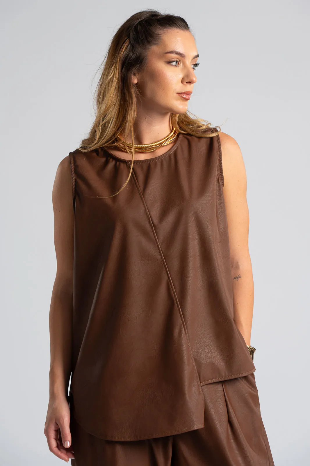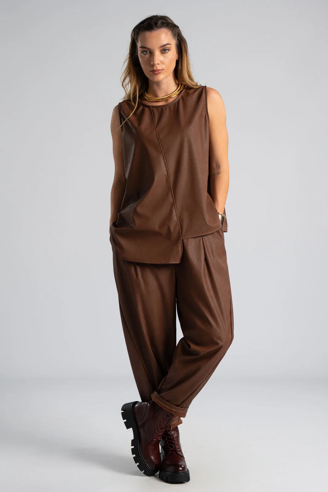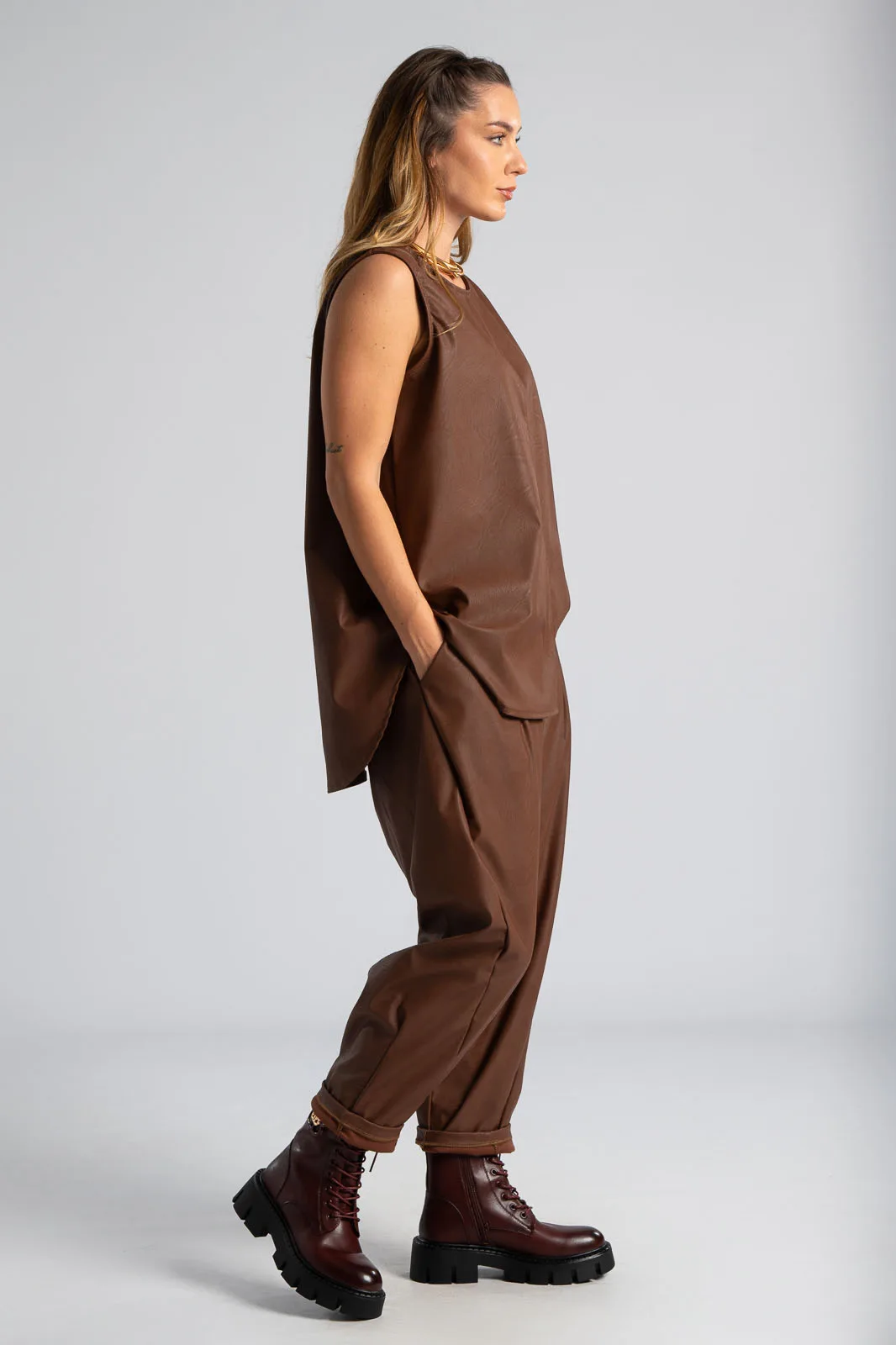 Σετ που αποτελείται από αμάνικη μπλούζα και παντελόνι. Είναι από εξαιρετικής ποιότητας δερματίνη και εσωτερικά είναι επενδυμένο. Η μπλούζα είναι αμάνικη και έχει στρογγυλή λαιμόκοψη. Είναι σε Α γραμμή και είναι ασύμμετρη. Το παντελόνι διαθέτει λάστιχο περιμετρικά για καλύτερη εφαρμογή. Έχει πλαϊνές τσέπες και δεν έχει φερμουάρ. Οι μετρήσεις του πίνακα είναι αντιπροσωπευτικές για κάθε προϊόν. 76% viscose, 19% polyamide, 5% elastan.