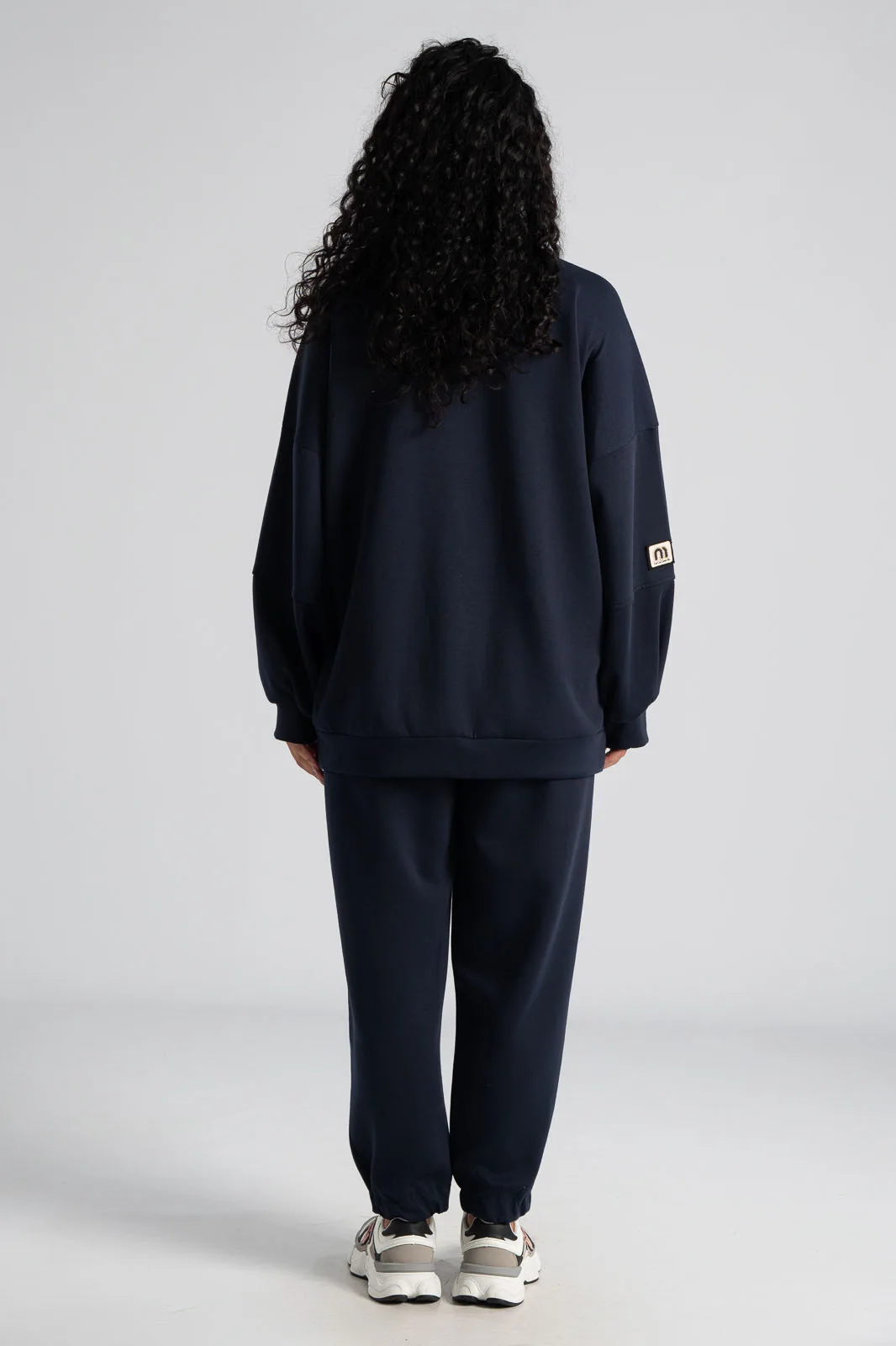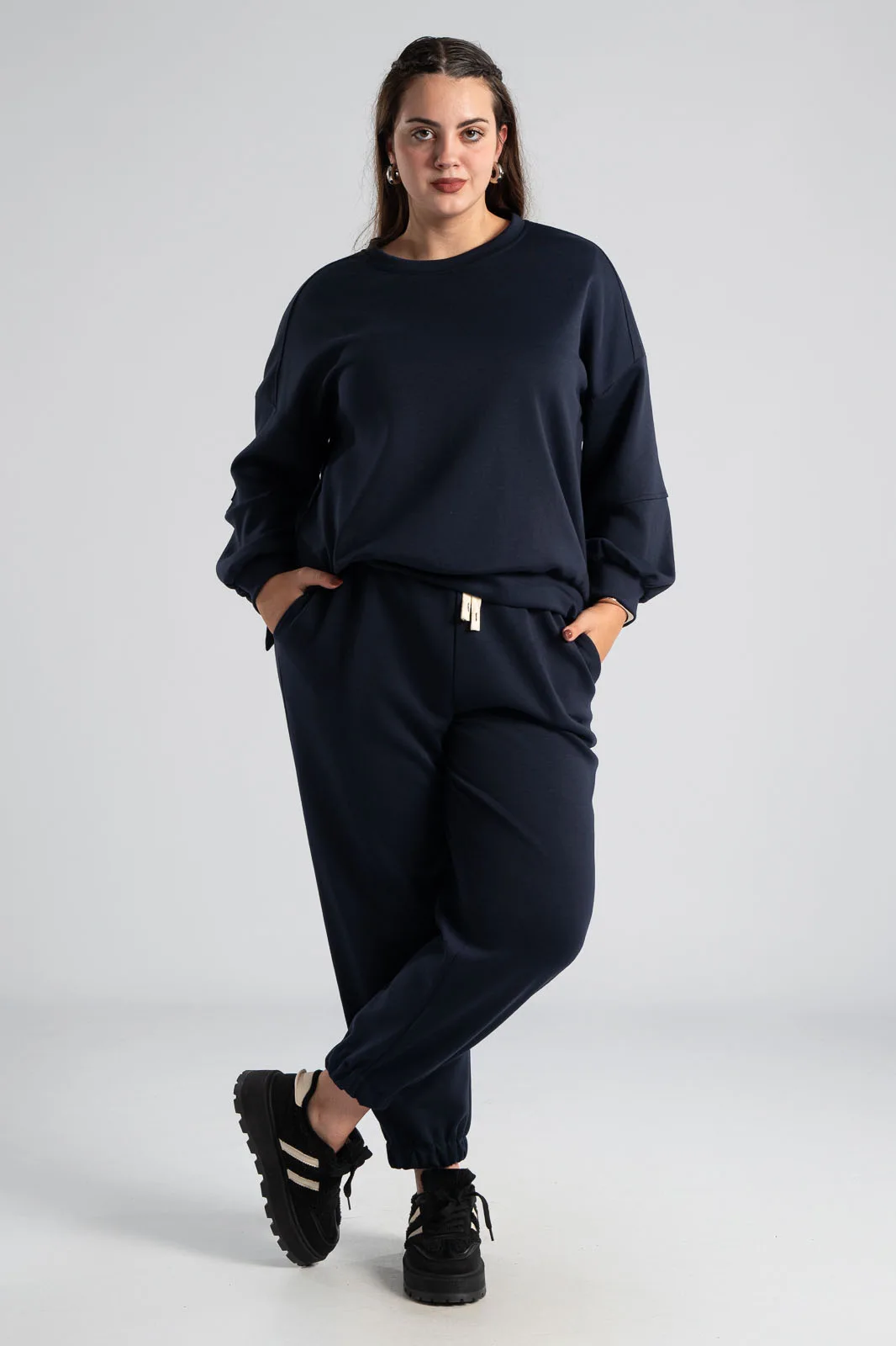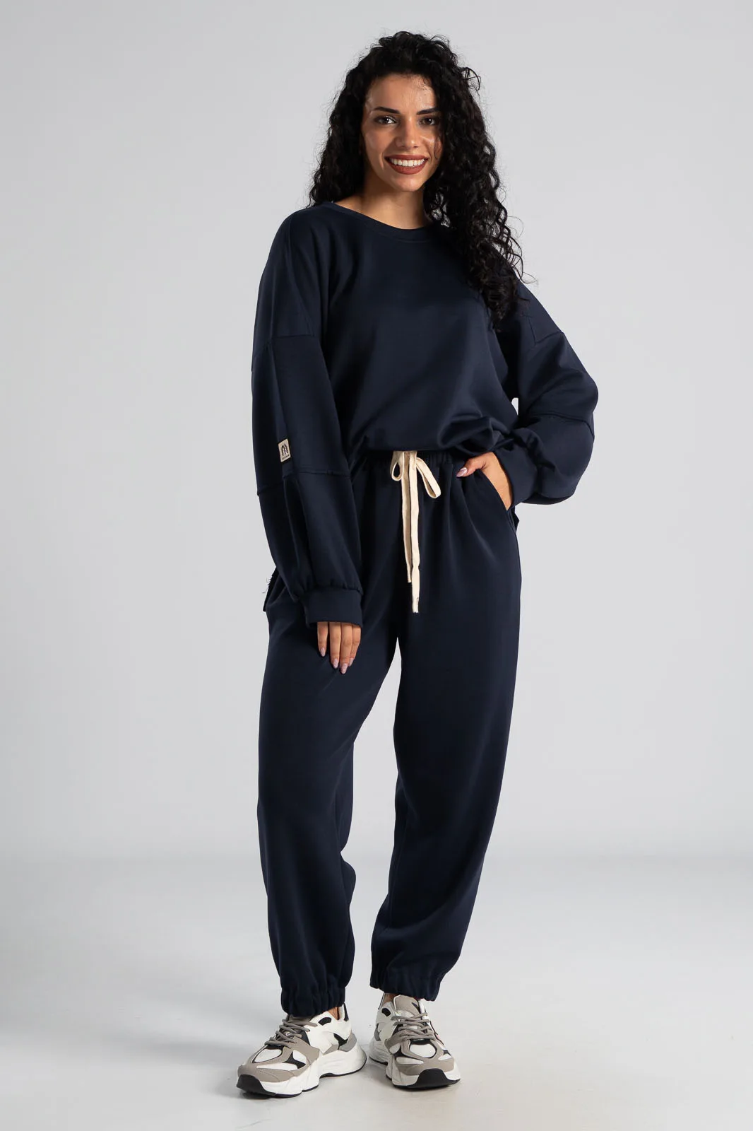 Tracksuit consisting of a blouse and pants in a tracksuit style. The blouse has a round neckline. It has long sleeves and is comfortable. It has a logo on one sleeve. The pants have an elastic waistband and an internal drawstring that you can adjust as you wish. They have pockets on the sides. The hem is elasticated. The measurements in the table are representative for each code. 95% polyester, 5% elastane.